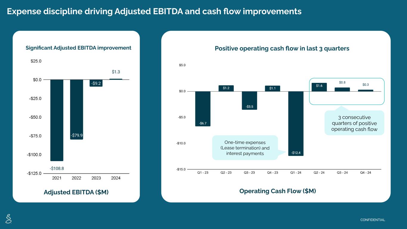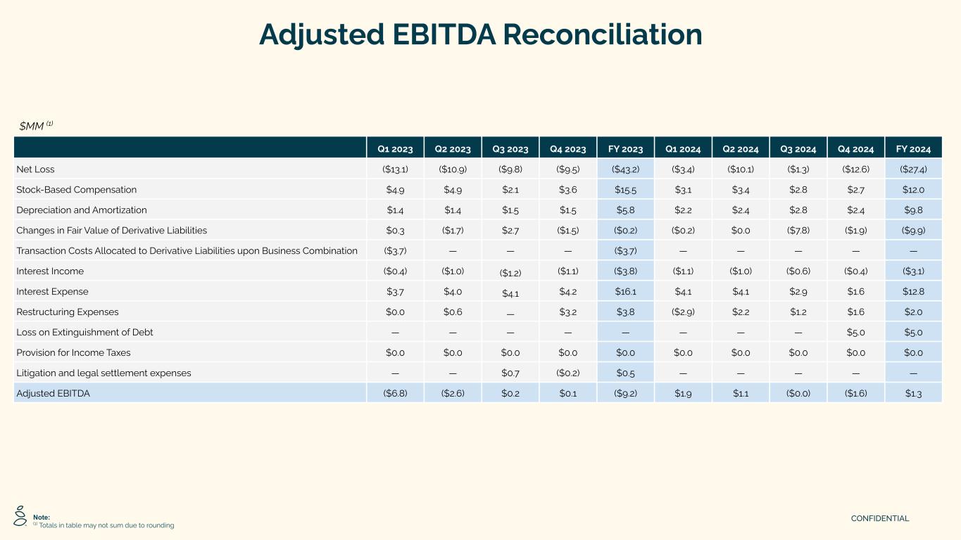 CONFIDENTIAL Adjusted EBITDA Reconciliation $MM (1) Note: (1) Totals in table may not sum due to rounding Q1 2023 Q2 2023 Q3 2023 Q4 2023 FY 2023 Q1 2024 Q2 2024 Q3 2024 Q4 2024 FY 2024 Net Loss ($13.1) ($10.9) ($9.8) ($9.5) ($43.2) ($3.4) ($10.1) ($1.3) ($12.6) ($27.4) Stock-Based Compensation $4.9 $4.9 $2.1 $3.6 $15.5 $3.1 $3.4 $2.8 $2.7 $12.0 Depreciation and Amortization $1.4 $1.4 $1.5 $1.5 $5.8 $2.2 $2.4 $2.8 $2.4 $9.8 Changes in Fair Value of Derivative Liabilities $0.3 ($1.7) $2.7 ($1.5) ($0.2) ($0.2) $0.0 ($7.8) ($1.9) ($9.9) Transaction Costs Allocated to Derivative Liabilities upon Business Combination ($3.7) — — — ($3.7) — — — — — Interest Income ($0.4) ($1.0) ($1.2) ($1.1) ($3.8) ($1.1) ($1.0) ($0.6) ($0.4) ($3.1) Interest Expense $3.7 $4.0 $4.1 $4.2 $16.1 $4.1 $4.1 $2.9 $1.6 $12.8 Restructuring Expenses $0.0 $0.6 — $3.2 $3.8 ($2.9) $2.2 $1.2 $1.6 $2.0 Loss on Extinguishment of Debt — — — — — — — — $5.0 $5.0 Provision for Income Taxes $0.0 $0.0 $0.0 $0.0 $0.0 $0.0 $0.0 $0.0 $0.0 $0.0 Litigation and legal settlement expenses — — $0.7 ($0.2) $0.5 — — — — — Adjusted EBITDA ($6.8) ($2.6) $0.2 $0.1 ($9.2) $1.9 $1.1 ($0.0) ($1.6) $1.3