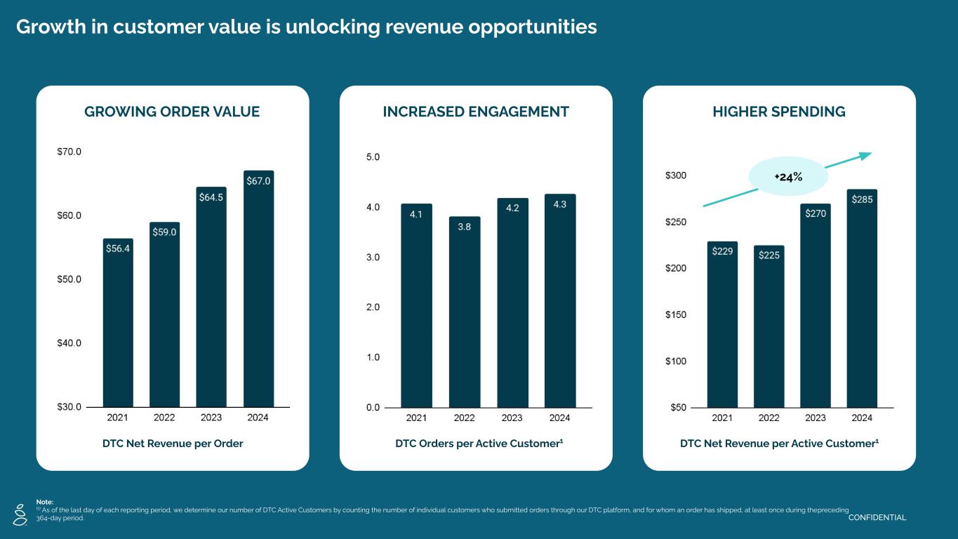 CONFIDENTIAL Growth in customer value is unlocking revenue opportunities GROWING ORDER VALUE Note: (1) As of the last day of each reporting period, we determine our number of DTC Active Customers by counting the number of individual customers who submitted orders through our DTC platform, and for whom an order has shipped, at least once during the preceding 364-day period. DTC Net Revenue per Order INCREASED ENGAGEMENT HIGHER SPENDING +24% DTC Orders per Active Customer1 DTC Net Revenue per Active Customer1