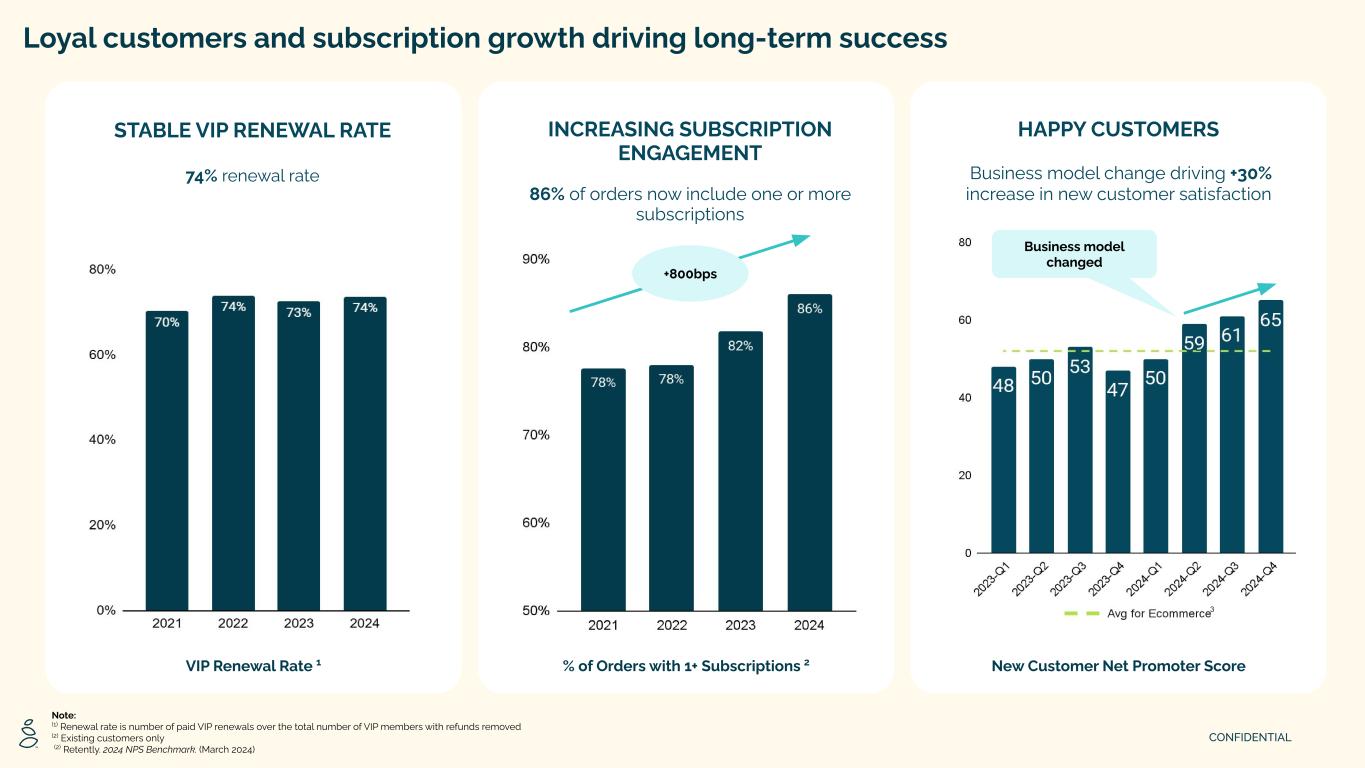CONFIDENTIAL Loyal customers and subscription growth driving long-term success INCREASING SUBSCRIPTION ENGAGEMENT 86% of orders now include one or more subscriptions STABLE VIP RENEWAL RATE 74% renewal rate Note: (1) Renewal rate is number of paid VIP renewals over the total number of VIP members with refunds removed (2) Existing customers only (2) Retently. 2024 NPS Benchmark. (March 2024) % of Orders with 1+ Subscriptions 2 VIP Renewal Rate 1 +800bps New Customer Net Promoter Score 3 HAPPY CUSTOMERS Business model change driving +30% increase in new customer satisfaction Business model changed