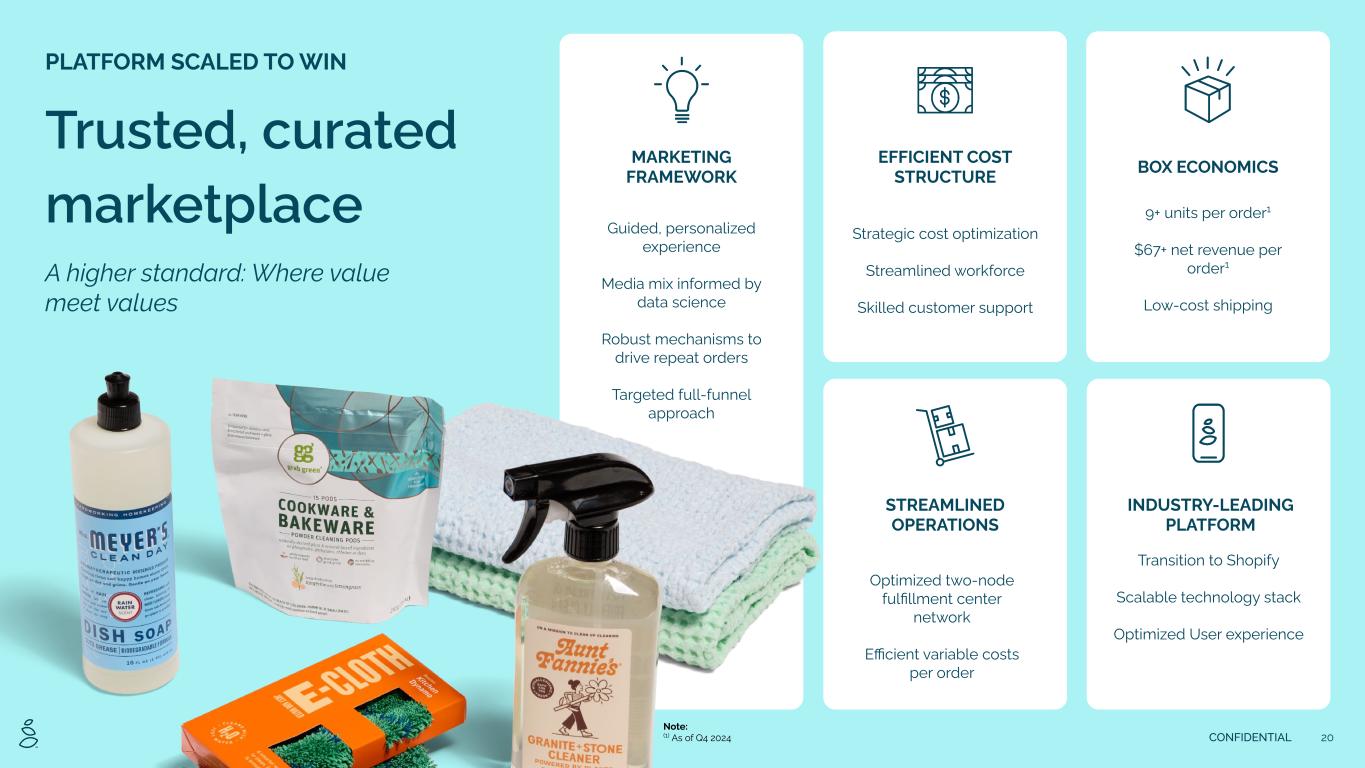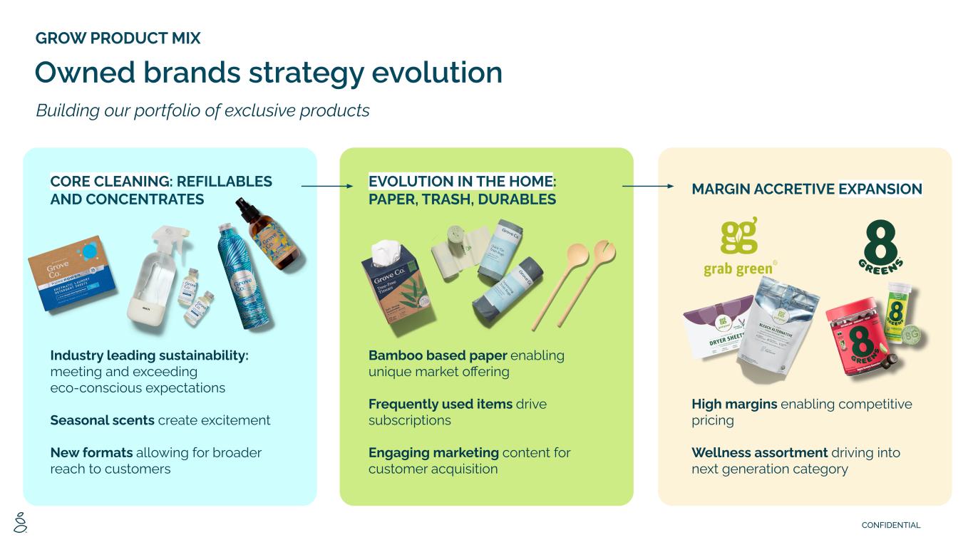 CONFIDENTIAL Owned brands strategy evolution Building our portfolio of exclusive products CORE CLEANING: REFILLABLES AND CONCENTRATES EVOLUTION IN THE HOME: PAPER, TRASH, DURABLES Industry leading sustainability: meeting and exceeding eco-conscious expectations Seasonal scents create excitement New formats allowing for broader reach to customers Bamboo based paper enabling unique market offering Frequently used items drive subscriptions Engaging marketing content for customer acquisition MARGIN ACCRETIVE EXPANSION High margins enabling competitive pricing Wellness assortment driving into next generation category GROW PRODUCT MIX