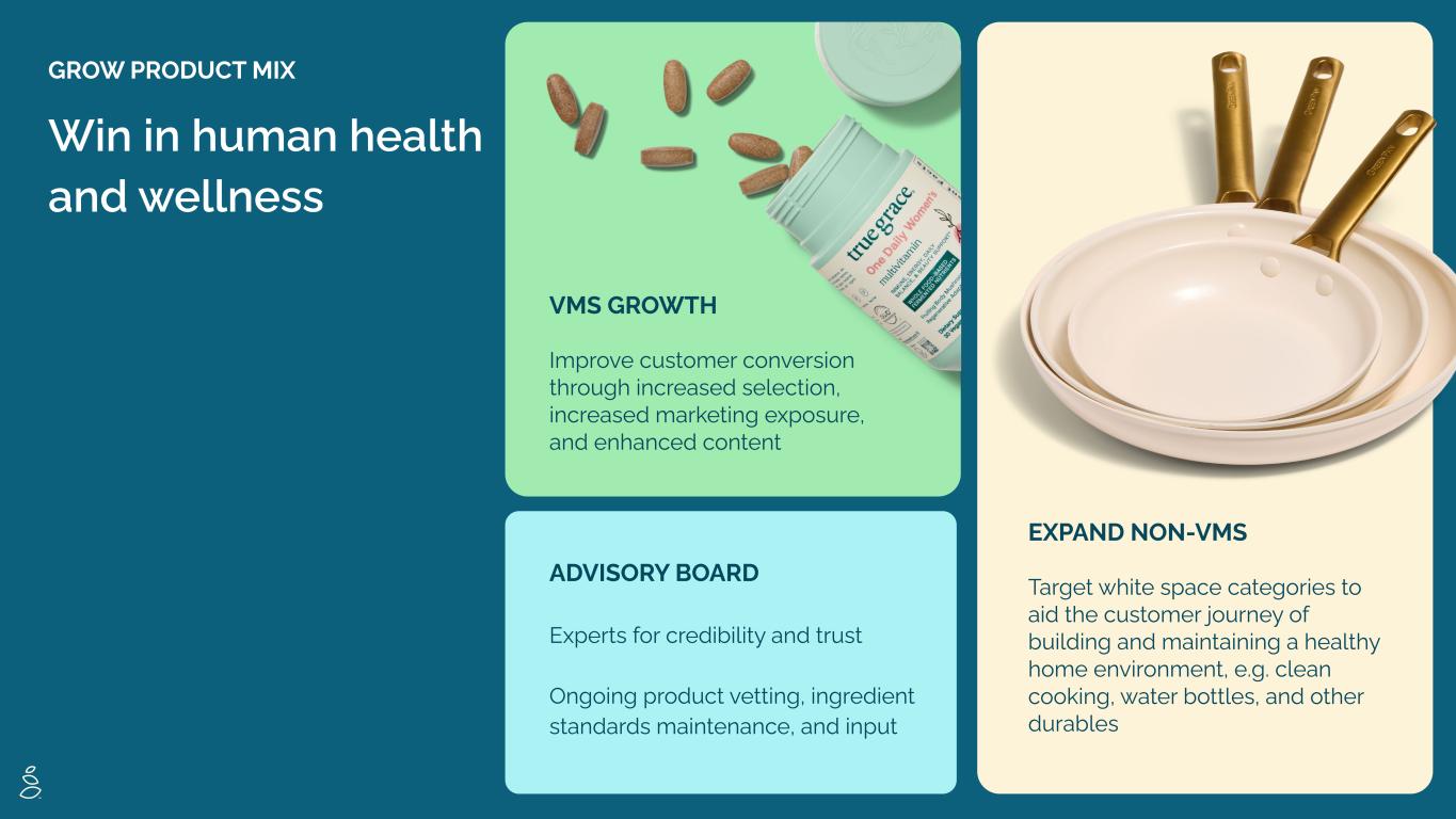 CONFIDENTIAL GROW PRODUCT MIX Win in human health and wellness EXPAND NON-VMS Target white space categories to aid the customer journey of building and maintaining a healthy home environment, e.g. clean cooking, water bottles, and other durables VMS GROWTH Improve customer conversion through increased selection, increased marketing exposure, and enhanced content ADVISORY BOARD Experts for credibility and trust Ongoing product vetting, ingredient standards maintenance, and input