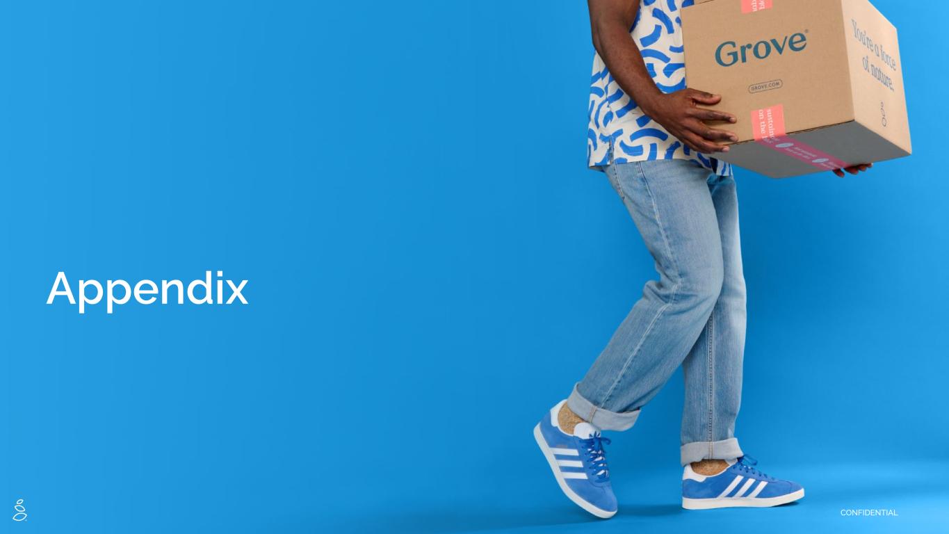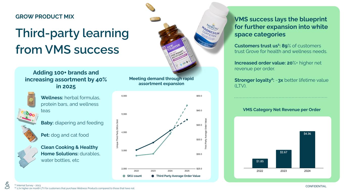 CONFIDENTIAL GROW PRODUCT MIX Third-party learning from VMS success VMS success lays the blueprint for further expansion into white space categories Customers trust us1: 89% of customers trust Grove for health and wellness needs. Increased order value: 20%+ higher net revenue per order. Stronger loyalty2: ~3x better lifetime value (LTV). Wellness: herbal formulas, protein bars, and wellness teas Baby: diapering and feeding Pet: dog and cat food Clean Cooking & Healthy Home Solutions: durables, water bottles, etc VMS Category Net Revenue per Order Meeting demand through rapid assortment expansion Adding 100+ brands and increasing assortment by 40% in 2025 Third Party Average Order ValueSKU count (1) Internal Survey - 2023 (2) 2.7x higher six month LTV for customers that purchase Wellness Products compared to those that have not.