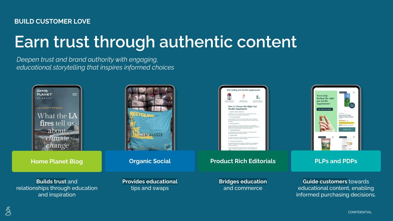 CONFIDENTIAL Builds trust and relationships through education and inspiration Provides educational tips and swaps Bridges education and commerce Guide customers towards educational content, enabling informed purchasing decisions. BUILD CUSTOMER LOVE Earn trust through authentic content Deepen trust and brand authority with engaging, educational storytelling that inspires informed choices Product Rich EditorialsOrganic SocialHome Planet Blog PLPs and PDPs