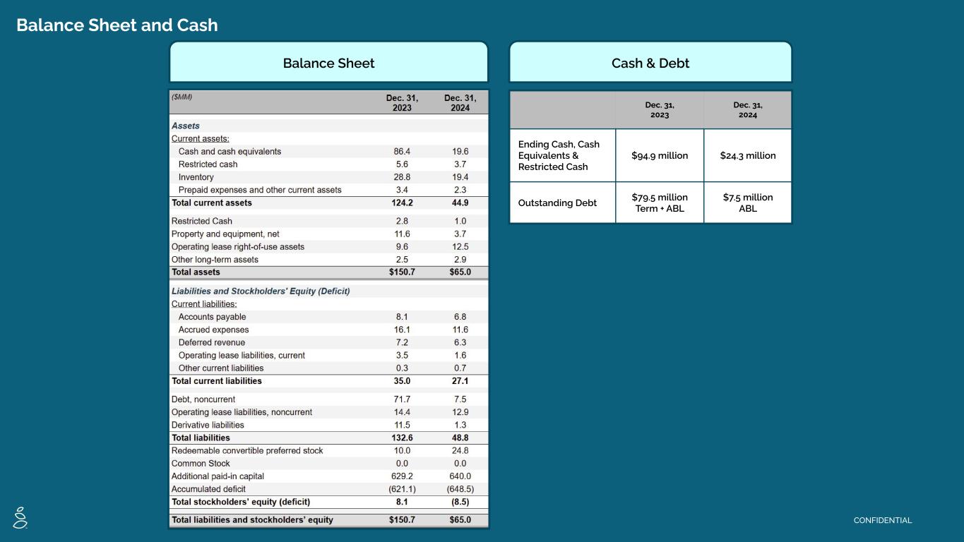 CONFIDENTIAL Balance Sheet and Cash Balance Sheet Dec. 31, 2023 Dec. 31, 2024 Ending Cash, Cash Equivalents & Restricted Cash $94.9 million $24.3 million Outstanding Debt $79.5 million Term + ABL $7.5 million ABL Cash & Debt