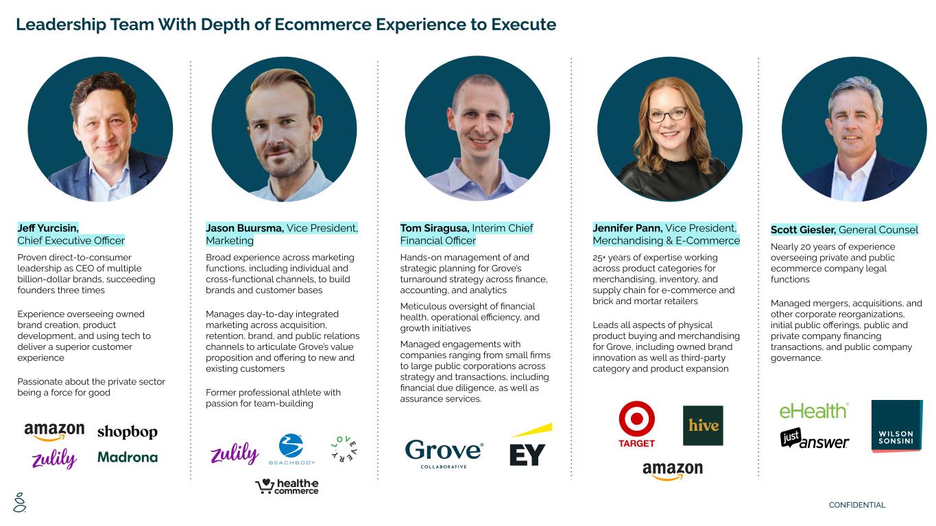 CONFIDENTIAL Jeff Yurcisin, Chief Executive Officer Proven direct-to-consumer leadership as CEO of multiple billion-dollar brands, succeeding founders three times Experience overseeing owned brand creation, product development, and using tech to deliver a superior customer experience Passionate about the private sector being a force for good Tom Siragusa, Interim Chief Financial Officer Hands-on management of and strategic planning for Grove’s turnaround strategy across finance, accounting, and analytics Meticulous oversight of financial health, operational efficiency, and growth initiatives Managed engagements with companies ranging from small firms to large public corporations across strategy and transactions, including financial due diligence, as well as assurance services. Jason Buursma, Vice President, Marketing Broad experience across marketing functions, including individual and cross-functional channels, to build brands and customer bases Manages day-to-day integrated marketing across acquisition, retention, brand, and public relations channels to articulate Grove’s value proposition and offering to new and existing customers Former professional athlete with passion for team-building Scott Giesler, General Counsel Nearly 20 years of experience overseeing private and public ecommerce company legal functions Managed mergers, acquisitions, and other corporate reorganizations, initial public offerings, public and private company financing transactions, and public company governance. Leadership Team With Depth of Ecommerce Experience to Execute Jennifer Pann, Vice President, Merchandising & E-Commerce 25+ years of expertise working across product categories for merchandising, inventory, and supply chain for e-commerce and brick and mortar retailers Leads all aspects of physical product buying and merchandising for Grove, including owned brand innovation as well as third-party category and product expansion