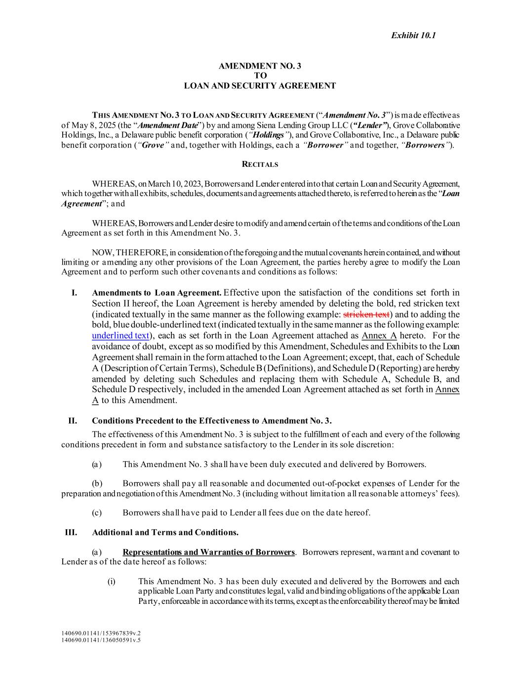 Exhibit 10.1 140690.01141/153967839v.2 140690.01141/136050591v.5 AMENDMENT NO. 3 TO LOAN AND SECURITY AGREEMENT THIS AMENDMENT NO. 3 TO LOAN AND SECURITY AGREEMENT (“Amendment No. 3”) is made effective as of May 8, 2025 (the “Amendment Date”) by and among Siena Lending Group LLC (“Lender”), Grove Collaborative Holdings, Inc., a Delaware public benefit corporation (“Holdings”), and Grove Collaborative, Inc., a Delaware public benefit corporation (“Grove” and, together with Holdings, each a “Borrower” and together, “Borrowers”). RECITALS WHEREAS, on March 10, 2023, Borrowers and Lender entered into that certain Loan and Security Agreement, which together with all exhibits, schedules, documents and agreements attached thereto, is referred to herein as the “Loan Agreement”; and WHEREAS, Borrowers and Lender desire to modify and amend certain of the terms and conditions of the Loan Agreement as set forth in this Amendment No. 3. NOW, THEREFORE, in consideration of the foregoing and the mutual covenants herein contained, and without limiting or amending any other provisions of the Loan Agreement, the parties hereby agree to modify the Loan Agreement and to perform such other covenants and conditions as follows: I. Amendments to Loan Agreement. Effective upon the satisfaction of the conditions set forth in Section II hereof, the Loan Agreement is hereby amended by deleting the bold, red stricken text (indicated textually in the same manner as the following example: stricken text) and to adding the bold, blue double-underlined text (indicated textually in the same manner as the following example: underlined text), each as set forth in the Loan Agreement attached as Annex A hereto. For the avoidance of doubt, except as so modified by this Amendment, Schedules and Exhibits to the Loan Agreement shall remain in the form attached to the Loan Agreement; except, that, each of Schedule A (Description of Certain Terms), Schedule B (Definitions), and Schedule D (Reporting) are hereby amended by deleting such Schedules and replacing them with Schedule A, Schedule B, and Schedule D respectively, included in the amended Loan Agreement attached as set forth in Annex A to this Amendment. II. Conditions Precedent to the Effectiveness to Amendment No. 3. The effectiveness of this Amendment No. 3 is subject to the fulfillment of each and every of the following conditions precedent in form and substance satisfactory to the Lender in its sole discretion: (a) This Amendment No. 3 shall have been duly executed and delivered by Borrowers. (b) Borrowers shall pay all reasonable and documented out-of-pocket expenses of Lender for the preparation and negotiation of this Amendment No. 3 (including without limitation all reasonable attorneys’ fees). (c) Borrowers shall have paid to Lender all fees due on the date hereof. III. Additional and Terms and Conditions. (a) Representations and Warranties of Borrowers. Borrowers represent, warrant and covenant to Lender as of the date hereof as follows: (i) This Amendment No. 3 has been duly executed and delivered by the Borrowers and each applicable Loan Party and constitutes legal, valid and binding obligations of the applicable Loan Party, enforceable in accordance with its terms, except as the enforceability thereof may be limited