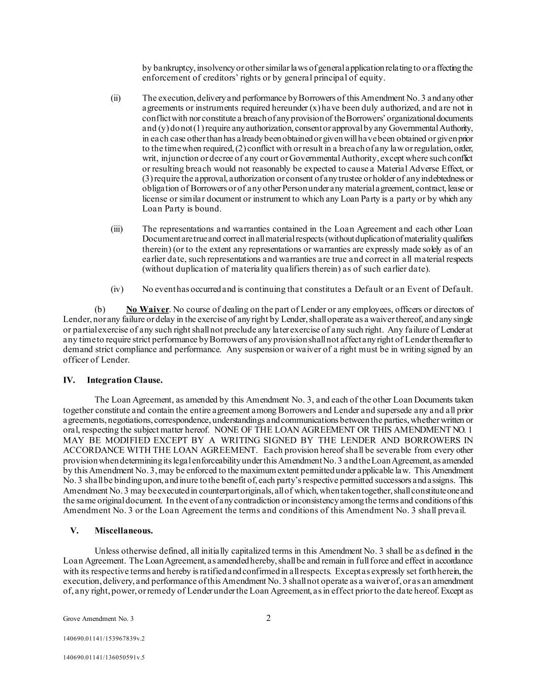 Grove Amendment No. 3 2 140690.01141/153967839v.2 140690.01141/136050591v.5 by bankruptcy, insolvency or other similar laws of general application relating to or affecting the enforcement of creditors’ rights or by general principal of equity. (ii) The execution, delivery and performance by Borrowers of this Amendment No. 3 and any other agreements or instruments required hereunder (x) have been duly authorized, and are not in conflict with nor constitute a breach of any provision of the Borrowers’ organizational documents and (y) do not (1) require any authorization, consent or approval by any Governmental Authority, in each case other than has already been obtained or given will have been obtained or given prior to the time when required, (2) conflict with or result in a breach of any law or regulation, order, writ, injunction or decree of any court or Governmental Authority, except where such conflict or resulting breach would not reasonably be expected to cause a Material Adverse Effect, or (3) require the approval, authorization or consent of any trustee or holder of any indebtedness or obligation of Borrowers or of any other Person under any material agreement, contract, lease or license or similar document or instrument to which any Loan Party is a party or by which any Loan Party is bound. (iii) The representations and warranties contained in the Loan Agreement and each other Loan Document are true and correct in all material respects (without duplication of materiality qualifiers therein) (or to the extent any representations or warranties are expressly made solely as of an earlier date, such representations and warranties are true and correct in all material respects (without duplication of materiality qualifiers therein) as of such earlier date). (iv) No event has occurred and is continuing that constitutes a Default or an Event of Default. (b) No Waiver. No course of dealing on the part of Lender or any employees, officers or directors of Lender, nor any failure or delay in the exercise of any right by Lender, shall operate as a waiver thereof, and any single or partial exercise of any such right shall not preclude any later exercise of any such right. Any failure of Lender at any time to require strict performance by Borrowers of any provision shall not affect any right of Lender thereafter to demand strict compliance and performance. Any suspension or waiver of a right must be in writing signed by an officer of Lender. IV. Integration Clause. The Loan Agreement, as amended by this Amendment No. 3, and each of the other Loan Documents taken together constitute and contain the entire agreement among Borrowers and Lender and supersede any and all prior agreements, negotiations, correspondence, understandings and communications between the parties, whether written or oral, respecting the subject matter hereof. NONE OF THE LOAN AGREEMENT OR THIS AMENDMENT NO. 1 MAY BE MODIFIED EXCEPT BY A WRITING SIGNED BY THE LENDER AND BORROWERS IN ACCORDANCE WITH THE LOAN AGREEMENT. Each provision hereof shall be severable from every other provision when determining its legal enforceability under this Amendment No. 3 and the Loan Agreement, as amended by this Amendment No. 3, may be enforced to the maximum extent permitted under applicable law. This Amendment No. 3 shall be binding upon, and inure to the benefit of, each party’s respective permitted successors and assigns. This Amendment No. 3 may be executed in counterpart originals, all of which, when taken together, shall constitute one and the same original document. In the event of any contradiction or inconsistency among the terms and conditions of this Amendment No. 3 or the Loan Agreement the terms and conditions of this Amendment No. 3 shall prevail. V. Miscellaneous. Unless otherwise defined, all initially capitalized terms in this Amendment No. 3 shall be as defined in the Loan Agreement. The Loan Agreement, as amended hereby, shall be and remain in full force and effect in accordance with its respective terms and hereby is ratified and confirmed in all respects. Except as expressly set forth herein, the execution, delivery, and performance of this Amendment No. 3 shall not operate as a waiver of, or as an amendment of, any right, power, or remedy of Lender under the Loan Agreement, as in effect prior to the date hereof. Except as