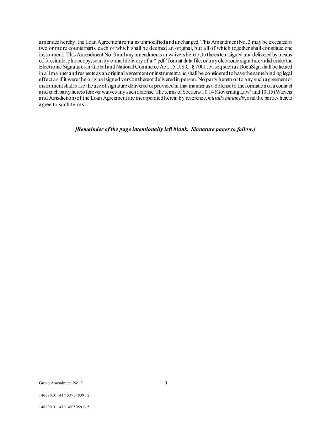 Grove Amendment No. 3 3 140690.01141/153967839v.2 140690.01141/136050591v.5 amended hereby, the Loan Agreement remains unmodified and unchanged. This Amendment No. 3 may be executed in two or more counterparts, each of which shall be deemed an original, but all of which together shall constitute one instrument. This Amendment No. 3 and any amendments or waivers hereto, to the extent signed and delivered by means of facsimile, photocopy, scan by e-mail delivery of a “.pdf” format data file, or any electronic signature valid under the Electronic Signatures in Global and National Commerce Act, 15 U.S.C. § 7001, et. seq such as DocuSign shall be treated in all manner and respects as an original agreement or instrument and shall be considered to have the same binding legal effect as if it were the original signed version thereof delivered in person. No party hereto or to any such agreement or instrument shall raise the use of signature delivered or provided in that manner as a defense to the formation of a contract and each party hereto forever waives any such defense. The terms of Sections 10.14 (Governing Law) and 10.15 (Waivers and Jurisdiction) of the Loan Agreement are incorporated herein by reference, mutatis mutandis, and the parties hereto agree to such terms. [Remainder of the page intentionally left blank. Signature pages to follow.]