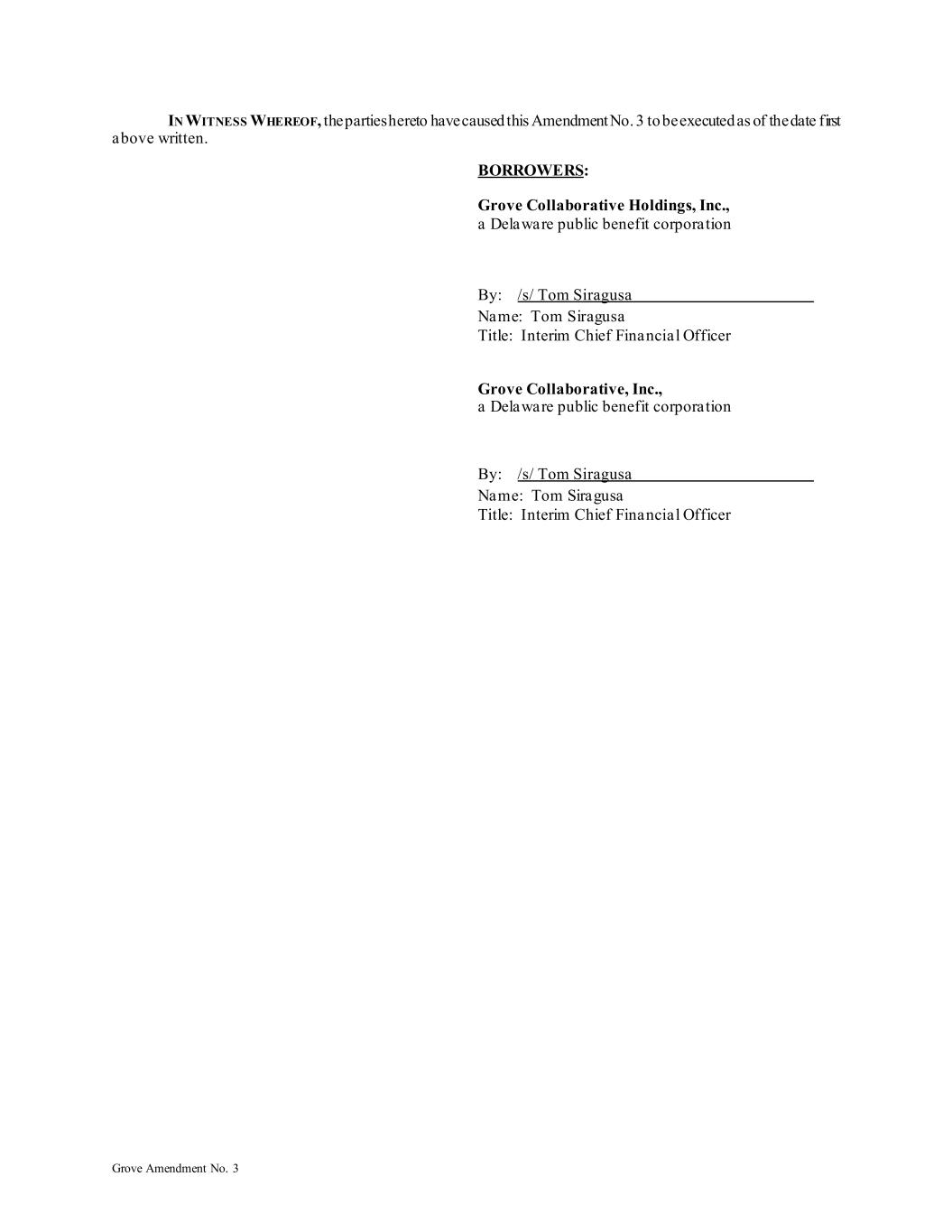 Grove Amendment No. 3 IN WITNESS WHEREOF, the parties hereto have caused this Amendment No. 3 to be executed as of the date first above written. BORROWERS: Grove Collaborative Holdings, Inc., a Delaware public benefit corporation By: /s/ Tom Siragusa Name: Tom Siragusa Title: Interim Chief Financial Officer Grove Collaborative, Inc., a Delaware public benefit corporation By: /s/ Tom Siragusa Name: Tom Siragusa Title: Interim Chief Financial Officer