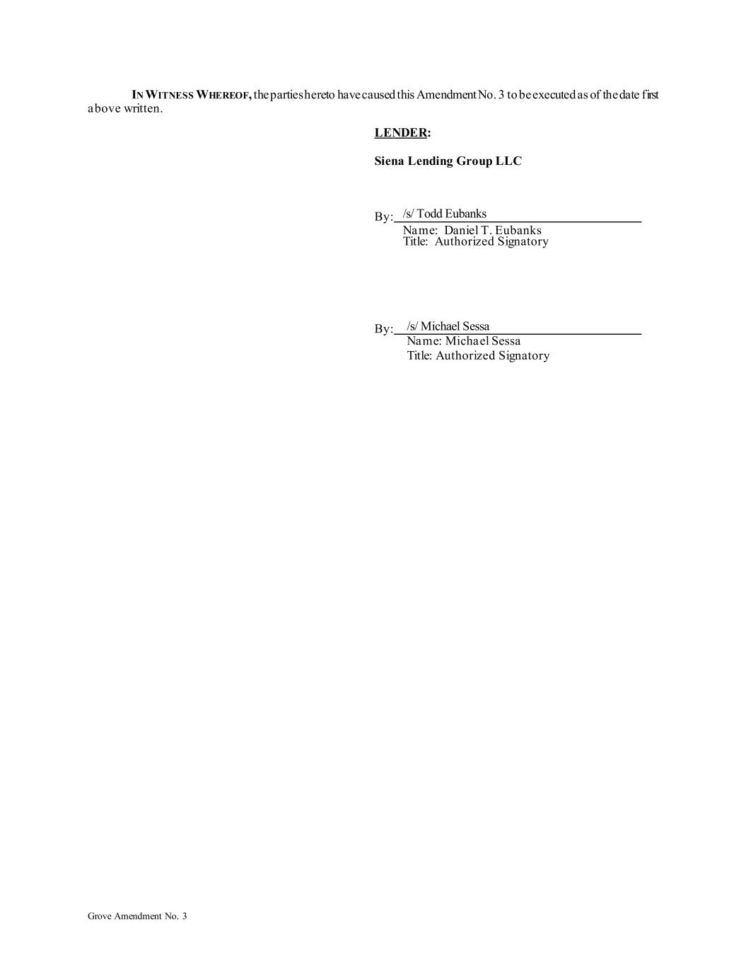 Grove Amendment No. 3 IN WITNESS WHEREOF, the parties hereto have caused this Amendment No. 3 to be executed as of the date first above written. LENDER: Siena Lending Group LLC By: /s/ Todd Eubanks Name: Daniel T. Eubanks Title: Authorized Signatory By: /s/ Michael Sessa Name: Michael Sessa Title: Authorized Signatory