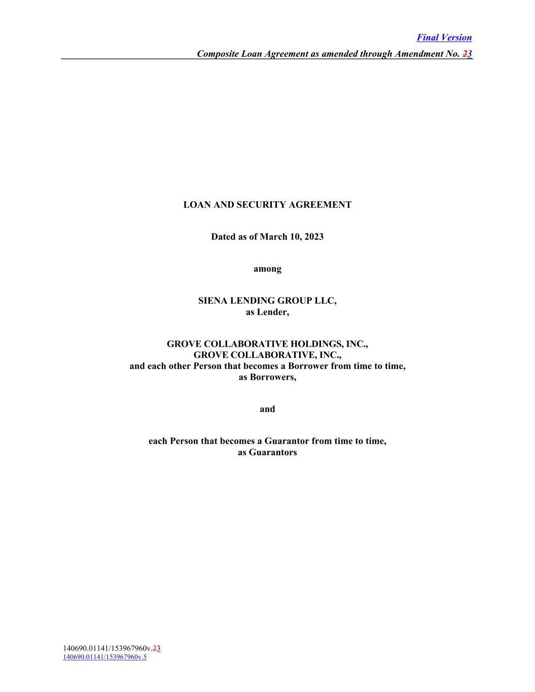Final Version Composite Loan Agreement as amended through Amendment No. 23 LOAN AND SECURITY AGREEMENT Dated as of March 10, 2023 among SIENA LENDING GROUP LLC, as Lender, GROVE COLLABORATIVE HOLDINGS, INC., GROVE COLLABORATIVE, INC., and each other Person that becomes a Borrower from time to time, as Borrowers, and each Person that becomes a Guarantor from time to time, as Guarantors 140690.01141/153967960v.23 140690.01141/153967960v.5