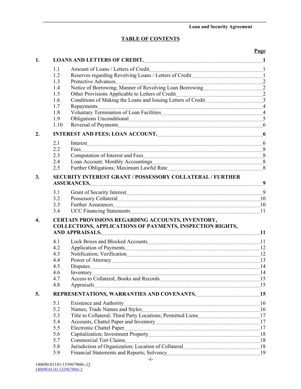 Loan and Security Agreement TABLE OF CONTENTS Page 1. LOANS AND LETTERS OF CREDIT. 1 1.1 Amount of Loans / Letters of Credit 1 1.2 Reserves regarding Revolving Loans / Letters of Credit 1 1.3 Protective Advances 2 1.4 Notice of Borrowing; Manner of Revolving Loan Borrowing 2 1.5 Other Provisions Applicable to Letters of Credit 2 1.6 Conditions of Making the Loans and Issuing Letters of Credit 3 1.7 Repayments 4 1.8 Voluntary Termination of Loan Facilities 4 1.9 Obligations Unconditional 5 1.10 Reversal of Payments 6 2. INTEREST AND FEES; LOAN ACCOUNT. 6 2.1 Interest 6 2.2 Fees 8 2.3 Computation of Interest and Fees 8 2.4 Loan Account; Monthly Accountings 8 2.5 Further Obligations; Maximum Lawful Rate 8 3. SECURITY INTEREST GRANT / POSSESSORY COLLATERAL / FURTHER ASSURANCES. 9 3.1 Grant of Security Interest 9 3.2 Possessory Collateral 10 3.3 Further Assurances 10 3.4 UCC Financing Statements 11 4. CERTAIN PROVISIONS REGARDING ACCOUNTS, INVENTORY, COLLECTIONS, APPLICATIONS OF PAYMENTS, INSPECTION RIGHTS, AND APPRAISALS. 11 4.1 Lock Boxes and Blocked Accounts 11 4.2 Application of Payments 12 4.3 Notification; Verification 12 4.4 Power of Attorney 13 4.5 Disputes 14 4.6 Inventory 14 4.7 Access to Collateral, Books and Records 15 4.8 Appraisals 15 5. REPRESENTATIONS, WARRANTIES AND COVENANTS. 15 5.1 Existence and Authority 16 5.2 Names; Trade Names and Styles 16 5.3 Title to Collateral; Third Party Locations; Permitted Liens 17 5.4 Accounts, Chattel Paper and Inventory 17 5.5 Electronic Chattel Paper 17 5.6 Capitalization; Investment Property 18 5.7 Commercial Tort Claims 18 5.8 Jurisdiction of Organization; Location of Collateral 18 5.9 Financial Statements and Reports; Solvency 19 -i- 140690.01141/153967960v.23 140690.01141/153967960v.5