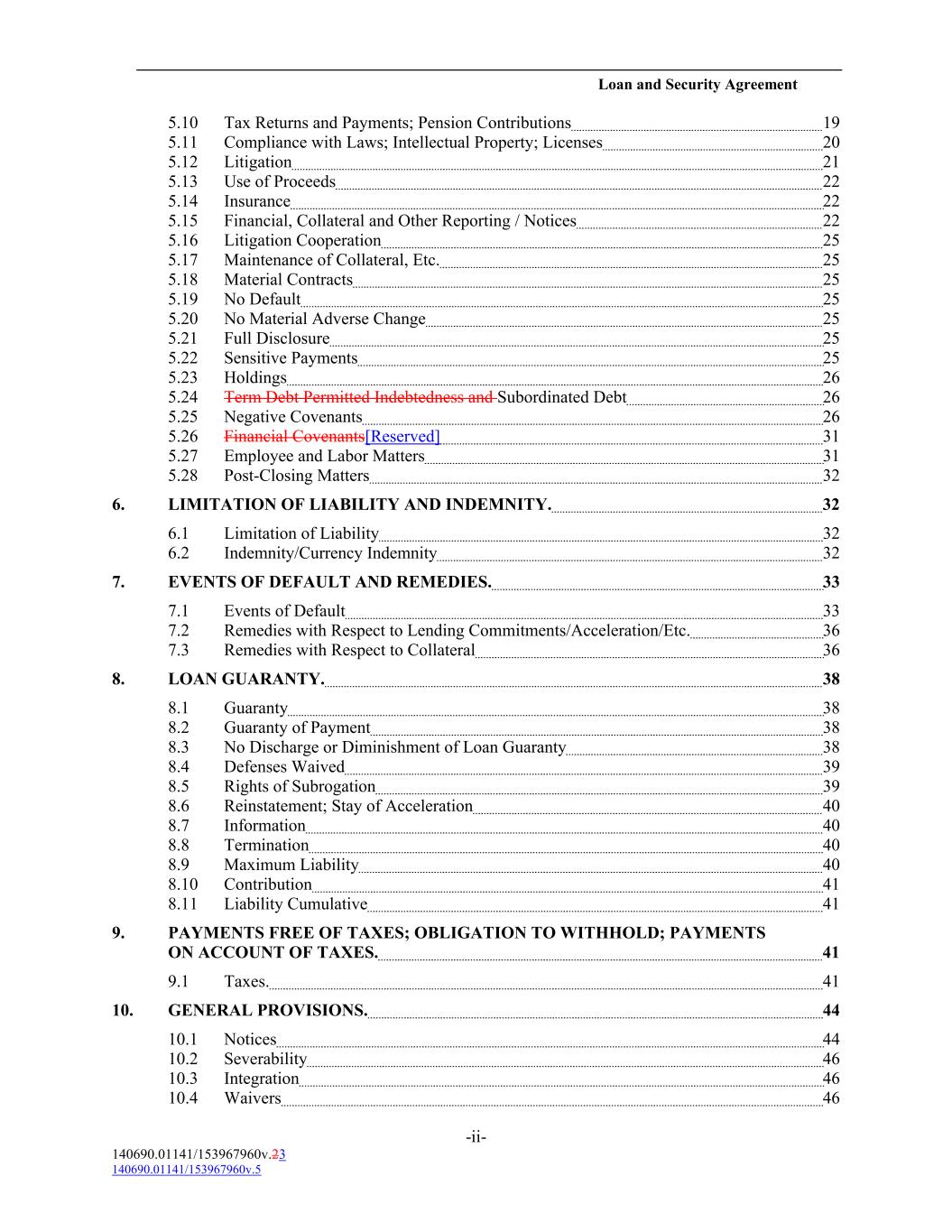 Loan and Security Agreement 5.10 Tax Returns and Payments; Pension Contributions 19 5.11 Compliance with Laws; Intellectual Property; Licenses 20 5.12 Litigation 21 5.13 Use of Proceeds 22 5.14 Insurance 22 5.15 Financial, Collateral and Other Reporting / Notices 22 5.16 Litigation Cooperation 25 5.17 Maintenance of Collateral, Etc. 25 5.18 Material Contracts 25 5.19 No Default 25 5.20 No Material Adverse Change 25 5.21 Full Disclosure 25 5.22 Sensitive Payments 25 5.23 Holdings 26 5.24 Term Debt Permitted Indebtedness and Subordinated Debt 26 5.25 Negative Covenants 26 5.26 Financial Covenants[Reserved] 31 5.27 Employee and Labor Matters 31 5.28 Post-Closing Matters 32 6. LIMITATION OF LIABILITY AND INDEMNITY. 32 6.1 Limitation of Liability 32 6.2 Indemnity/Currency Indemnity 32 7. EVENTS OF DEFAULT AND REMEDIES. 33 7.1 Events of Default 33 7.2 Remedies with Respect to Lending Commitments/Acceleration/Etc. 36 7.3 Remedies with Respect to Collateral 36 8. LOAN GUARANTY. 38 8.1 Guaranty 38 8.2 Guaranty of Payment 38 8.3 No Discharge or Diminishment of Loan Guaranty 38 8.4 Defenses Waived 39 8.5 Rights of Subrogation 39 8.6 Reinstatement; Stay of Acceleration 40 8.7 Information 40 8.8 Termination 40 8.9 Maximum Liability 40 8.10 Contribution 41 8.11 Liability Cumulative 41 9. PAYMENTS FREE OF TAXES; OBLIGATION TO WITHHOLD; PAYMENTS ON ACCOUNT OF TAXES. 41 9.1 Taxes. 41 10. GENERAL PROVISIONS. 44 10.1 Notices 44 10.2 Severability 46 10.3 Integration 46 10.4 Waivers 46 -ii- 140690.01141/153967960v.23 140690.01141/153967960v.5
