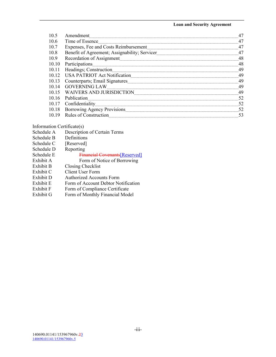 Loan and Security Agreement 10.5 Amendment 47 10.6 Time of Essence 47 10.7 Expenses, Fee and Costs Reimbursement 47 10.8 Benefit of Agreement; Assignability; Servicer 47 10.9 Recordation of Assignment 48 10.10 Participations 48 10.11 Headings; Construction 49 10.12 USA PATRIOT Act Notification 49 10.13 Counterparts; Email Signatures 49 10.14 GOVERNING LAW 49 10.15 WAIVERS AND JURISDICTION 49 10.16 Publication 52 10.17 Confidentiality 52 10.18 Borrowing Agency Provisions 52 10.19 Rules of Construction 53 Information Certificate(s) Schedule A Description of Certain Terms Schedule B Definitions Schedule C [Reserved] Schedule D Reporting Schedule E Financial Covenants[Reserved] Exhibit A Form of Notice of Borrowing Exhibit B Closing Checklist Exhibit C Client User Form Exhibit D Authorized Accounts Form Exhibit E Form of Account Debtor Notification Exhibit F Form of Compliance Certificate Exhibit G Form of Monthly Financial Model -iii- 140690.01141/153967960v.23 140690.01141/153967960v.5