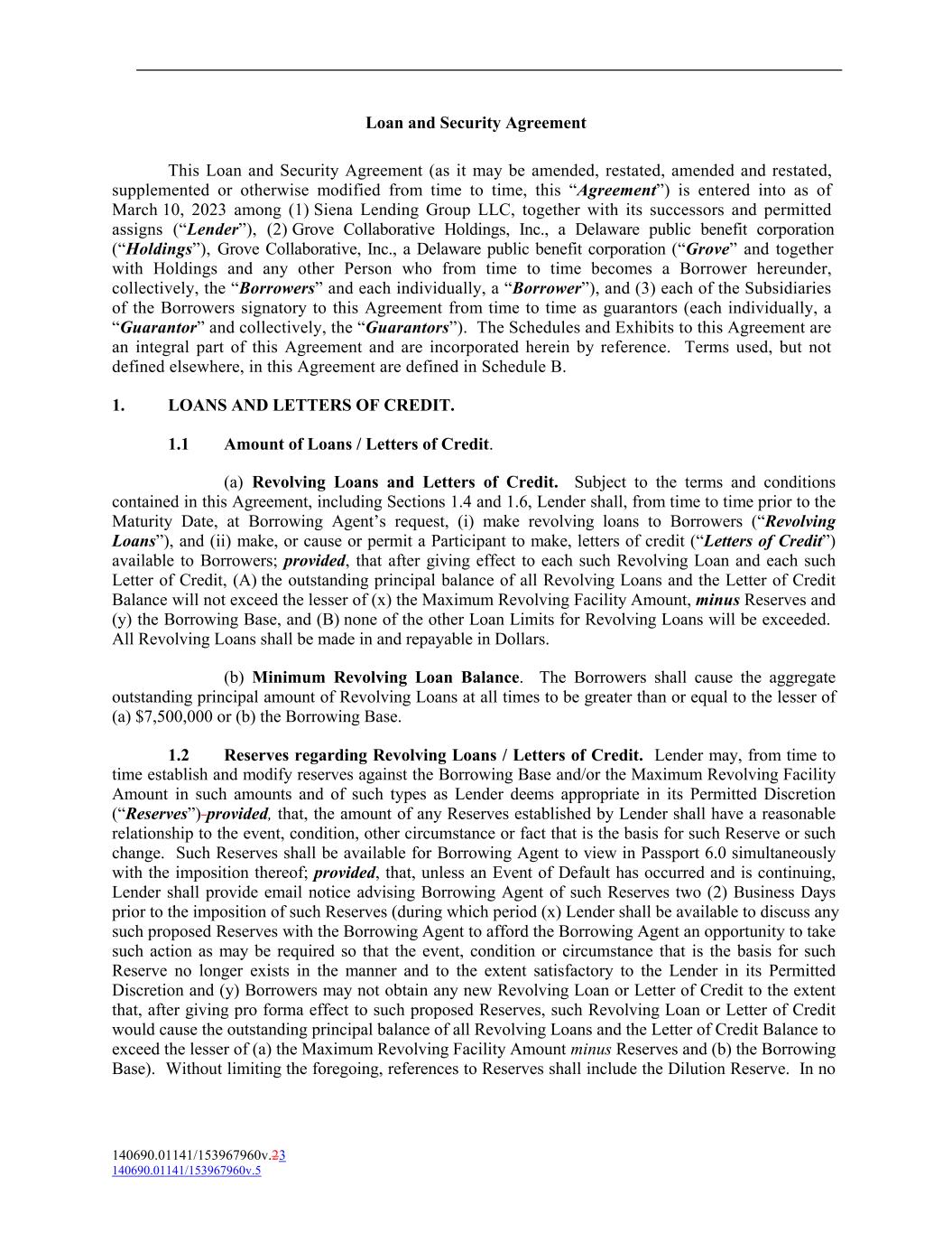 Loan and Security Agreement This Loan and Security Agreement (as it may be amended, restated, amended and restated, supplemented or otherwise modified from time to time, this “Agreement”) is entered into as of March 10, 2023 among (1) Siena Lending Group LLC, together with its successors and permitted assigns (“Lender”), (2) Grove Collaborative Holdings, Inc., a Delaware public benefit corporation (“Holdings”), Grove Collaborative, Inc., a Delaware public benefit corporation (“Grove” and together with Holdings and any other Person who from time to time becomes a Borrower hereunder, collectively, the “Borrowers” and each individually, a “Borrower”), and (3) each of the Subsidiaries of the Borrowers signatory to this Agreement from time to time as guarantors (each individually, a “Guarantor” and collectively, the “Guarantors”). The Schedules and Exhibits to this Agreement are an integral part of this Agreement and are incorporated herein by reference. Terms used, but not defined elsewhere, in this Agreement are defined in Schedule B. 1. LOANS AND LETTERS OF CREDIT. 1.1 Amount of Loans / Letters of Credit. (a) Revolving Loans and Letters of Credit. Subject to the terms and conditions contained in this Agreement, including Sections 1.4 and 1.6, Lender shall, from time to time prior to the Maturity Date, at Borrowing Agent’s request, (i) make revolving loans to Borrowers (“Revolving Loans”), and (ii) make, or cause or permit a Participant to make, letters of credit (“Letters of Credit”) available to Borrowers; provided, that after giving effect to each such Revolving Loan and each such Letter of Credit, (A) the outstanding principal balance of all Revolving Loans and the Letter of Credit Balance will not exceed the lesser of (x) the Maximum Revolving Facility Amount, minus Reserves and (y) the Borrowing Base, and (B) none of the other Loan Limits for Revolving Loans will be exceeded. All Revolving Loans shall be made in and repayable in Dollars. (b) Minimum Revolving Loan Balance. The Borrowers shall cause the aggregate outstanding principal amount of Revolving Loans at all times to be greater than or equal to the lesser of (a) $7,500,000 or (b) the Borrowing Base. 1.2 Reserves regarding Revolving Loans / Letters of Credit. Lender may, from time to time establish and modify reserves against the Borrowing Base and/or the Maximum Revolving Facility Amount in such amounts and of such types as Lender deems appropriate in its Permitted Discretion (“Reserves”) provided, that, the amount of any Reserves established by Lender shall have a reasonable relationship to the event, condition, other circumstance or fact that is the basis for such Reserve or such change. Such Reserves shall be available for Borrowing Agent to view in Passport 6.0 simultaneously with the imposition thereof; provided, that, unless an Event of Default has occurred and is continuing, Lender shall provide email notice advising Borrowing Agent of such Reserves two (2) Business Days prior to the imposition of such Reserves (during which period (x) Lender shall be available to discuss any such proposed Reserves with the Borrowing Agent to afford the Borrowing Agent an opportunity to take such action as may be required so that the event, condition or circumstance that is the basis for such Reserve no longer exists in the manner and to the extent satisfactory to the Lender in its Permitted Discretion and (y) Borrowers may not obtain any new Revolving Loan or Letter of Credit to the extent that, after giving pro forma effect to such proposed Reserves, such Revolving Loan or Letter of Credit would cause the outstanding principal balance of all Revolving Loans and the Letter of Credit Balance to exceed the lesser of (a) the Maximum Revolving Facility Amount minus Reserves and (b) the Borrowing Base). Without limiting the foregoing, references to Reserves shall include the Dilution Reserve. In no 140690.01141/153967960v.23 140690.01141/153967960v.5