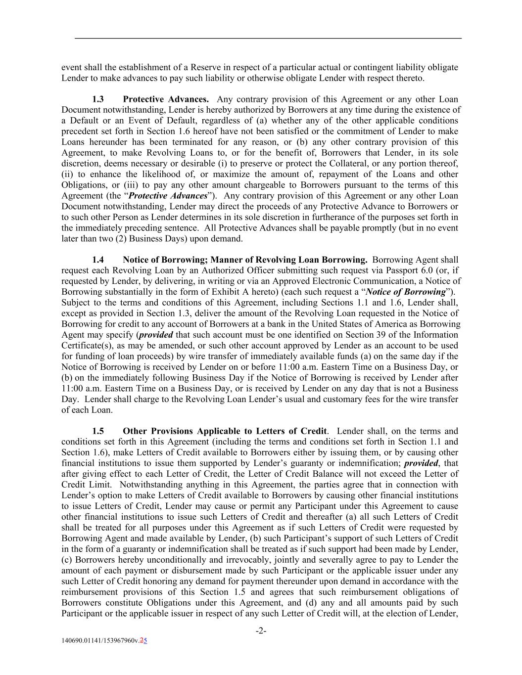 event shall the establishment of a Reserve in respect of a particular actual or contingent liability obligate Lender to make advances to pay such liability or otherwise obligate Lender with respect thereto. 1.3 Protective Advances. Any contrary provision of this Agreement or any other Loan Document notwithstanding, Lender is hereby authorized by Borrowers at any time during the existence of a Default or an Event of Default, regardless of (a) whether any of the other applicable conditions precedent set forth in Section 1.6 hereof have not been satisfied or the commitment of Lender to make Loans hereunder has been terminated for any reason, or (b) any other contrary provision of this Agreement, to make Revolving Loans to, or for the benefit of, Borrowers that Lender, in its sole discretion, deems necessary or desirable (i) to preserve or protect the Collateral, or any portion thereof, (ii) to enhance the likelihood of, or maximize the amount of, repayment of the Loans and other Obligations, or (iii) to pay any other amount chargeable to Borrowers pursuant to the terms of this Agreement (the “Protective Advances”). Any contrary provision of this Agreement or any other Loan Document notwithstanding, Lender may direct the proceeds of any Protective Advance to Borrowers or to such other Person as Lender determines in its sole discretion in furtherance of the purposes set forth in the immediately preceding sentence. All Protective Advances shall be payable promptly (but in no event later than two (2) Business Days) upon demand. 1.4 Notice of Borrowing; Manner of Revolving Loan Borrowing. Borrowing Agent shall request each Revolving Loan by an Authorized Officer submitting such request via Passport 6.0 (or, if requested by Lender, by delivering, in writing or via an Approved Electronic Communication, a Notice of Borrowing substantially in the form of Exhibit A hereto) (each such request a “Notice of Borrowing”). Subject to the terms and conditions of this Agreement, including Sections 1.1 and 1.6, Lender shall, except as provided in Section 1.3, deliver the amount of the Revolving Loan requested in the Notice of Borrowing for credit to any account of Borrowers at a bank in the United States of America as Borrowing Agent may specify (provided that such account must be one identified on Section 39 of the Information Certificate(s), as may be amended, or such other account approved by Lender as an account to be used for funding of loan proceeds) by wire transfer of immediately available funds (a) on the same day if the Notice of Borrowing is received by Lender on or before 11:00 a.m. Eastern Time on a Business Day, or (b) on the immediately following Business Day if the Notice of Borrowing is received by Lender after 11:00 a.m. Eastern Time on a Business Day, or is received by Lender on any day that is not a Business Day. Lender shall charge to the Revolving Loan Lender’s usual and customary fees for the wire transfer of each Loan. 1.5 Other Provisions Applicable to Letters of Credit. Lender shall, on the terms and conditions set forth in this Agreement (including the terms and conditions set forth in Section 1.1 and Section 1.6), make Letters of Credit available to Borrowers either by issuing them, or by causing other financial institutions to issue them supported by Lender’s guaranty or indemnification; provided, that after giving effect to each Letter of Credit, the Letter of Credit Balance will not exceed the Letter of Credit Limit. Notwithstanding anything in this Agreement, the parties agree that in connection with Lender’s option to make Letters of Credit available to Borrowers by causing other financial institutions to issue Letters of Credit, Lender may cause or permit any Participant under this Agreement to cause other financial institutions to issue such Letters of Credit and thereafter (a) all such Letters of Credit shall be treated for all purposes under this Agreement as if such Letters of Credit were requested by Borrowing Agent and made available by Lender, (b) such Participant’s support of such Letters of Credit in the form of a guaranty or indemnification shall be treated as if such support had been made by Lender, (c) Borrowers hereby unconditionally and irrevocably, jointly and severally agree to pay to Lender the amount of each payment or disbursement made by such Participant or the applicable issuer under any such Letter of Credit honoring any demand for payment thereunder upon demand in accordance with the reimbursement provisions of this Section 1.5 and agrees that such reimbursement obligations of Borrowers constitute Obligations under this Agreement, and (d) any and all amounts paid by such Participant or the applicable issuer in respect of any such Letter of Credit will, at the election of Lender, -2- 140690.01141/153967960v.25
