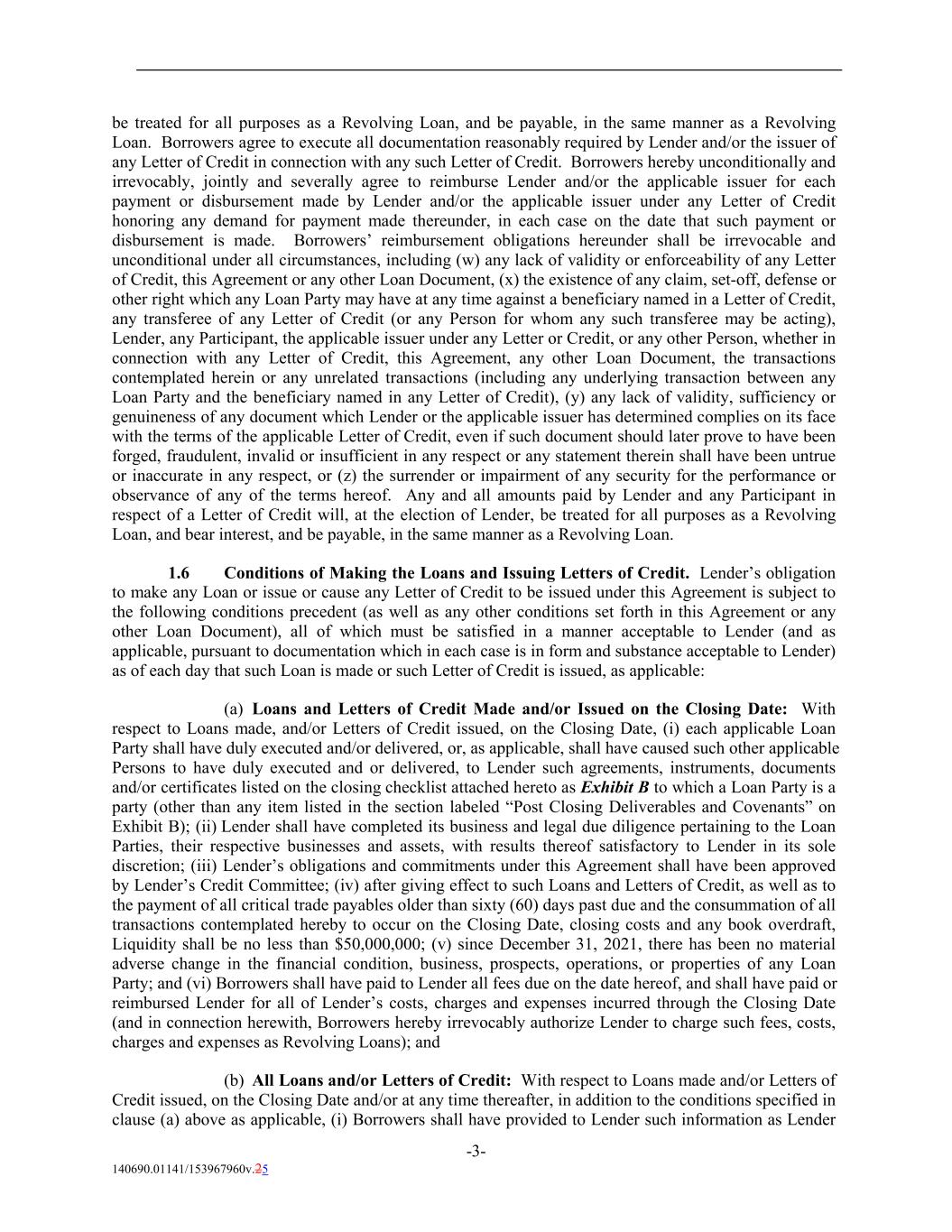 be treated for all purposes as a Revolving Loan, and be payable, in the same manner as a Revolving Loan. Borrowers agree to execute all documentation reasonably required by Lender and/or the issuer of any Letter of Credit in connection with any such Letter of Credit. Borrowers hereby unconditionally and irrevocably, jointly and severally agree to reimburse Lender and/or the applicable issuer for each payment or disbursement made by Lender and/or the applicable issuer under any Letter of Credit honoring any demand for payment made thereunder, in each case on the date that such payment or disbursement is made. Borrowers’ reimbursement obligations hereunder shall be irrevocable and unconditional under all circumstances, including (w) any lack of validity or enforceability of any Letter of Credit, this Agreement or any other Loan Document, (x) the existence of any claim, set-off, defense or other right which any Loan Party may have at any time against a beneficiary named in a Letter of Credit, any transferee of any Letter of Credit (or any Person for whom any such transferee may be acting), Lender, any Participant, the applicable issuer under any Letter or Credit, or any other Person, whether in connection with any Letter of Credit, this Agreement, any other Loan Document, the transactions contemplated herein or any unrelated transactions (including any underlying transaction between any Loan Party and the beneficiary named in any Letter of Credit), (y) any lack of validity, sufficiency or genuineness of any document which Lender or the applicable issuer has determined complies on its face with the terms of the applicable Letter of Credit, even if such document should later prove to have been forged, fraudulent, invalid or insufficient in any respect or any statement therein shall have been untrue or inaccurate in any respect, or (z) the surrender or impairment of any security for the performance or observance of any of the terms hereof. Any and all amounts paid by Lender and any Participant in respect of a Letter of Credit will, at the election of Lender, be treated for all purposes as a Revolving Loan, and bear interest, and be payable, in the same manner as a Revolving Loan. 1.6 Conditions of Making the Loans and Issuing Letters of Credit. Lender’s obligation to make any Loan or issue or cause any Letter of Credit to be issued under this Agreement is subject to the following conditions precedent (as well as any other conditions set forth in this Agreement or any other Loan Document), all of which must be satisfied in a manner acceptable to Lender (and as applicable, pursuant to documentation which in each case is in form and substance acceptable to Lender) as of each day that such Loan is made or such Letter of Credit is issued, as applicable: (a) Loans and Letters of Credit Made and/or Issued on the Closing Date: With respect to Loans made, and/or Letters of Credit issued, on the Closing Date, (i) each applicable Loan Party shall have duly executed and/or delivered, or, as applicable, shall have caused such other applicable Persons to have duly executed and or delivered, to Lender such agreements, instruments, documents and/or certificates listed on the closing checklist attached hereto as Exhibit B to which a Loan Party is a party (other than any item listed in the section labeled “Post Closing Deliverables and Covenants” on Exhibit B); (ii) Lender shall have completed its business and legal due diligence pertaining to the Loan Parties, their respective businesses and assets, with results thereof satisfactory to Lender in its sole discretion; (iii) Lender’s obligations and commitments under this Agreement shall have been approved by Lender’s Credit Committee; (iv) after giving effect to such Loans and Letters of Credit, as well as to the payment of all critical trade payables older than sixty (60) days past due and the consummation of all transactions contemplated hereby to occur on the Closing Date, closing costs and any book overdraft, Liquidity shall be no less than $50,000,000; (v) since December 31, 2021, there has been no material adverse change in the financial condition, business, prospects, operations, or properties of any Loan Party; and (vi) Borrowers shall have paid to Lender all fees due on the date hereof, and shall have paid or reimbursed Lender for all of Lender’s costs, charges and expenses incurred through the Closing Date (and in connection herewith, Borrowers hereby irrevocably authorize Lender to charge such fees, costs, charges and expenses as Revolving Loans); and (b) All Loans and/or Letters of Credit: With respect to Loans made and/or Letters of Credit issued, on the Closing Date and/or at any time thereafter, in addition to the conditions specified in clause (a) above as applicable, (i) Borrowers shall have provided to Lender such information as Lender -3- 140690.01141/153967960v.25