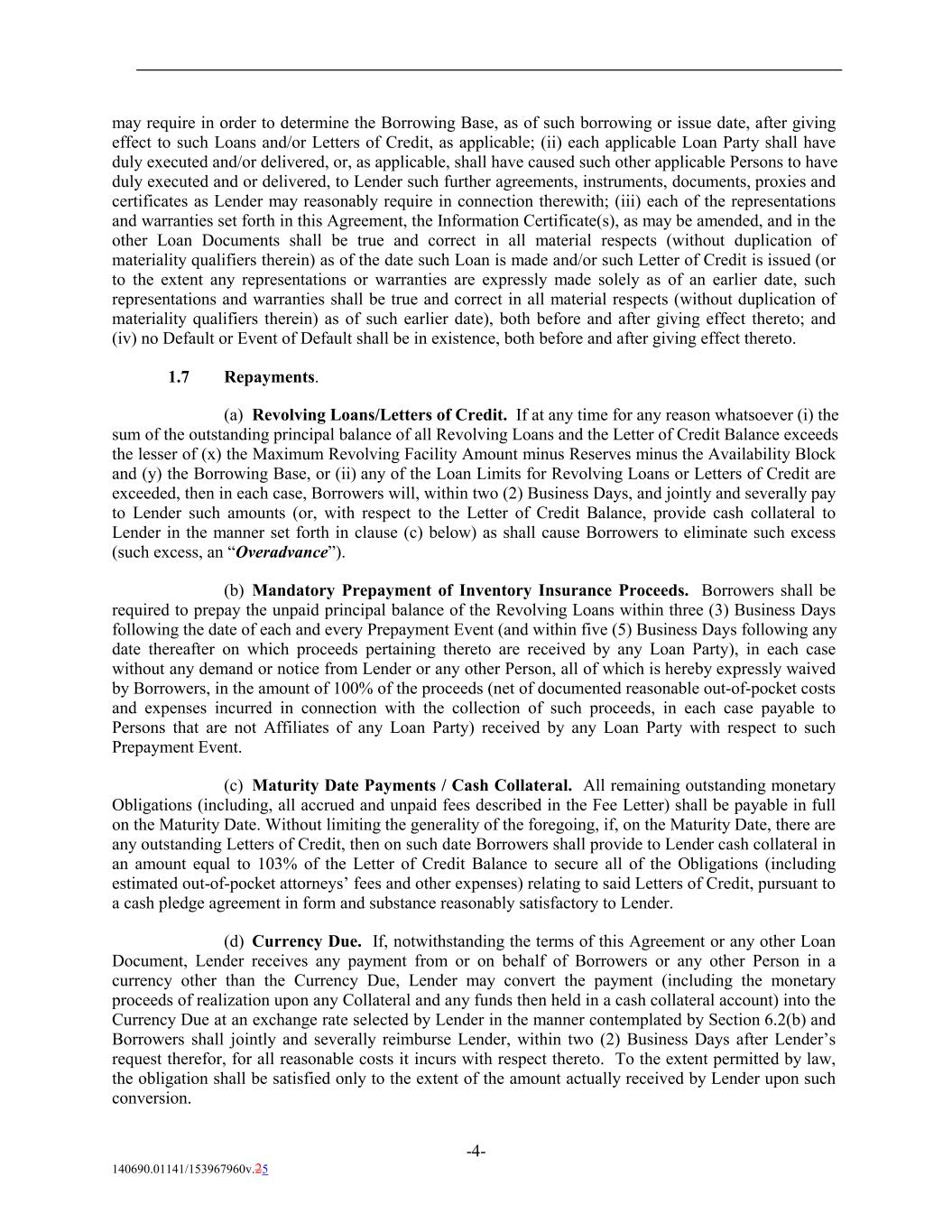 may require in order to determine the Borrowing Base, as of such borrowing or issue date, after giving effect to such Loans and/or Letters of Credit, as applicable; (ii) each applicable Loan Party shall have duly executed and/or delivered, or, as applicable, shall have caused such other applicable Persons to have duly executed and or delivered, to Lender such further agreements, instruments, documents, proxies and certificates as Lender may reasonably require in connection therewith; (iii) each of the representations and warranties set forth in this Agreement, the Information Certificate(s), as may be amended, and in the other Loan Documents shall be true and correct in all material respects (without duplication of materiality qualifiers therein) as of the date such Loan is made and/or such Letter of Credit is issued (or to the extent any representations or warranties are expressly made solely as of an earlier date, such representations and warranties shall be true and correct in all material respects (without duplication of materiality qualifiers therein) as of such earlier date), both before and after giving effect thereto; and (iv) no Default or Event of Default shall be in existence, both before and after giving effect thereto. 1.7 Repayments. (a) Revolving Loans/Letters of Credit. If at any time for any reason whatsoever (i) the sum of the outstanding principal balance of all Revolving Loans and the Letter of Credit Balance exceeds the lesser of (x) the Maximum Revolving Facility Amount minus Reserves minus the Availability Block and (y) the Borrowing Base, or (ii) any of the Loan Limits for Revolving Loans or Letters of Credit are exceeded, then in each case, Borrowers will, within two (2) Business Days, and jointly and severally pay to Lender such amounts (or, with respect to the Letter of Credit Balance, provide cash collateral to Lender in the manner set forth in clause (c) below) as shall cause Borrowers to eliminate such excess (such excess, an “Overadvance”). (b) Mandatory Prepayment of Inventory Insurance Proceeds. Borrowers shall be required to prepay the unpaid principal balance of the Revolving Loans within three (3) Business Days following the date of each and every Prepayment Event (and within five (5) Business Days following any date thereafter on which proceeds pertaining thereto are received by any Loan Party), in each case without any demand or notice from Lender or any other Person, all of which is hereby expressly waived by Borrowers, in the amount of 100% of the proceeds (net of documented reasonable out-of-pocket costs and expenses incurred in connection with the collection of such proceeds, in each case payable to Persons that are not Affiliates of any Loan Party) received by any Loan Party with respect to such Prepayment Event. (c) Maturity Date Payments / Cash Collateral. All remaining outstanding monetary Obligations (including, all accrued and unpaid fees described in the Fee Letter) shall be payable in full on the Maturity Date. Without limiting the generality of the foregoing, if, on the Maturity Date, there are any outstanding Letters of Credit, then on such date Borrowers shall provide to Lender cash collateral in an amount equal to 103% of the Letter of Credit Balance to secure all of the Obligations (including estimated out-of-pocket attorneys’ fees and other expenses) relating to said Letters of Credit, pursuant to a cash pledge agreement in form and substance reasonably satisfactory to Lender. (d) Currency Due. If, notwithstanding the terms of this Agreement or any other Loan Document, Lender receives any payment from or on behalf of Borrowers or any other Person in a currency other than the Currency Due, Lender may convert the payment (including the monetary proceeds of realization upon any Collateral and any funds then held in a cash collateral account) into the Currency Due at an exchange rate selected by Lender in the manner contemplated by Section 6.2(b) and Borrowers shall jointly and severally reimburse Lender, within two (2) Business Days after Lender’s request therefor, for all reasonable costs it incurs with respect thereto. To the extent permitted by law, the obligation shall be satisfied only to the extent of the amount actually received by Lender upon such conversion. -4- 140690.01141/153967960v.25