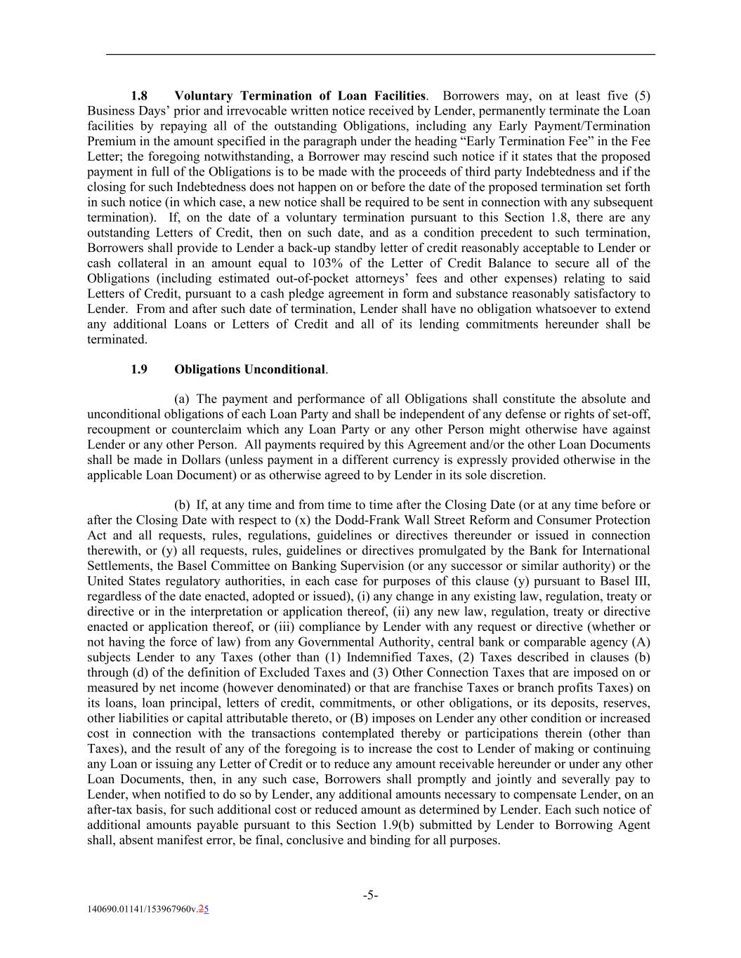 1.8 Voluntary Termination of Loan Facilities. Borrowers may, on at least five (5) Business Days’ prior and irrevocable written notice received by Lender, permanently terminate the Loan facilities by repaying all of the outstanding Obligations, including any Early Payment/Termination Premium in the amount specified in the paragraph under the heading “Early Termination Fee” in the Fee Letter; the foregoing notwithstanding, a Borrower may rescind such notice if it states that the proposed payment in full of the Obligations is to be made with the proceeds of third party Indebtedness and if the closing for such Indebtedness does not happen on or before the date of the proposed termination set forth in such notice (in which case, a new notice shall be required to be sent in connection with any subsequent termination). If, on the date of a voluntary termination pursuant to this Section 1.8, there are any outstanding Letters of Credit, then on such date, and as a condition precedent to such termination, Borrowers shall provide to Lender a back-up standby letter of credit reasonably acceptable to Lender or cash collateral in an amount equal to 103% of the Letter of Credit Balance to secure all of the Obligations (including estimated out-of-pocket attorneys’ fees and other expenses) relating to said Letters of Credit, pursuant to a cash pledge agreement in form and substance reasonably satisfactory to Lender. From and after such date of termination, Lender shall have no obligation whatsoever to extend any additional Loans or Letters of Credit and all of its lending commitments hereunder shall be terminated. 1.9 Obligations Unconditional. (a) The payment and performance of all Obligations shall constitute the absolute and unconditional obligations of each Loan Party and shall be independent of any defense or rights of set-off, recoupment or counterclaim which any Loan Party or any other Person might otherwise have against Lender or any other Person. All payments required by this Agreement and/or the other Loan Documents shall be made in Dollars (unless payment in a different currency is expressly provided otherwise in the applicable Loan Document) or as otherwise agreed to by Lender in its sole discretion. (b) If, at any time and from time to time after the Closing Date (or at any time before or after the Closing Date with respect to (x) the Dodd-Frank Wall Street Reform and Consumer Protection Act and all requests, rules, regulations, guidelines or directives thereunder or issued in connection therewith, or (y) all requests, rules, guidelines or directives promulgated by the Bank for International Settlements, the Basel Committee on Banking Supervision (or any successor or similar authority) or the United States regulatory authorities, in each case for purposes of this clause (y) pursuant to Basel III, regardless of the date enacted, adopted or issued), (i) any change in any existing law, regulation, treaty or directive or in the interpretation or application thereof, (ii) any new law, regulation, treaty or directive enacted or application thereof, or (iii) compliance by Lender with any request or directive (whether or not having the force of law) from any Governmental Authority, central bank or comparable agency (A) subjects Lender to any Taxes (other than (1) Indemnified Taxes, (2) Taxes described in clauses (b) through (d) of the definition of Excluded Taxes and (3) Other Connection Taxes that are imposed on or measured by net income (however denominated) or that are franchise Taxes or branch profits Taxes) on its loans, loan principal, letters of credit, commitments, or other obligations, or its deposits, reserves, other liabilities or capital attributable thereto, or (B) imposes on Lender any other condition or increased cost in connection with the transactions contemplated thereby or participations therein (other than Taxes), and the result of any of the foregoing is to increase the cost to Lender of making or continuing any Loan or issuing any Letter of Credit or to reduce any amount receivable hereunder or under any other Loan Documents, then, in any such case, Borrowers shall promptly and jointly and severally pay to Lender, when notified to do so by Lender, any additional amounts necessary to compensate Lender, on an after-tax basis, for such additional cost or reduced amount as determined by Lender. Each such notice of additional amounts payable pursuant to this Section 1.9(b) submitted by Lender to Borrowing Agent shall, absent manifest error, be final, conclusive and binding for all purposes. -5- 140690.01141/153967960v.25