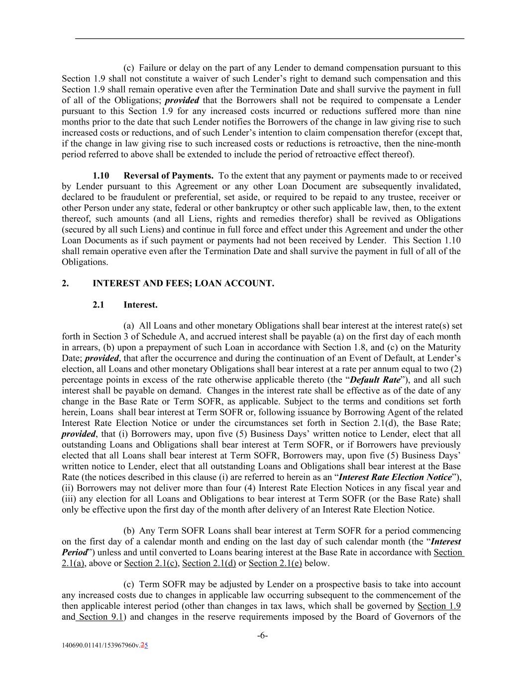 (c) Failure or delay on the part of any Lender to demand compensation pursuant to this Section 1.9 shall not constitute a waiver of such Lender’s right to demand such compensation and this Section 1.9 shall remain operative even after the Termination Date and shall survive the payment in full of all of the Obligations; provided that the Borrowers shall not be required to compensate a Lender pursuant to this Section 1.9 for any increased costs incurred or reductions suffered more than nine months prior to the date that such Lender notifies the Borrowers of the change in law giving rise to such increased costs or reductions, and of such Lender’s intention to claim compensation therefor (except that, if the change in law giving rise to such increased costs or reductions is retroactive, then the nine-month period referred to above shall be extended to include the period of retroactive effect thereof). 1.10 Reversal of Payments. To the extent that any payment or payments made to or received by Lender pursuant to this Agreement or any other Loan Document are subsequently invalidated, declared to be fraudulent or preferential, set aside, or required to be repaid to any trustee, receiver or other Person under any state, federal or other bankruptcy or other such applicable law, then, to the extent thereof, such amounts (and all Liens, rights and remedies therefor) shall be revived as Obligations (secured by all such Liens) and continue in full force and effect under this Agreement and under the other Loan Documents as if such payment or payments had not been received by Lender. This Section 1.10 shall remain operative even after the Termination Date and shall survive the payment in full of all of the Obligations. 2. INTEREST AND FEES; LOAN ACCOUNT. 2.1 Interest. (a) All Loans and other monetary Obligations shall bear interest at the interest rate(s) set forth in Section 3 of Schedule A, and accrued interest shall be payable (a) on the first day of each month in arrears, (b) upon a prepayment of such Loan in accordance with Section 1.8, and (c) on the Maturity Date; provided, that after the occurrence and during the continuation of an Event of Default, at Lender’s election, all Loans and other monetary Obligations shall bear interest at a rate per annum equal to two (2) percentage points in excess of the rate otherwise applicable thereto (the “Default Rate”), and all such interest shall be payable on demand. Changes in the interest rate shall be effective as of the date of any change in the Base Rate or Term SOFR, as applicable. Subject to the terms and conditions set forth herein, Loans shall bear interest at Term SOFR or, following issuance by Borrowing Agent of the related Interest Rate Election Notice or under the circumstances set forth in Section 2.1(d), the Base Rate; provided, that (i) Borrowers may, upon five (5) Business Days’ written notice to Lender, elect that all outstanding Loans and Obligations shall bear interest at Term SOFR, or if Borrowers have previously elected that all Loans shall bear interest at Term SOFR, Borrowers may, upon five (5) Business Days’ written notice to Lender, elect that all outstanding Loans and Obligations shall bear interest at the Base Rate (the notices described in this clause (i) are referred to herein as an “Interest Rate Election Notice”), (ii) Borrowers may not deliver more than four (4) Interest Rate Election Notices in any fiscal year and (iii) any election for all Loans and Obligations to bear interest at Term SOFR (or the Base Rate) shall only be effective upon the first day of the month after delivery of an Interest Rate Election Notice. (b) Any Term SOFR Loans shall bear interest at Term SOFR for a period commencing on the first day of a calendar month and ending on the last day of such calendar month (the “Interest Period”) unless and until converted to Loans bearing interest at the Base Rate in accordance with Section 2.1(a), above or Section 2.1(c), Section 2.1(d) or Section 2.1(e) below. (c) Term SOFR may be adjusted by Lender on a prospective basis to take into account any increased costs due to changes in applicable law occurring subsequent to the commencement of the then applicable interest period (other than changes in tax laws, which shall be governed by Section 1.9 and Section 9.1) and changes in the reserve requirements imposed by the Board of Governors of the -6- 140690.01141/153967960v.25
