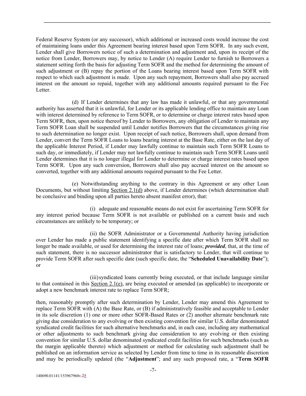 Federal Reserve System (or any successor), which additional or increased costs would increase the cost of maintaining loans under this Agreement bearing interest based upon Term SOFR. In any such event, Lender shall give Borrowers notice of such a determination and adjustment and, upon its receipt of the notice from Lender, Borrowers may, by notice to Lender (A) require Lender to furnish to Borrowers a statement setting forth the basis for adjusting Term SOFR and the method for determining the amount of such adjustment or (B) repay the portion of the Loans bearing interest based upon Term SOFR with respect to which such adjustment is made. Upon any such repayment, Borrowers shall also pay accrued interest on the amount so repaid, together with any additional amounts required pursuant to the Fee Letter. (d) If Lender determines that any law has made it unlawful, or that any governmental authority has asserted that it is unlawful, for Lender or its applicable lending office to maintain any Loan with interest determined by reference to Term SOFR, or to determine or charge interest rates based upon Term SOFR, then, upon notice thereof by Lender to Borrowers, any obligation of Lender to maintain any Term SOFR Loan shall be suspended until Lender notifies Borrowers that the circumstances giving rise to such determination no longer exist. Upon receipt of such notice, Borrowers shall, upon demand from Lender, convert the Term SOFR Loans to loans bearing interest at the Base Rate, either on the last day of the applicable Interest Period, if Lender may lawfully continue to maintain such Term SOFR Loans to such day, or immediately, if Lender may not lawfully continue to maintain such Term SOFR Loans until Lender determines that it is no longer illegal for Lender to determine or charge interest rates based upon Term SOFR. Upon any such conversion, Borrowers shall also pay accrued interest on the amount so converted, together with any additional amounts required pursuant to the Fee Letter. (e) Notwithstanding anything to the contrary in this Agreement or any other Loan Documents, but without limiting Section 2.1(d) above, if Lender determines (which determination shall be conclusive and binding upon all parties hereto absent manifest error), that: (i) adequate and reasonable means do not exist for ascertaining Term SOFR for any interest period because Term SOFR is not available or published on a current basis and such circumstances are unlikely to be temporary; or (ii) the SOFR Administrator or a Governmental Authority having jurisdiction over Lender has made a public statement identifying a specific date after which Term SOFR shall no longer be made available, or used for determining the interest rate of loans; provided, that, at the time of such statement, there is no successor administrator that is satisfactory to Lender, that will continue to provide Term SOFR after such specific date (such specific date, the “Scheduled Unavailability Date”); or (iii) syndicated loans currently being executed, or that include language similar to that contained in this Section 2.1(e), are being executed or amended (as applicable) to incorporate or adopt a new benchmark interest rate to replace Term SOFR; then, reasonably promptly after such determination by Lender, Lender may amend this Agreement to replace Term SOFR with (A) the Base Rate, or (B) if administratively feasible and acceptable to Lender in its sole discretion (1) one or more other SOFR-Based Rates or (2) another alternate benchmark rate giving due consideration to any evolving or then existing convention for similar U.S. dollar denominated syndicated credit facilities for such alternative benchmarks and, in each case, including any mathematical or other adjustments to such benchmark giving due consideration to any evolving or then existing convention for similar U.S. dollar denominated syndicated credit facilities for such benchmarks (such as the margin applicable thereto) which adjustment or method for calculating such adjustment shall be published on an information service as selected by Lender from time to time in its reasonable discretion and may be periodically updated (the “Adjustment”; and any such proposed rate, a “Term SOFR -7- 140690.01141/153967960v.25