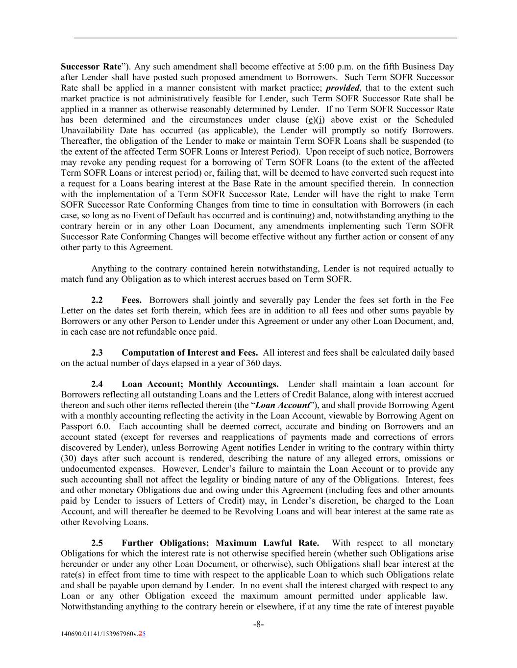 Successor Rate”). Any such amendment shall become effective at 5:00 p.m. on the fifth Business Day after Lender shall have posted such proposed amendment to Borrowers. Such Term SOFR Successor Rate shall be applied in a manner consistent with market practice; provided, that to the extent such market practice is not administratively feasible for Lender, such Term SOFR Successor Rate shall be applied in a manner as otherwise reasonably determined by Lender. If no Term SOFR Successor Rate has been determined and the circumstances under clause (e)(i) above exist or the Scheduled Unavailability Date has occurred (as applicable), the Lender will promptly so notify Borrowers. Thereafter, the obligation of the Lender to make or maintain Term SOFR Loans shall be suspended (to the extent of the affected Term SOFR Loans or Interest Period). Upon receipt of such notice, Borrowers may revoke any pending request for a borrowing of Term SOFR Loans (to the extent of the affected Term SOFR Loans or interest period) or, failing that, will be deemed to have converted such request into a request for a Loans bearing interest at the Base Rate in the amount specified therein. In connection with the implementation of a Term SOFR Successor Rate, Lender will have the right to make Term SOFR Successor Rate Conforming Changes from time to time in consultation with Borrowers (in each case, so long as no Event of Default has occurred and is continuing) and, notwithstanding anything to the contrary herein or in any other Loan Document, any amendments implementing such Term SOFR Successor Rate Conforming Changes will become effective without any further action or consent of any other party to this Agreement. Anything to the contrary contained herein notwithstanding, Lender is not required actually to match fund any Obligation as to which interest accrues based on Term SOFR. 2.2 Fees. Borrowers shall jointly and severally pay Lender the fees set forth in the Fee Letter on the dates set forth therein, which fees are in addition to all fees and other sums payable by Borrowers or any other Person to Lender under this Agreement or under any other Loan Document, and, in each case are not refundable once paid. 2.3 Computation of Interest and Fees. All interest and fees shall be calculated daily based on the actual number of days elapsed in a year of 360 days. 2.4 Loan Account; Monthly Accountings. Lender shall maintain a loan account for Borrowers reflecting all outstanding Loans and the Letters of Credit Balance, along with interest accrued thereon and such other items reflected therein (the “Loan Account”), and shall provide Borrowing Agent with a monthly accounting reflecting the activity in the Loan Account, viewable by Borrowing Agent on Passport 6.0. Each accounting shall be deemed correct, accurate and binding on Borrowers and an account stated (except for reverses and reapplications of payments made and corrections of errors discovered by Lender), unless Borrowing Agent notifies Lender in writing to the contrary within thirty (30) days after such account is rendered, describing the nature of any alleged errors, omissions or undocumented expenses. However, Lender’s failure to maintain the Loan Account or to provide any such accounting shall not affect the legality or binding nature of any of the Obligations. Interest, fees and other monetary Obligations due and owing under this Agreement (including fees and other amounts paid by Lender to issuers of Letters of Credit) may, in Lender’s discretion, be charged to the Loan Account, and will thereafter be deemed to be Revolving Loans and will bear interest at the same rate as other Revolving Loans. 2.5 Further Obligations; Maximum Lawful Rate. With respect to all monetary Obligations for which the interest rate is not otherwise specified herein (whether such Obligations arise hereunder or under any other Loan Document, or otherwise), such Obligations shall bear interest at the rate(s) in effect from time to time with respect to the applicable Loan to which such Obligations relate and shall be payable upon demand by Lender. In no event shall the interest charged with respect to any Loan or any other Obligation exceed the maximum amount permitted under applicable law. Notwithstanding anything to the contrary herein or elsewhere, if at any time the rate of interest payable -8- 140690.01141/153967960v.25