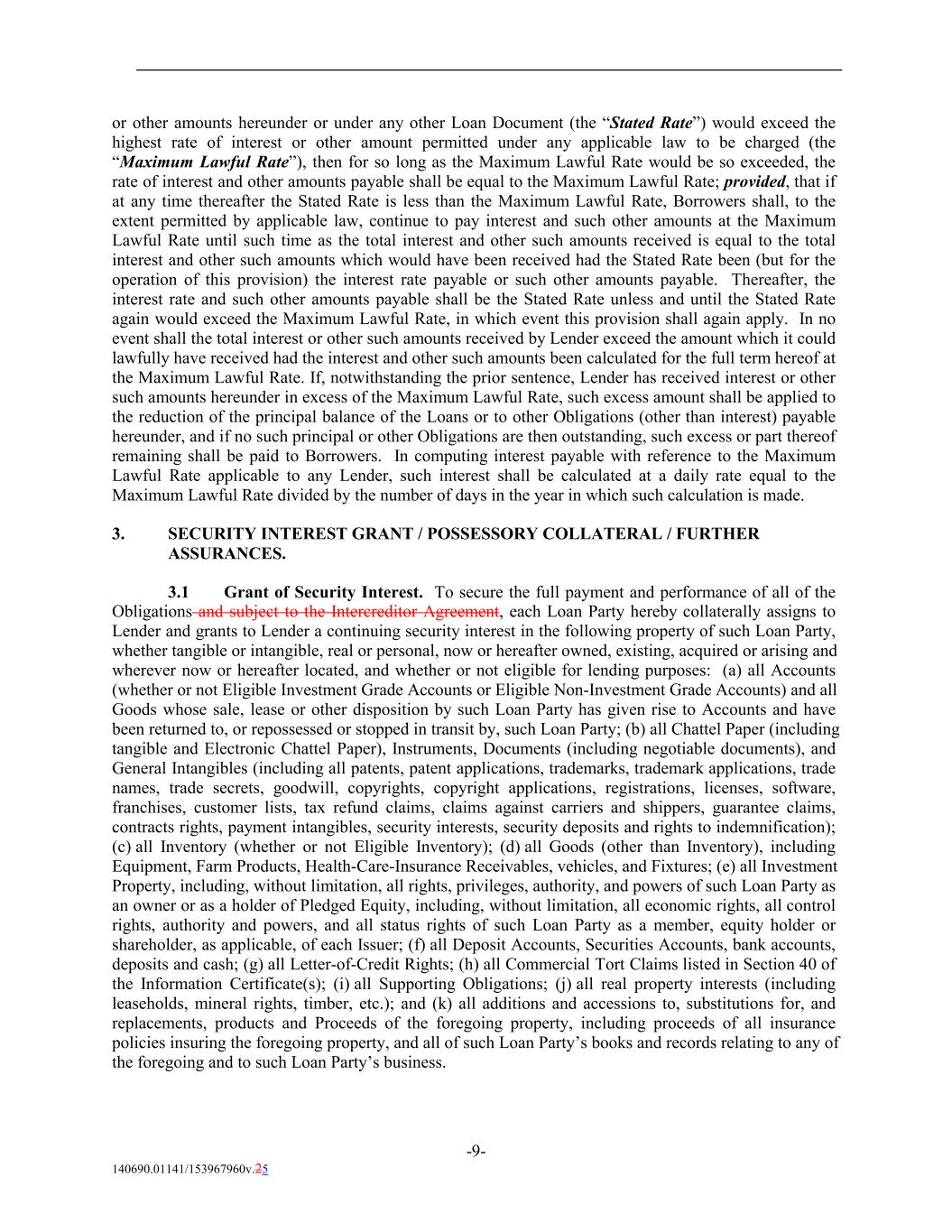 or other amounts hereunder or under any other Loan Document (the “Stated Rate”) would exceed the highest rate of interest or other amount permitted under any applicable law to be charged (the “Maximum Lawful Rate”), then for so long as the Maximum Lawful Rate would be so exceeded, the rate of interest and other amounts payable shall be equal to the Maximum Lawful Rate; provided, that if at any time thereafter the Stated Rate is less than the Maximum Lawful Rate, Borrowers shall, to the extent permitted by applicable law, continue to pay interest and such other amounts at the Maximum Lawful Rate until such time as the total interest and other such amounts received is equal to the total interest and other such amounts which would have been received had the Stated Rate been (but for the operation of this provision) the interest rate payable or such other amounts payable. Thereafter, the interest rate and such other amounts payable shall be the Stated Rate unless and until the Stated Rate again would exceed the Maximum Lawful Rate, in which event this provision shall again apply. In no event shall the total interest or other such amounts received by Lender exceed the amount which it could lawfully have received had the interest and other such amounts been calculated for the full term hereof at the Maximum Lawful Rate. If, notwithstanding the prior sentence, Lender has received interest or other such amounts hereunder in excess of the Maximum Lawful Rate, such excess amount shall be applied to the reduction of the principal balance of the Loans or to other Obligations (other than interest) payable hereunder, and if no such principal or other Obligations are then outstanding, such excess or part thereof remaining shall be paid to Borrowers. In computing interest payable with reference to the Maximum Lawful Rate applicable to any Lender, such interest shall be calculated at a daily rate equal to the Maximum Lawful Rate divided by the number of days in the year in which such calculation is made. 3. SECURITY INTEREST GRANT / POSSESSORY COLLATERAL / FURTHER ASSURANCES. 3.1 Grant of Security Interest. To secure the full payment and performance of all of the Obligations and subject to the Intercreditor Agreement, each Loan Party hereby collaterally assigns to Lender and grants to Lender a continuing security interest in the following property of such Loan Party, whether tangible or intangible, real or personal, now or hereafter owned, existing, acquired or arising and wherever now or hereafter located, and whether or not eligible for lending purposes: (a) all Accounts (whether or not Eligible Investment Grade Accounts or Eligible Non-Investment Grade Accounts) and all Goods whose sale, lease or other disposition by such Loan Party has given rise to Accounts and have been returned to, or repossessed or stopped in transit by, such Loan Party; (b) all Chattel Paper (including tangible and Electronic Chattel Paper), Instruments, Documents (including negotiable documents), and General Intangibles (including all patents, patent applications, trademarks, trademark applications, trade names, trade secrets, goodwill, copyrights, copyright applications, registrations, licenses, software, franchises, customer lists, tax refund claims, claims against carriers and shippers, guarantee claims, contracts rights, payment intangibles, security interests, security deposits and rights to indemnification); (c) all Inventory (whether or not Eligible Inventory); (d) all Goods (other than Inventory), including Equipment, Farm Products, Health-Care-Insurance Receivables, vehicles, and Fixtures; (e) all Investment Property, including, without limitation, all rights, privileges, authority, and powers of such Loan Party as an owner or as a holder of Pledged Equity, including, without limitation, all economic rights, all control rights, authority and powers, and all status rights of such Loan Party as a member, equity holder or shareholder, as applicable, of each Issuer; (f) all Deposit Accounts, Securities Accounts, bank accounts, deposits and cash; (g) all Letter-of-Credit Rights; (h) all Commercial Tort Claims listed in Section 40 of the Information Certificate(s); (i) all Supporting Obligations; (j) all real property interests (including leaseholds, mineral rights, timber, etc.); and (k) all additions and accessions to, substitutions for, and replacements, products and Proceeds of the foregoing property, including proceeds of all insurance policies insuring the foregoing property, and all of such Loan Party’s books and records relating to any of the foregoing and to such Loan Party’s business. -9- 140690.01141/153967960v.25