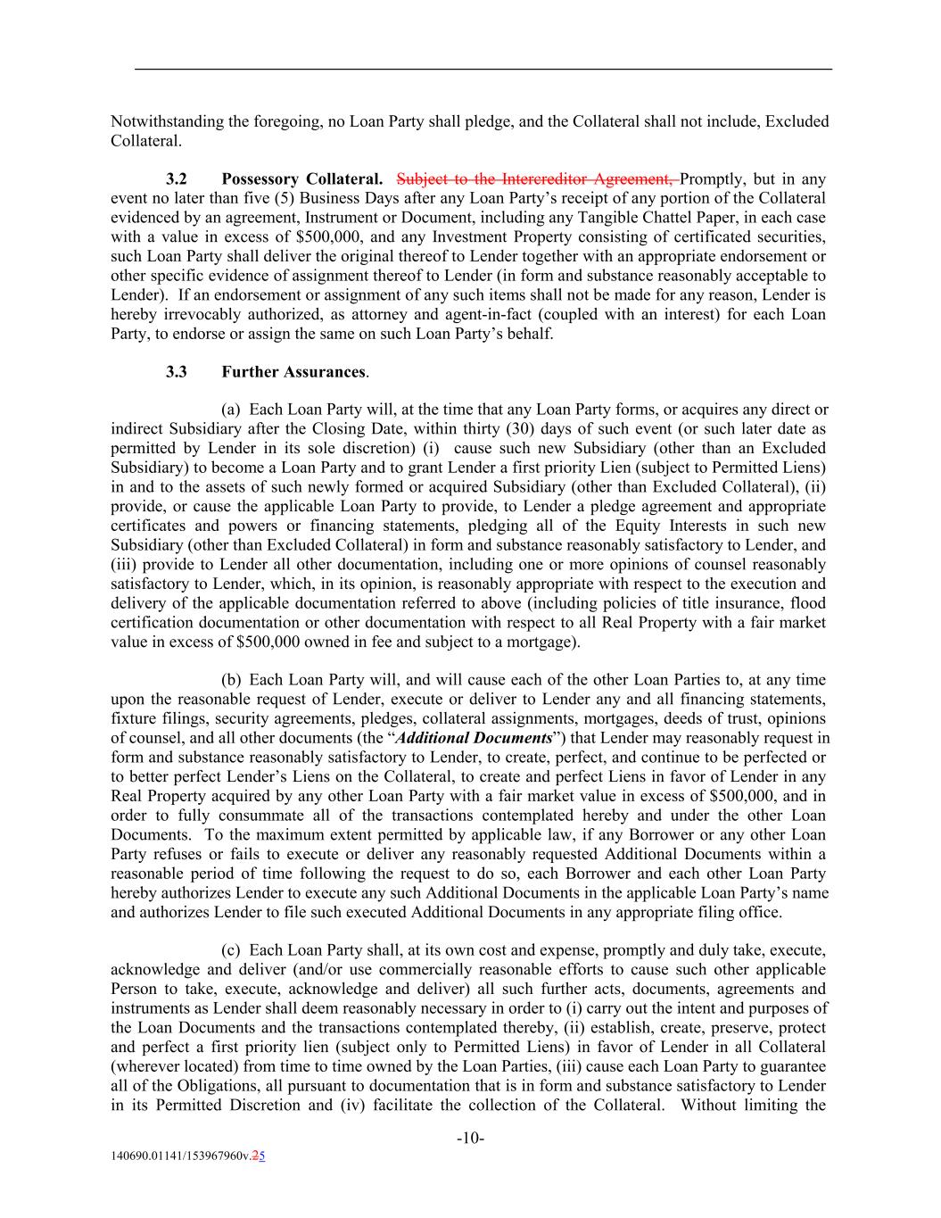 Notwithstanding the foregoing, no Loan Party shall pledge, and the Collateral shall not include, Excluded Collateral. 3.2 Possessory Collateral. Subject to the Intercreditor Agreement, Promptly, but in any event no later than five (5) Business Days after any Loan Party’s receipt of any portion of the Collateral evidenced by an agreement, Instrument or Document, including any Tangible Chattel Paper, in each case with a value in excess of $500,000, and any Investment Property consisting of certificated securities, such Loan Party shall deliver the original thereof to Lender together with an appropriate endorsement or other specific evidence of assignment thereof to Lender (in form and substance reasonably acceptable to Lender). If an endorsement or assignment of any such items shall not be made for any reason, Lender is hereby irrevocably authorized, as attorney and agent-in-fact (coupled with an interest) for each Loan Party, to endorse or assign the same on such Loan Party’s behalf. 3.3 Further Assurances. (a) Each Loan Party will, at the time that any Loan Party forms, or acquires any direct or indirect Subsidiary after the Closing Date, within thirty (30) days of such event (or such later date as permitted by Lender in its sole discretion) (i) cause such new Subsidiary (other than an Excluded Subsidiary) to become a Loan Party and to grant Lender a first priority Lien (subject to Permitted Liens) in and to the assets of such newly formed or acquired Subsidiary (other than Excluded Collateral), (ii) provide, or cause the applicable Loan Party to provide, to Lender a pledge agreement and appropriate certificates and powers or financing statements, pledging all of the Equity Interests in such new Subsidiary (other than Excluded Collateral) in form and substance reasonably satisfactory to Lender, and (iii) provide to Lender all other documentation, including one or more opinions of counsel reasonably satisfactory to Lender, which, in its opinion, is reasonably appropriate with respect to the execution and delivery of the applicable documentation referred to above (including policies of title insurance, flood certification documentation or other documentation with respect to all Real Property with a fair market value in excess of $500,000 owned in fee and subject to a mortgage). (b) Each Loan Party will, and will cause each of the other Loan Parties to, at any time upon the reasonable request of Lender, execute or deliver to Lender any and all financing statements, fixture filings, security agreements, pledges, collateral assignments, mortgages, deeds of trust, opinions of counsel, and all other documents (the “Additional Documents”) that Lender may reasonably request in form and substance reasonably satisfactory to Lender, to create, perfect, and continue to be perfected or to better perfect Lender’s Liens on the Collateral, to create and perfect Liens in favor of Lender in any Real Property acquired by any other Loan Party with a fair market value in excess of $500,000, and in order to fully consummate all of the transactions contemplated hereby and under the other Loan Documents. To the maximum extent permitted by applicable law, if any Borrower or any other Loan Party refuses or fails to execute or deliver any reasonably requested Additional Documents within a reasonable period of time following the request to do so, each Borrower and each other Loan Party hereby authorizes Lender to execute any such Additional Documents in the applicable Loan Party’s name and authorizes Lender to file such executed Additional Documents in any appropriate filing office. (c) Each Loan Party shall, at its own cost and expense, promptly and duly take, execute, acknowledge and deliver (and/or use commercially reasonable efforts to cause such other applicable Person to take, execute, acknowledge and deliver) all such further acts, documents, agreements and instruments as Lender shall deem reasonably necessary in order to (i) carry out the intent and purposes of the Loan Documents and the transactions contemplated thereby, (ii) establish, create, preserve, protect and perfect a first priority lien (subject only to Permitted Liens) in favor of Lender in all Collateral (wherever located) from time to time owned by the Loan Parties, (iii) cause each Loan Party to guarantee all of the Obligations, all pursuant to documentation that is in form and substance satisfactory to Lender in its Permitted Discretion and (iv) facilitate the collection of the Collateral. Without limiting the -10- 140690.01141/153967960v.25