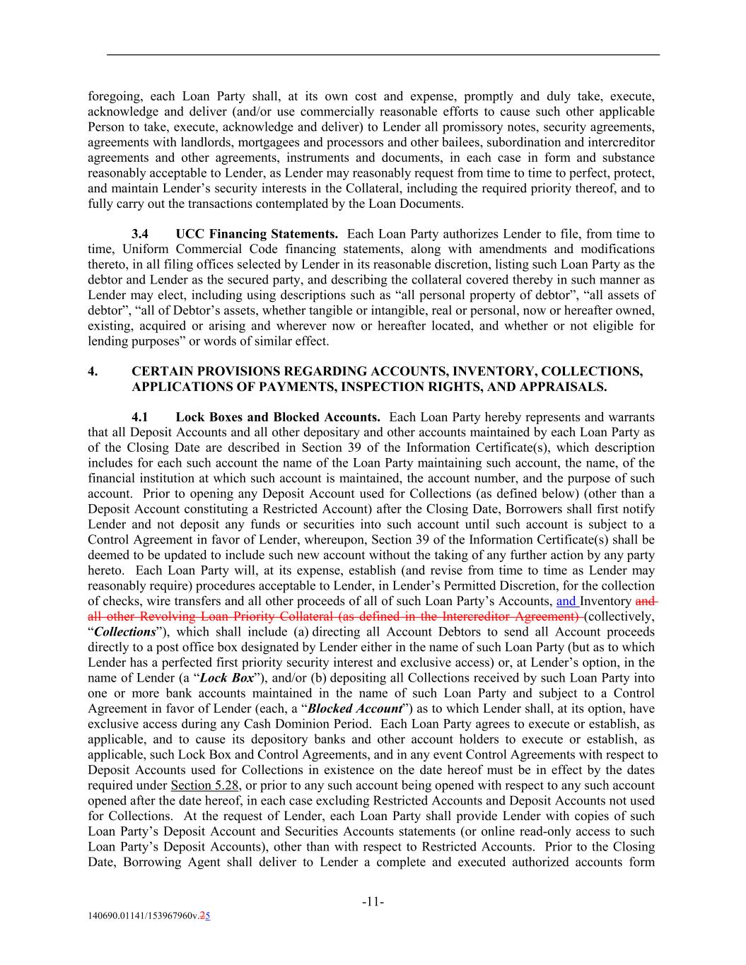 foregoing, each Loan Party shall, at its own cost and expense, promptly and duly take, execute, acknowledge and deliver (and/or use commercially reasonable efforts to cause such other applicable Person to take, execute, acknowledge and deliver) to Lender all promissory notes, security agreements, agreements with landlords, mortgagees and processors and other bailees, subordination and intercreditor agreements and other agreements, instruments and documents, in each case in form and substance reasonably acceptable to Lender, as Lender may reasonably request from time to time to perfect, protect, and maintain Lender’s security interests in the Collateral, including the required priority thereof, and to fully carry out the transactions contemplated by the Loan Documents. 3.4 UCC Financing Statements. Each Loan Party authorizes Lender to file, from time to time, Uniform Commercial Code financing statements, along with amendments and modifications thereto, in all filing offices selected by Lender in its reasonable discretion, listing such Loan Party as the debtor and Lender as the secured party, and describing the collateral covered thereby in such manner as Lender may elect, including using descriptions such as “all personal property of debtor”, “all assets of debtor”, “all of Debtor’s assets, whether tangible or intangible, real or personal, now or hereafter owned, existing, acquired or arising and wherever now or hereafter located, and whether or not eligible for lending purposes” or words of similar effect. 4. CERTAIN PROVISIONS REGARDING ACCOUNTS, INVENTORY, COLLECTIONS, APPLICATIONS OF PAYMENTS, INSPECTION RIGHTS, AND APPRAISALS. 4.1 Lock Boxes and Blocked Accounts. Each Loan Party hereby represents and warrants that all Deposit Accounts and all other depositary and other accounts maintained by each Loan Party as of the Closing Date are described in Section 39 of the Information Certificate(s), which description includes for each such account the name of the Loan Party maintaining such account, the name, of the financial institution at which such account is maintained, the account number, and the purpose of such account. Prior to opening any Deposit Account used for Collections (as defined below) (other than a Deposit Account constituting a Restricted Account) after the Closing Date, Borrowers shall first notify Lender and not deposit any funds or securities into such account until such account is subject to a Control Agreement in favor of Lender, whereupon, Section 39 of the Information Certificate(s) shall be deemed to be updated to include such new account without the taking of any further action by any party hereto. Each Loan Party will, at its expense, establish (and revise from time to time as Lender may reasonably require) procedures acceptable to Lender, in Lender’s Permitted Discretion, for the collection of checks, wire transfers and all other proceeds of all of such Loan Party’s Accounts, and Inventory and all other Revolving Loan Priority Collateral (as defined in the Intercreditor Agreement) (collectively, “Collections”), which shall include (a) directing all Account Debtors to send all Account proceeds directly to a post office box designated by Lender either in the name of such Loan Party (but as to which Lender has a perfected first priority security interest and exclusive access) or, at Lender’s option, in the name of Lender (a “Lock Box”), and/or (b) depositing all Collections received by such Loan Party into one or more bank accounts maintained in the name of such Loan Party and subject to a Control Agreement in favor of Lender (each, a “Blocked Account”) as to which Lender shall, at its option, have exclusive access during any Cash Dominion Period. Each Loan Party agrees to execute or establish, as applicable, and to cause its depository banks and other account holders to execute or establish, as applicable, such Lock Box and Control Agreements, and in any event Control Agreements with respect to Deposit Accounts used for Collections in existence on the date hereof must be in effect by the dates required under Section 5.28, or prior to any such account being opened with respect to any such account opened after the date hereof, in each case excluding Restricted Accounts and Deposit Accounts not used for Collections. At the request of Lender, each Loan Party shall provide Lender with copies of such Loan Party’s Deposit Account and Securities Accounts statements (or online read-only access to such Loan Party’s Deposit Accounts), other than with respect to Restricted Accounts. Prior to the Closing Date, Borrowing Agent shall deliver to Lender a complete and executed authorized accounts form -11- 140690.01141/153967960v.25