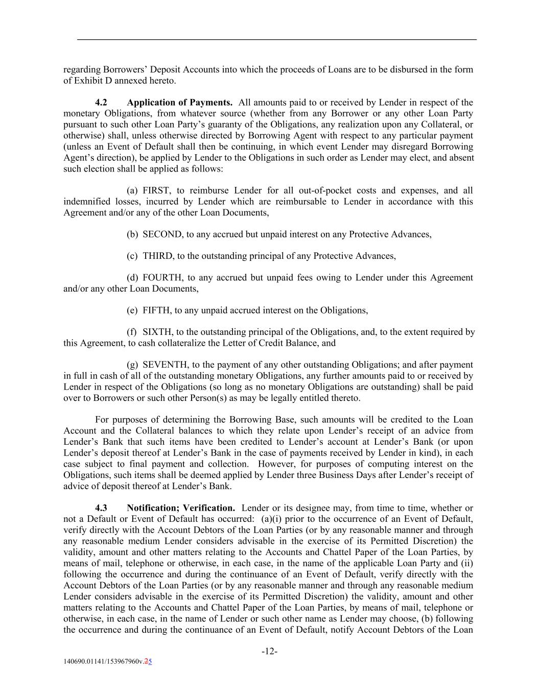 regarding Borrowers’ Deposit Accounts into which the proceeds of Loans are to be disbursed in the form of Exhibit D annexed hereto. 4.2 Application of Payments. All amounts paid to or received by Lender in respect of the monetary Obligations, from whatever source (whether from any Borrower or any other Loan Party pursuant to such other Loan Party’s guaranty of the Obligations, any realization upon any Collateral, or otherwise) shall, unless otherwise directed by Borrowing Agent with respect to any particular payment (unless an Event of Default shall then be continuing, in which event Lender may disregard Borrowing Agent’s direction), be applied by Lender to the Obligations in such order as Lender may elect, and absent such election shall be applied as follows: (a) FIRST, to reimburse Lender for all out-of-pocket costs and expenses, and all indemnified losses, incurred by Lender which are reimbursable to Lender in accordance with this Agreement and/or any of the other Loan Documents, (b) SECOND, to any accrued but unpaid interest on any Protective Advances, (c) THIRD, to the outstanding principal of any Protective Advances, (d) FOURTH, to any accrued but unpaid fees owing to Lender under this Agreement and/or any other Loan Documents, (e) FIFTH, to any unpaid accrued interest on the Obligations, (f) SIXTH, to the outstanding principal of the Obligations, and, to the extent required by this Agreement, to cash collateralize the Letter of Credit Balance, and (g) SEVENTH, to the payment of any other outstanding Obligations; and after payment in full in cash of all of the outstanding monetary Obligations, any further amounts paid to or received by Lender in respect of the Obligations (so long as no monetary Obligations are outstanding) shall be paid over to Borrowers or such other Person(s) as may be legally entitled thereto. For purposes of determining the Borrowing Base, such amounts will be credited to the Loan Account and the Collateral balances to which they relate upon Lender’s receipt of an advice from Lender’s Bank that such items have been credited to Lender’s account at Lender’s Bank (or upon Lender’s deposit thereof at Lender’s Bank in the case of payments received by Lender in kind), in each case subject to final payment and collection. However, for purposes of computing interest on the Obligations, such items shall be deemed applied by Lender three Business Days after Lender’s receipt of advice of deposit thereof at Lender’s Bank. 4.3 Notification; Verification. Lender or its designee may, from time to time, whether or not a Default or Event of Default has occurred: (a)(i) prior to the occurrence of an Event of Default, verify directly with the Account Debtors of the Loan Parties (or by any reasonable manner and through any reasonable medium Lender considers advisable in the exercise of its Permitted Discretion) the validity, amount and other matters relating to the Accounts and Chattel Paper of the Loan Parties, by means of mail, telephone or otherwise, in each case, in the name of the applicable Loan Party and (ii) following the occurrence and during the continuance of an Event of Default, verify directly with the Account Debtors of the Loan Parties (or by any reasonable manner and through any reasonable medium Lender considers advisable in the exercise of its Permitted Discretion) the validity, amount and other matters relating to the Accounts and Chattel Paper of the Loan Parties, by means of mail, telephone or otherwise, in each case, in the name of Lender or such other name as Lender may choose, (b) following the occurrence and during the continuance of an Event of Default, notify Account Debtors of the Loan -12- 140690.01141/153967960v.25