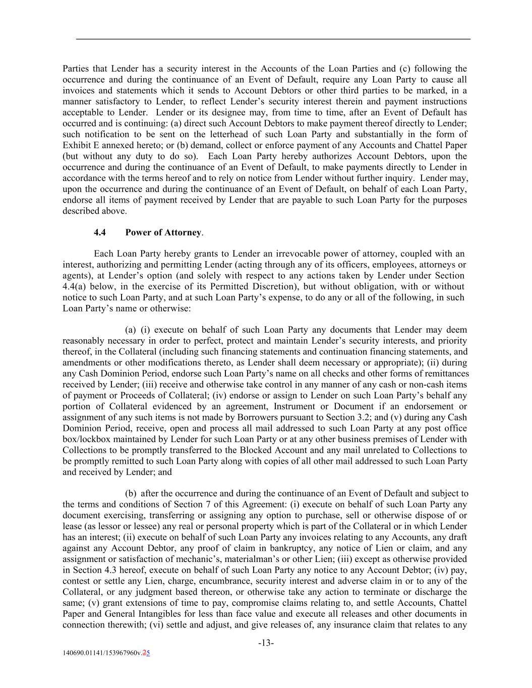 Parties that Lender has a security interest in the Accounts of the Loan Parties and (c) following the occurrence and during the continuance of an Event of Default, require any Loan Party to cause all invoices and statements which it sends to Account Debtors or other third parties to be marked, in a manner satisfactory to Lender, to reflect Lender’s security interest therein and payment instructions acceptable to Lender. Lender or its designee may, from time to time, after an Event of Default has occurred and is continuing: (a) direct such Account Debtors to make payment thereof directly to Lender; such notification to be sent on the letterhead of such Loan Party and substantially in the form of Exhibit E annexed hereto; or (b) demand, collect or enforce payment of any Accounts and Chattel Paper (but without any duty to do so). Each Loan Party hereby authorizes Account Debtors, upon the occurrence and during the continuance of an Event of Default, to make payments directly to Lender in accordance with the terms hereof and to rely on notice from Lender without further inquiry. Lender may, upon the occurrence and during the continuance of an Event of Default, on behalf of each Loan Party, endorse all items of payment received by Lender that are payable to such Loan Party for the purposes described above. 4.4 Power of Attorney. Each Loan Party hereby grants to Lender an irrevocable power of attorney, coupled with an interest, authorizing and permitting Lender (acting through any of its officers, employees, attorneys or agents), at Lender’s option (and solely with respect to any actions taken by Lender under Section 4.4(a) below, in the exercise of its Permitted Discretion), but without obligation, with or without notice to such Loan Party, and at such Loan Party’s expense, to do any or all of the following, in such Loan Party’s name or otherwise: (a) (i) execute on behalf of such Loan Party any documents that Lender may deem reasonably necessary in order to perfect, protect and maintain Lender’s security interests, and priority thereof, in the Collateral (including such financing statements and continuation financing statements, and amendments or other modifications thereto, as Lender shall deem necessary or appropriate); (ii) during any Cash Dominion Period, endorse such Loan Party’s name on all checks and other forms of remittances received by Lender; (iii) receive and otherwise take control in any manner of any cash or non-cash items of payment or Proceeds of Collateral; (iv) endorse or assign to Lender on such Loan Party’s behalf any portion of Collateral evidenced by an agreement, Instrument or Document if an endorsement or assignment of any such items is not made by Borrowers pursuant to Section 3.2; and (v) during any Cash Dominion Period, receive, open and process all mail addressed to such Loan Party at any post office box/lockbox maintained by Lender for such Loan Party or at any other business premises of Lender with Collections to be promptly transferred to the Blocked Account and any mail unrelated to Collections to be promptly remitted to such Loan Party along with copies of all other mail addressed to such Loan Party and received by Lender; and (b) after the occurrence and during the continuance of an Event of Default and subject to the terms and conditions of Section 7 of this Agreement: (i) execute on behalf of such Loan Party any document exercising, transferring or assigning any option to purchase, sell or otherwise dispose of or lease (as lessor or lessee) any real or personal property which is part of the Collateral or in which Lender has an interest; (ii) execute on behalf of such Loan Party any invoices relating to any Accounts, any draft against any Account Debtor, any proof of claim in bankruptcy, any notice of Lien or claim, and any assignment or satisfaction of mechanic’s, materialman’s or other Lien; (iii) except as otherwise provided in Section 4.3 hereof, execute on behalf of such Loan Party any notice to any Account Debtor; (iv) pay, contest or settle any Lien, charge, encumbrance, security interest and adverse claim in or to any of the Collateral, or any judgment based thereon, or otherwise take any action to terminate or discharge the same; (v) grant extensions of time to pay, compromise claims relating to, and settle Accounts, Chattel Paper and General Intangibles for less than face value and execute all releases and other documents in connection therewith; (vi) settle and adjust, and give releases of, any insurance claim that relates to any -13- 140690.01141/153967960v.25