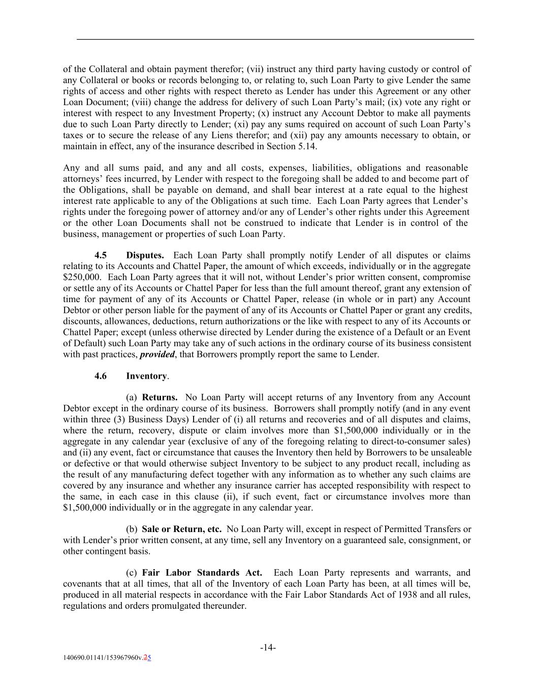 of the Collateral and obtain payment therefor; (vii) instruct any third party having custody or control of any Collateral or books or records belonging to, or relating to, such Loan Party to give Lender the same rights of access and other rights with respect thereto as Lender has under this Agreement or any other Loan Document; (viii) change the address for delivery of such Loan Party’s mail; (ix) vote any right or interest with respect to any Investment Property; (x) instruct any Account Debtor to make all payments due to such Loan Party directly to Lender; (xi) pay any sums required on account of such Loan Party’s taxes or to secure the release of any Liens therefor; and (xii) pay any amounts necessary to obtain, or maintain in effect, any of the insurance described in Section 5.14. Any and all sums paid, and any and all costs, expenses, liabilities, obligations and reasonable attorneys’ fees incurred, by Lender with respect to the foregoing shall be added to and become part of the Obligations, shall be payable on demand, and shall bear interest at a rate equal to the highest interest rate applicable to any of the Obligations at such time. Each Loan Party agrees that Lender’s rights under the foregoing power of attorney and/or any of Lender’s other rights under this Agreement or the other Loan Documents shall not be construed to indicate that Lender is in control of the business, management or properties of such Loan Party. 4.5 Disputes. Each Loan Party shall promptly notify Lender of all disputes or claims relating to its Accounts and Chattel Paper, the amount of which exceeds, individually or in the aggregate $250,000. Each Loan Party agrees that it will not, without Lender’s prior written consent, compromise or settle any of its Accounts or Chattel Paper for less than the full amount thereof, grant any extension of time for payment of any of its Accounts or Chattel Paper, release (in whole or in part) any Account Debtor or other person liable for the payment of any of its Accounts or Chattel Paper or grant any credits, discounts, allowances, deductions, return authorizations or the like with respect to any of its Accounts or Chattel Paper; except (unless otherwise directed by Lender during the existence of a Default or an Event of Default) such Loan Party may take any of such actions in the ordinary course of its business consistent with past practices, provided, that Borrowers promptly report the same to Lender. 4.6 Inventory. (a) Returns. No Loan Party will accept returns of any Inventory from any Account Debtor except in the ordinary course of its business. Borrowers shall promptly notify (and in any event within three (3) Business Days) Lender of (i) all returns and recoveries and of all disputes and claims, where the return, recovery, dispute or claim involves more than $1,500,000 individually or in the aggregate in any calendar year (exclusive of any of the foregoing relating to direct-to-consumer sales) and (ii) any event, fact or circumstance that causes the Inventory then held by Borrowers to be unsaleable or defective or that would otherwise subject Inventory to be subject to any product recall, including as the result of any manufacturing defect together with any information as to whether any such claims are covered by any insurance and whether any insurance carrier has accepted responsibility with respect to the same, in each case in this clause (ii), if such event, fact or circumstance involves more than $1,500,000 individually or in the aggregate in any calendar year. (b) Sale or Return, etc. No Loan Party will, except in respect of Permitted Transfers or with Lender’s prior written consent, at any time, sell any Inventory on a guaranteed sale, consignment, or other contingent basis. (c) Fair Labor Standards Act. Each Loan Party represents and warrants, and covenants that at all times, that all of the Inventory of each Loan Party has been, at all times will be, produced in all material respects in accordance with the Fair Labor Standards Act of 1938 and all rules, regulations and orders promulgated thereunder. -14- 140690.01141/153967960v.25