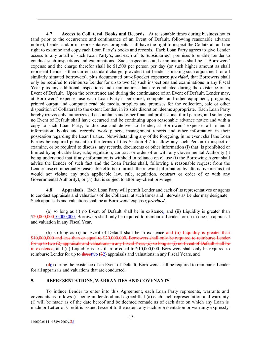 4.7 Access to Collateral, Books and Records. At reasonable times during business hours (and prior to the occurrence and continuance of an Event of Default, following reasonable advance notice), Lender and/or its representatives or agents shall have the right to inspect the Collateral, and the right to examine and copy each Loan Party’s books and records. Each Loan Party agrees to give Lender access to any or all of such Loan Party’s, and each of its Subsidiaries’, premises to enable Lender to conduct such inspections and examinations. Such inspections and examinations shall be at Borrowers’ expense and the charge therefor shall be $1,500 per person per day (or such higher amount as shall represent Lender’s then current standard charge, provided that Lender is making such adjustment for all similarly situated borrowers), plus documented out-of-pocket expenses; provided, that Borrowers shall only be required to reimburse Lender for up to two (2) such inspections and examinations in any Fiscal Year plus any additional inspections and examinations that are conducted during the existence of an Event of Default. Upon the occurrence and during the continuance of an Event of Default, Lender may, at Borrowers’ expense, use each Loan Party’s personnel, computer and other equipment, programs, printed output and computer readable media, supplies and premises for the collection, sale or other disposition of Collateral to the extent Lender, in its sole discretion, deems appropriate. Each Loan Party hereby irrevocably authorizes all accountants and other financial professional third parties, and so long as no Event of Default shall have occurred and be continuing upon reasonable advance notice and with a copy to such Loan Party, to disclose and deliver to Lender, at Borrowers’ expense, all financial information, books and records, work papers, management reports and other information in their possession regarding the Loan Parties. Notwithstanding any of the foregoing, in no event shall the Loan Parties be required pursuant to the terms of this Section 4.7 to allow any such Person to inspect or examine, or be required to discuss, any records, documents or other information (i) that is prohibited or limited by applicable law, rule, regulation, contract or order of or with any Governmental Authority (it being understood that if any information is withheld in reliance on clause (i) the Borrowing Agent shall advise the Lender of such fact and the Loan Parties shall, following a reasonable request from the Lender, use commercially reasonable efforts to furnish the relevant information by alternative means that would not violate any such applicable law, rule, regulation, contract or order of or with any Governmental Authority), or (ii) that is subject to attorney-client privilege. 4.8 Appraisals. Each Loan Party will permit Lender and each of its representatives or agents to conduct appraisals and valuations of the Collateral at such times and intervals as Lender may designate. Such appraisals and valuations shall be at Borrowers’ expense; provided, (a) so long as (i) no Event of Default shall be in existence, and (ii) Liquidity is greater than $20,000,00010,000,000, Borrowers shall only be required to reimburse Lender for up to one (1) appraisal and valuation in any Fiscal Year, (b) so long as (i) no Event of Default shall be in existence and (ii) Liquidity is greater than $10,000,000 and less than or equal to $20,000,000, Borrowers shall only be required to reimburse Lender for up to two (2) appraisals and valuations in any Fiscal Year, (c) so long as (i) no Event of Default shall be in existence, and (ii) Liquidity is less than or equal to $10,000,000, Borrowers shall only be required to reimburse Lender for up to threetwo (32) appraisals and valuations in any Fiscal Years, and (dc) during the existence of an Event of Default, Borrowers shall be required to reimburse Lender for all appraisals and valuations that are conducted. 5. REPRESENTATIONS, WARRANTIES AND COVENANTS. To induce Lender to enter into this Agreement, each Loan Party represents, warrants and covenants as follows (it being understood and agreed that (a) each such representation and warranty (i) will be made as of the date hereof and be deemed remade as of each date on which any Loan is made or Letter of Credit is issued (except to the extent any such representation or warranty expressly -15- 140690.01141/153967960v.25