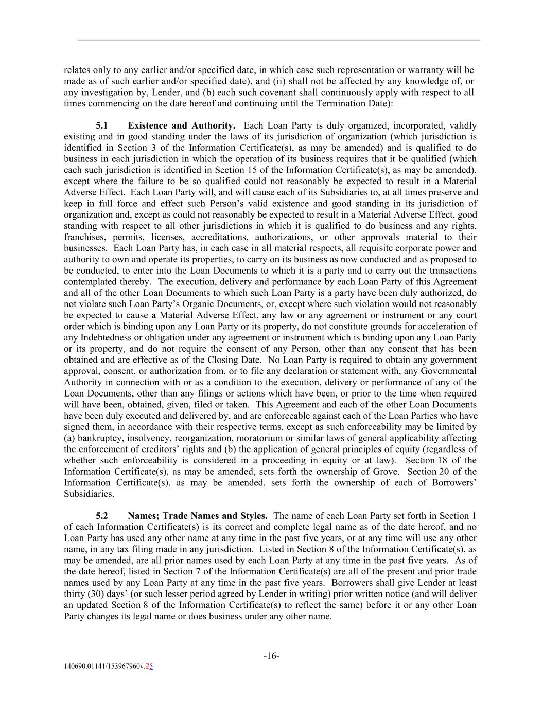 relates only to any earlier and/or specified date, in which case such representation or warranty will be made as of such earlier and/or specified date), and (ii) shall not be affected by any knowledge of, or any investigation by, Lender, and (b) each such covenant shall continuously apply with respect to all times commencing on the date hereof and continuing until the Termination Date): 5.1 Existence and Authority. Each Loan Party is duly organized, incorporated, validly existing and in good standing under the laws of its jurisdiction of organization (which jurisdiction is identified in Section 3 of the Information Certificate(s), as may be amended) and is qualified to do business in each jurisdiction in which the operation of its business requires that it be qualified (which each such jurisdiction is identified in Section 15 of the Information Certificate(s), as may be amended), except where the failure to be so qualified could not reasonably be expected to result in a Material Adverse Effect. Each Loan Party will, and will cause each of its Subsidiaries to, at all times preserve and keep in full force and effect such Person’s valid existence and good standing in its jurisdiction of organization and, except as could not reasonably be expected to result in a Material Adverse Effect, good standing with respect to all other jurisdictions in which it is qualified to do business and any rights, franchises, permits, licenses, accreditations, authorizations, or other approvals material to their businesses. Each Loan Party has, in each case in all material respects, all requisite corporate power and authority to own and operate its properties, to carry on its business as now conducted and as proposed to be conducted, to enter into the Loan Documents to which it is a party and to carry out the transactions contemplated thereby. The execution, delivery and performance by each Loan Party of this Agreement and all of the other Loan Documents to which such Loan Party is a party have been duly authorized, do not violate such Loan Party’s Organic Documents, or, except where such violation would not reasonably be expected to cause a Material Adverse Effect, any law or any agreement or instrument or any court order which is binding upon any Loan Party or its property, do not constitute grounds for acceleration of any Indebtedness or obligation under any agreement or instrument which is binding upon any Loan Party or its property, and do not require the consent of any Person, other than any consent that has been obtained and are effective as of the Closing Date. No Loan Party is required to obtain any government approval, consent, or authorization from, or to file any declaration or statement with, any Governmental Authority in connection with or as a condition to the execution, delivery or performance of any of the Loan Documents, other than any filings or actions which have been, or prior to the time when required will have been, obtained, given, filed or taken. This Agreement and each of the other Loan Documents have been duly executed and delivered by, and are enforceable against each of the Loan Parties who have signed them, in accordance with their respective terms, except as such enforceability may be limited by (a) bankruptcy, insolvency, reorganization, moratorium or similar laws of general applicability affecting the enforcement of creditors’ rights and (b) the application of general principles of equity (regardless of whether such enforceability is considered in a proceeding in equity or at law). Section 18 of the Information Certificate(s), as may be amended, sets forth the ownership of Grove. Section 20 of the Information Certificate(s), as may be amended, sets forth the ownership of each of Borrowers’ Subsidiaries. 5.2 Names; Trade Names and Styles. The name of each Loan Party set forth in Section 1 of each Information Certificate(s) is its correct and complete legal name as of the date hereof, and no Loan Party has used any other name at any time in the past five years, or at any time will use any other name, in any tax filing made in any jurisdiction. Listed in Section 8 of the Information Certificate(s), as may be amended, are all prior names used by each Loan Party at any time in the past five years. As of the date hereof, listed in Section 7 of the Information Certificate(s) are all of the present and prior trade names used by any Loan Party at any time in the past five years. Borrowers shall give Lender at least thirty (30) days’ (or such lesser period agreed by Lender in writing) prior written notice (and will deliver an updated Section 8 of the Information Certificate(s) to reflect the same) before it or any other Loan Party changes its legal name or does business under any other name. -16- 140690.01141/153967960v.25