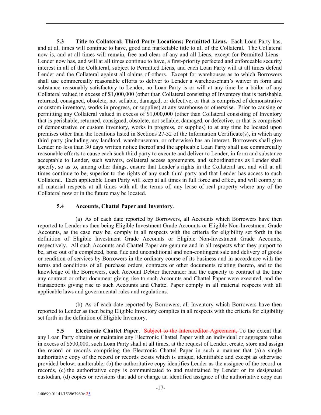 5.3 Title to Collateral; Third Party Locations; Permitted Liens. Each Loan Party has, and at all times will continue to have, good and marketable title to all of the Collateral. The Collateral now is, and at all times will remain, free and clear of any and all Liens, except for Permitted Liens. Lender now has, and will at all times continue to have, a first-priority perfected and enforceable security interest in all of the Collateral, subject to Permitted Liens, and each Loan Party will at all times defend Lender and the Collateral against all claims of others. Except for warehouses as to which Borrowers shall use commercially reasonable efforts to deliver to Lender a warehouseman’s waiver in form and substance reasonably satisfactory to Lender, no Loan Party is or will at any time be a bailor of any Collateral valued in excess of $1,000,000 (other than Collateral consisting of Inventory that is perishable, returned, consigned, obsolete, not sellable, damaged, or defective, or that is comprised of demonstrative or custom inventory, works in progress, or supplies) at any warehouse or otherwise. Prior to causing or permitting any Collateral valued in excess of $1,000,000 (other than Collateral consisting of Inventory that is perishable, returned, consigned, obsolete, not sellable, damaged, or defective, or that is comprised of demonstrative or custom inventory, works in progress, or supplies) to at any time be located upon premises other than the locations listed in Sections 27-32 of the Information Certificate(s), in which any third party (including any landlord, warehouseman, or otherwise) has an interest, Borrowers shall give Lender no less than 30 days written notice thereof and the applicable Loan Party shall use commercially reasonable efforts to cause each such third party to execute and deliver to Lender, in form and substance acceptable to Lender, such waivers, collateral access agreements, and subordinations as Lender shall specify, so as to, among other things, ensure that Lender’s rights in the Collateral are, and will at all times continue to be, superior to the rights of any such third party and that Lender has access to such Collateral. Each applicable Loan Party will keep at all times in full force and effect, and will comply in all material respects at all times with all the terms of, any lease of real property where any of the Collateral now or in the future may be located. 5.4 Accounts, Chattel Paper and Inventory. (a) As of each date reported by Borrowers, all Accounts which Borrowers have then reported to Lender as then being Eligible Investment Grade Accounts or Eligible Non-Investment Grade Accounts, as the case may be, comply in all respects with the criteria for eligibility set forth in the definition of Eligible Investment Grade Accounts or Eligible Non-Investment Grade Accounts, respectively. All such Accounts and Chattel Paper are genuine and in all respects what they purport to be, arise out of a completed, bona fide and unconditional and non-contingent sale and delivery of goods or rendition of services by Borrowers in the ordinary course of its business and in accordance with the terms and conditions of all purchase orders, contracts or other documents relating thereto, and to the knowledge of the Borrowers, each Account Debtor thereunder had the capacity to contract at the time any contract or other document giving rise to such Accounts and Chattel Paper were executed, and the transactions giving rise to such Accounts and Chattel Paper comply in all material respects with all applicable laws and governmental rules and regulations. (b) As of each date reported by Borrowers, all Inventory which Borrowers have then reported to Lender as then being Eligible Inventory complies in all respects with the criteria for eligibility set forth in the definition of Eligible Inventory. 5.5 Electronic Chattel Paper. Subject to the Intercreditor Agreement, To the extent that any Loan Party obtains or maintains any Electronic Chattel Paper with an individual or aggregate value in excess of $500,000, such Loan Party shall at all times, at the request of Lender, create, store and assign the record or records comprising the Electronic Chattel Paper in such a manner that (a) a single authoritative copy of the record or records exists which is unique, identifiable and except as otherwise provided below, unalterable, (b) the authoritative copy identifies Lender as the assignee of the record or records, (c) the authoritative copy is communicated to and maintained by Lender or its designated custodian, (d) copies or revisions that add or change an identified assignee of the authoritative copy can -17- 140690.01141/153967960v.25
