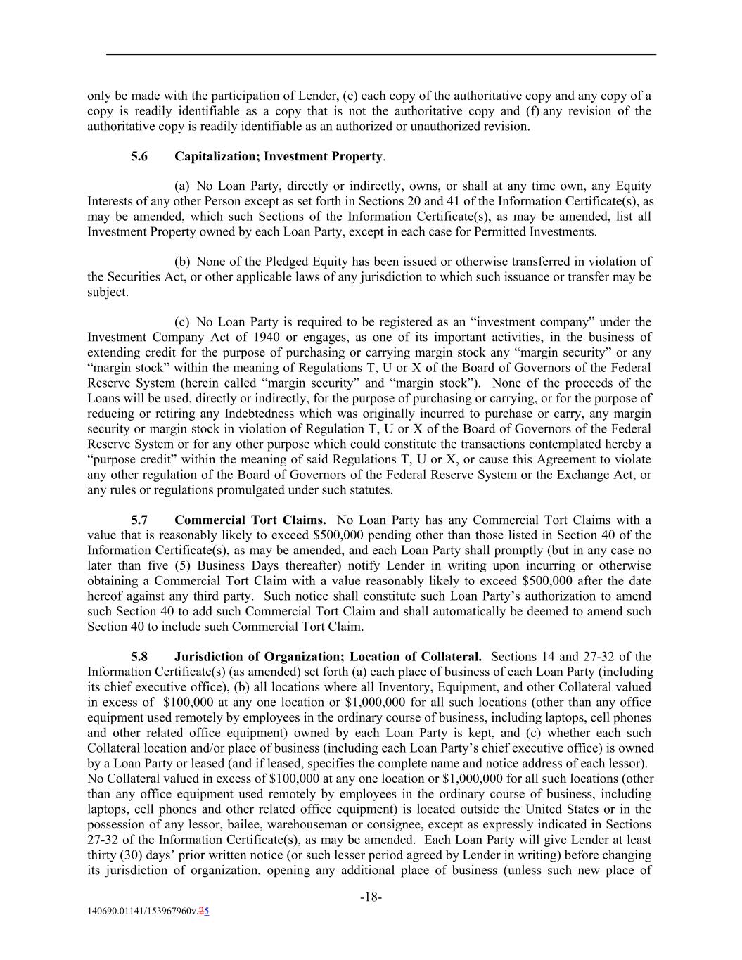 only be made with the participation of Lender, (e) each copy of the authoritative copy and any copy of a copy is readily identifiable as a copy that is not the authoritative copy and (f) any revision of the authoritative copy is readily identifiable as an authorized or unauthorized revision. 5.6 Capitalization; Investment Property. (a) No Loan Party, directly or indirectly, owns, or shall at any time own, any Equity Interests of any other Person except as set forth in Sections 20 and 41 of the Information Certificate(s), as may be amended, which such Sections of the Information Certificate(s), as may be amended, list all Investment Property owned by each Loan Party, except in each case for Permitted Investments. (b) None of the Pledged Equity has been issued or otherwise transferred in violation of the Securities Act, or other applicable laws of any jurisdiction to which such issuance or transfer may be subject. (c) No Loan Party is required to be registered as an “investment company” under the Investment Company Act of 1940 or engages, as one of its important activities, in the business of extending credit for the purpose of purchasing or carrying margin stock any “margin security” or any “margin stock” within the meaning of Regulations T, U or X of the Board of Governors of the Federal Reserve System (herein called “margin security” and “margin stock”). None of the proceeds of the Loans will be used, directly or indirectly, for the purpose of purchasing or carrying, or for the purpose of reducing or retiring any Indebtedness which was originally incurred to purchase or carry, any margin security or margin stock in violation of Regulation T, U or X of the Board of Governors of the Federal Reserve System or for any other purpose which could constitute the transactions contemplated hereby a “purpose credit” within the meaning of said Regulations T, U or X, or cause this Agreement to violate any other regulation of the Board of Governors of the Federal Reserve System or the Exchange Act, or any rules or regulations promulgated under such statutes. 5.7 Commercial Tort Claims. No Loan Party has any Commercial Tort Claims with a value that is reasonably likely to exceed $500,000 pending other than those listed in Section 40 of the Information Certificate(s), as may be amended, and each Loan Party shall promptly (but in any case no later than five (5) Business Days thereafter) notify Lender in writing upon incurring or otherwise obtaining a Commercial Tort Claim with a value reasonably likely to exceed $500,000 after the date hereof against any third party. Such notice shall constitute such Loan Party’s authorization to amend such Section 40 to add such Commercial Tort Claim and shall automatically be deemed to amend such Section 40 to include such Commercial Tort Claim. 5.8 Jurisdiction of Organization; Location of Collateral. Sections 14 and 27-32 of the Information Certificate(s) (as amended) set forth (a) each place of business of each Loan Party (including its chief executive office), (b) all locations where all Inventory, Equipment, and other Collateral valued in excess of $100,000 at any one location or $1,000,000 for all such locations (other than any office equipment used remotely by employees in the ordinary course of business, including laptops, cell phones and other related office equipment) owned by each Loan Party is kept, and (c) whether each such Collateral location and/or place of business (including each Loan Party’s chief executive office) is owned by a Loan Party or leased (and if leased, specifies the complete name and notice address of each lessor). No Collateral valued in excess of $100,000 at any one location or $1,000,000 for all such locations (other than any office equipment used remotely by employees in the ordinary course of business, including laptops, cell phones and other related office equipment) is located outside the United States or in the possession of any lessor, bailee, warehouseman or consignee, except as expressly indicated in Sections 27-32 of the Information Certificate(s), as may be amended. Each Loan Party will give Lender at least thirty (30) days’ prior written notice (or such lesser period agreed by Lender in writing) before changing its jurisdiction of organization, opening any additional place of business (unless such new place of -18- 140690.01141/153967960v.25