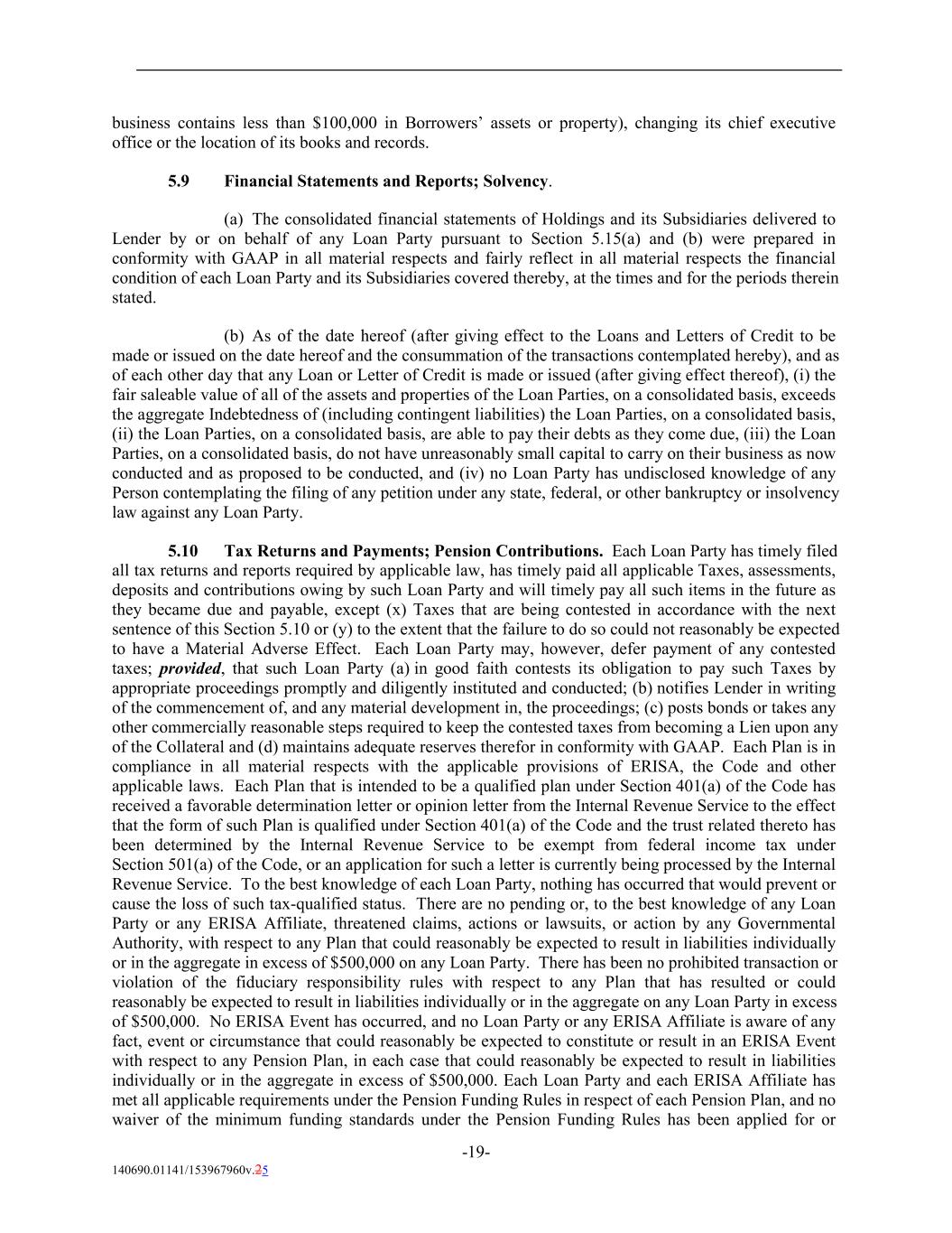 business contains less than $100,000 in Borrowers’ assets or property), changing its chief executive office or the location of its books and records. 5.9 Financial Statements and Reports; Solvency. (a) The consolidated financial statements of Holdings and its Subsidiaries delivered to Lender by or on behalf of any Loan Party pursuant to Section 5.15(a) and (b) were prepared in conformity with GAAP in all material respects and fairly reflect in all material respects the financial condition of each Loan Party and its Subsidiaries covered thereby, at the times and for the periods therein stated. (b) As of the date hereof (after giving effect to the Loans and Letters of Credit to be made or issued on the date hereof and the consummation of the transactions contemplated hereby), and as of each other day that any Loan or Letter of Credit is made or issued (after giving effect thereof), (i) the fair saleable value of all of the assets and properties of the Loan Parties, on a consolidated basis, exceeds the aggregate Indebtedness of (including contingent liabilities) the Loan Parties, on a consolidated basis, (ii) the Loan Parties, on a consolidated basis, are able to pay their debts as they come due, (iii) the Loan Parties, on a consolidated basis, do not have unreasonably small capital to carry on their business as now conducted and as proposed to be conducted, and (iv) no Loan Party has undisclosed knowledge of any Person contemplating the filing of any petition under any state, federal, or other bankruptcy or insolvency law against any Loan Party. 5.10 Tax Returns and Payments; Pension Contributions. Each Loan Party has timely filed all tax returns and reports required by applicable law, has timely paid all applicable Taxes, assessments, deposits and contributions owing by such Loan Party and will timely pay all such items in the future as they became due and payable, except (x) Taxes that are being contested in accordance with the next sentence of this Section 5.10 or (y) to the extent that the failure to do so could not reasonably be expected to have a Material Adverse Effect. Each Loan Party may, however, defer payment of any contested taxes; provided, that such Loan Party (a) in good faith contests its obligation to pay such Taxes by appropriate proceedings promptly and diligently instituted and conducted; (b) notifies Lender in writing of the commencement of, and any material development in, the proceedings; (c) posts bonds or takes any other commercially reasonable steps required to keep the contested taxes from becoming a Lien upon any of the Collateral and (d) maintains adequate reserves therefor in conformity with GAAP. Each Plan is in compliance in all material respects with the applicable provisions of ERISA, the Code and other applicable laws. Each Plan that is intended to be a qualified plan under Section 401(a) of the Code has received a favorable determination letter or opinion letter from the Internal Revenue Service to the effect that the form of such Plan is qualified under Section 401(a) of the Code and the trust related thereto has been determined by the Internal Revenue Service to be exempt from federal income tax under Section 501(a) of the Code, or an application for such a letter is currently being processed by the Internal Revenue Service. To the best knowledge of each Loan Party, nothing has occurred that would prevent or cause the loss of such tax-qualified status. There are no pending or, to the best knowledge of any Loan Party or any ERISA Affiliate, threatened claims, actions or lawsuits, or action by any Governmental Authority, with respect to any Plan that could reasonably be expected to result in liabilities individually or in the aggregate in excess of $500,000 on any Loan Party. There has been no prohibited transaction or violation of the fiduciary responsibility rules with respect to any Plan that has resulted or could reasonably be expected to result in liabilities individually or in the aggregate on any Loan Party in excess of $500,000. No ERISA Event has occurred, and no Loan Party or any ERISA Affiliate is aware of any fact, event or circumstance that could reasonably be expected to constitute or result in an ERISA Event with respect to any Pension Plan, in each case that could reasonably be expected to result in liabilities individually or in the aggregate in excess of $500,000. Each Loan Party and each ERISA Affiliate has met all applicable requirements under the Pension Funding Rules in respect of each Pension Plan, and no waiver of the minimum funding standards under the Pension Funding Rules has been applied for or -19- 140690.01141/153967960v.25