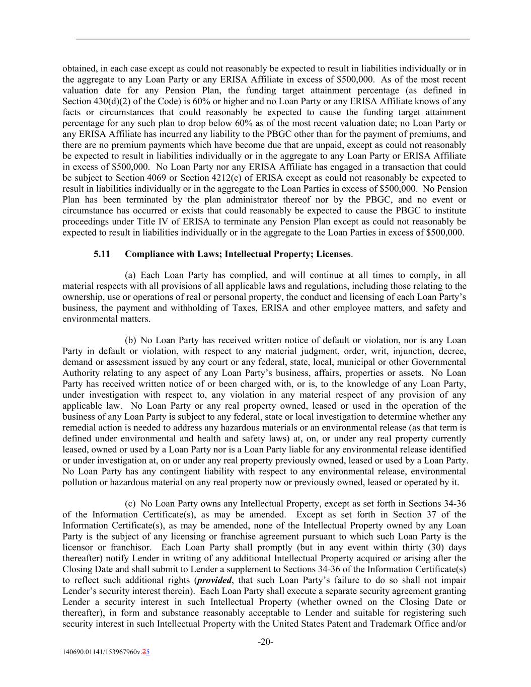 obtained, in each case except as could not reasonably be expected to result in liabilities individually or in the aggregate to any Loan Party or any ERISA Affiliate in excess of $500,000. As of the most recent valuation date for any Pension Plan, the funding target attainment percentage (as defined in Section 430(d)(2) of the Code) is 60% or higher and no Loan Party or any ERISA Affiliate knows of any facts or circumstances that could reasonably be expected to cause the funding target attainment percentage for any such plan to drop below 60% as of the most recent valuation date; no Loan Party or any ERISA Affiliate has incurred any liability to the PBGC other than for the payment of premiums, and there are no premium payments which have become due that are unpaid, except as could not reasonably be expected to result in liabilities individually or in the aggregate to any Loan Party or ERISA Affiliate in excess of $500,000. No Loan Party nor any ERISA Affiliate has engaged in a transaction that could be subject to Section 4069 or Section 4212(c) of ERISA except as could not reasonably be expected to result in liabilities individually or in the aggregate to the Loan Parties in excess of $500,000. No Pension Plan has been terminated by the plan administrator thereof nor by the PBGC, and no event or circumstance has occurred or exists that could reasonably be expected to cause the PBGC to institute proceedings under Title IV of ERISA to terminate any Pension Plan except as could not reasonably be expected to result in liabilities individually or in the aggregate to the Loan Parties in excess of $500,000. 5.11 Compliance with Laws; Intellectual Property; Licenses. (a) Each Loan Party has complied, and will continue at all times to comply, in all material respects with all provisions of all applicable laws and regulations, including those relating to the ownership, use or operations of real or personal property, the conduct and licensing of each Loan Party’s business, the payment and withholding of Taxes, ERISA and other employee matters, and safety and environmental matters. (b) No Loan Party has received written notice of default or violation, nor is any Loan Party in default or violation, with respect to any material judgment, order, writ, injunction, decree, demand or assessment issued by any court or any federal, state, local, municipal or other Governmental Authority relating to any aspect of any Loan Party’s business, affairs, properties or assets. No Loan Party has received written notice of or been charged with, or is, to the knowledge of any Loan Party, under investigation with respect to, any violation in any material respect of any provision of any applicable law. No Loan Party or any real property owned, leased or used in the operation of the business of any Loan Party is subject to any federal, state or local investigation to determine whether any remedial action is needed to address any hazardous materials or an environmental release (as that term is defined under environmental and health and safety laws) at, on, or under any real property currently leased, owned or used by a Loan Party nor is a Loan Party liable for any environmental release identified or under investigation at, on or under any real property previously owned, leased or used by a Loan Party. No Loan Party has any contingent liability with respect to any environmental release, environmental pollution or hazardous material on any real property now or previously owned, leased or operated by it. (c) No Loan Party owns any Intellectual Property, except as set forth in Sections 34-36 of the Information Certificate(s), as may be amended. Except as set forth in Section 37 of the Information Certificate(s), as may be amended, none of the Intellectual Property owned by any Loan Party is the subject of any licensing or franchise agreement pursuant to which such Loan Party is the licensor or franchisor. Each Loan Party shall promptly (but in any event within thirty (30) days thereafter) notify Lender in writing of any additional Intellectual Property acquired or arising after the Closing Date and shall submit to Lender a supplement to Sections 34-36 of the Information Certificate(s) to reflect such additional rights (provided, that such Loan Party’s failure to do so shall not impair Lender’s security interest therein). Each Loan Party shall execute a separate security agreement granting Lender a security interest in such Intellectual Property (whether owned on the Closing Date or thereafter), in form and substance reasonably acceptable to Lender and suitable for registering such security interest in such Intellectual Property with the United States Patent and Trademark Office and/or -20- 140690.01141/153967960v.25