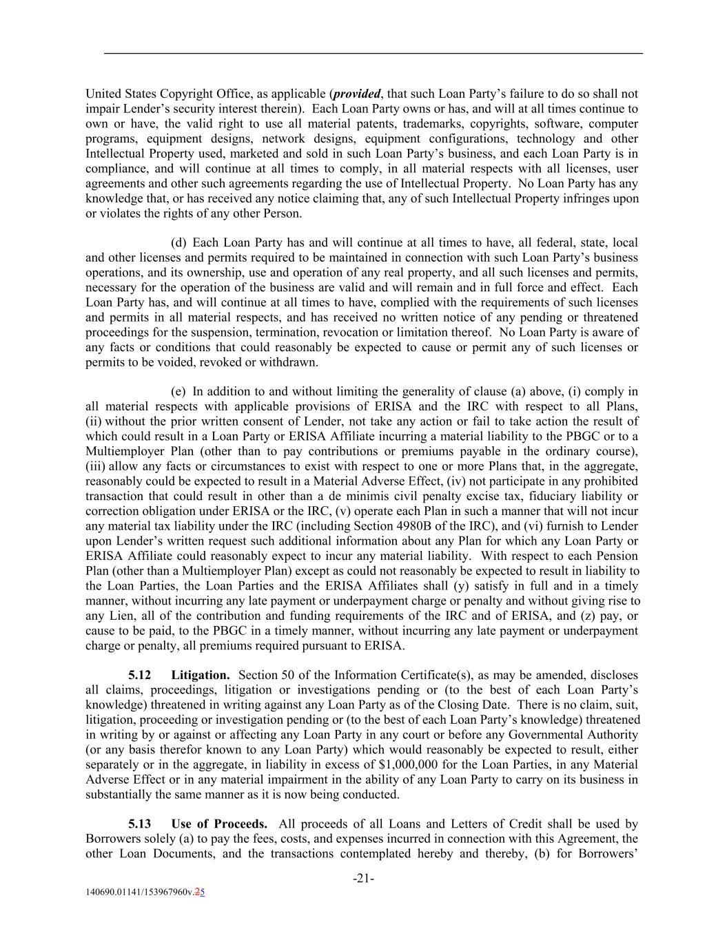 United States Copyright Office, as applicable (provided, that such Loan Party’s failure to do so shall not impair Lender’s security interest therein). Each Loan Party owns or has, and will at all times continue to own or have, the valid right to use all material patents, trademarks, copyrights, software, computer programs, equipment designs, network designs, equipment configurations, technology and other Intellectual Property used, marketed and sold in such Loan Party’s business, and each Loan Party is in compliance, and will continue at all times to comply, in all material respects with all licenses, user agreements and other such agreements regarding the use of Intellectual Property. No Loan Party has any knowledge that, or has received any notice claiming that, any of such Intellectual Property infringes upon or violates the rights of any other Person. (d) Each Loan Party has and will continue at all times to have, all federal, state, local and other licenses and permits required to be maintained in connection with such Loan Party’s business operations, and its ownership, use and operation of any real property, and all such licenses and permits, necessary for the operation of the business are valid and will remain and in full force and effect. Each Loan Party has, and will continue at all times to have, complied with the requirements of such licenses and permits in all material respects, and has received no written notice of any pending or threatened proceedings for the suspension, termination, revocation or limitation thereof. No Loan Party is aware of any facts or conditions that could reasonably be expected to cause or permit any of such licenses or permits to be voided, revoked or withdrawn. (e) In addition to and without limiting the generality of clause (a) above, (i) comply in all material respects with applicable provisions of ERISA and the IRC with respect to all Plans, (ii) without the prior written consent of Lender, not take any action or fail to take action the result of which could result in a Loan Party or ERISA Affiliate incurring a material liability to the PBGC or to a Multiemployer Plan (other than to pay contributions or premiums payable in the ordinary course), (iii) allow any facts or circumstances to exist with respect to one or more Plans that, in the aggregate, reasonably could be expected to result in a Material Adverse Effect, (iv) not participate in any prohibited transaction that could result in other than a de minimis civil penalty excise tax, fiduciary liability or correction obligation under ERISA or the IRC, (v) operate each Plan in such a manner that will not incur any material tax liability under the IRC (including Section 4980B of the IRC), and (vi) furnish to Lender upon Lender’s written request such additional information about any Plan for which any Loan Party or ERISA Affiliate could reasonably expect to incur any material liability. With respect to each Pension Plan (other than a Multiemployer Plan) except as could not reasonably be expected to result in liability to the Loan Parties, the Loan Parties and the ERISA Affiliates shall (y) satisfy in full and in a timely manner, without incurring any late payment or underpayment charge or penalty and without giving rise to any Lien, all of the contribution and funding requirements of the IRC and of ERISA, and (z) pay, or cause to be paid, to the PBGC in a timely manner, without incurring any late payment or underpayment charge or penalty, all premiums required pursuant to ERISA. 5.12 Litigation. Section 50 of the Information Certificate(s), as may be amended, discloses all claims, proceedings, litigation or investigations pending or (to the best of each Loan Party’s knowledge) threatened in writing against any Loan Party as of the Closing Date. There is no claim, suit, litigation, proceeding or investigation pending or (to the best of each Loan Party’s knowledge) threatened in writing by or against or affecting any Loan Party in any court or before any Governmental Authority (or any basis therefor known to any Loan Party) which would reasonably be expected to result, either separately or in the aggregate, in liability in excess of $1,000,000 for the Loan Parties, in any Material Adverse Effect or in any material impairment in the ability of any Loan Party to carry on its business in substantially the same manner as it is now being conducted. 5.13 Use of Proceeds. All proceeds of all Loans and Letters of Credit shall be used by Borrowers solely (a) to pay the fees, costs, and expenses incurred in connection with this Agreement, the other Loan Documents, and the transactions contemplated hereby and thereby, (b) for Borrowers’ -21- 140690.01141/153967960v.25