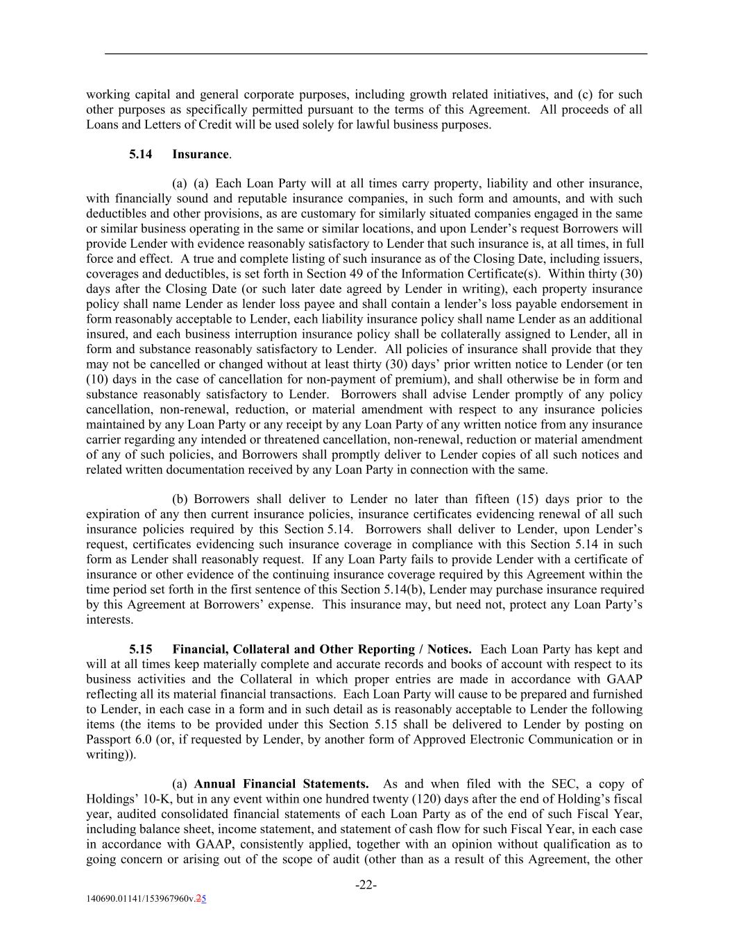 working capital and general corporate purposes, including growth related initiatives, and (c) for such other purposes as specifically permitted pursuant to the terms of this Agreement. All proceeds of all Loans and Letters of Credit will be used solely for lawful business purposes. 5.14 Insurance. (a) (a) Each Loan Party will at all times carry property, liability and other insurance, with financially sound and reputable insurance companies, in such form and amounts, and with such deductibles and other provisions, as are customary for similarly situated companies engaged in the same or similar business operating in the same or similar locations, and upon Lender’s request Borrowers will provide Lender with evidence reasonably satisfactory to Lender that such insurance is, at all times, in full force and effect. A true and complete listing of such insurance as of the Closing Date, including issuers, coverages and deductibles, is set forth in Section 49 of the Information Certificate(s). Within thirty (30) days after the Closing Date (or such later date agreed by Lender in writing), each property insurance policy shall name Lender as lender loss payee and shall contain a lender’s loss payable endorsement in form reasonably acceptable to Lender, each liability insurance policy shall name Lender as an additional insured, and each business interruption insurance policy shall be collaterally assigned to Lender, all in form and substance reasonably satisfactory to Lender. All policies of insurance shall provide that they may not be cancelled or changed without at least thirty (30) days’ prior written notice to Lender (or ten (10) days in the case of cancellation for non-payment of premium), and shall otherwise be in form and substance reasonably satisfactory to Lender. Borrowers shall advise Lender promptly of any policy cancellation, non-renewal, reduction, or material amendment with respect to any insurance policies maintained by any Loan Party or any receipt by any Loan Party of any written notice from any insurance carrier regarding any intended or threatened cancellation, non-renewal, reduction or material amendment of any of such policies, and Borrowers shall promptly deliver to Lender copies of all such notices and related written documentation received by any Loan Party in connection with the same. (b) Borrowers shall deliver to Lender no later than fifteen (15) days prior to the expiration of any then current insurance policies, insurance certificates evidencing renewal of all such insurance policies required by this Section 5.14. Borrowers shall deliver to Lender, upon Lender’s request, certificates evidencing such insurance coverage in compliance with this Section 5.14 in such form as Lender shall reasonably request. If any Loan Party fails to provide Lender with a certificate of insurance or other evidence of the continuing insurance coverage required by this Agreement within the time period set forth in the first sentence of this Section 5.14(b), Lender may purchase insurance required by this Agreement at Borrowers’ expense. This insurance may, but need not, protect any Loan Party’s interests. 5.15 Financial, Collateral and Other Reporting / Notices. Each Loan Party has kept and will at all times keep materially complete and accurate records and books of account with respect to its business activities and the Collateral in which proper entries are made in accordance with GAAP reflecting all its material financial transactions. Each Loan Party will cause to be prepared and furnished to Lender, in each case in a form and in such detail as is reasonably acceptable to Lender the following items (the items to be provided under this Section 5.15 shall be delivered to Lender by posting on Passport 6.0 (or, if requested by Lender, by another form of Approved Electronic Communication or in writing)). (a) Annual Financial Statements. As and when filed with the SEC, a copy of Holdings’ 10-K, but in any event within one hundred twenty (120) days after the end of Holding’s fiscal year, audited consolidated financial statements of each Loan Party as of the end of such Fiscal Year, including balance sheet, income statement, and statement of cash flow for such Fiscal Year, in each case in accordance with GAAP, consistently applied, together with an opinion without qualification as to going concern or arising out of the scope of audit (other than as a result of this Agreement, the other -22- 140690.01141/153967960v.25