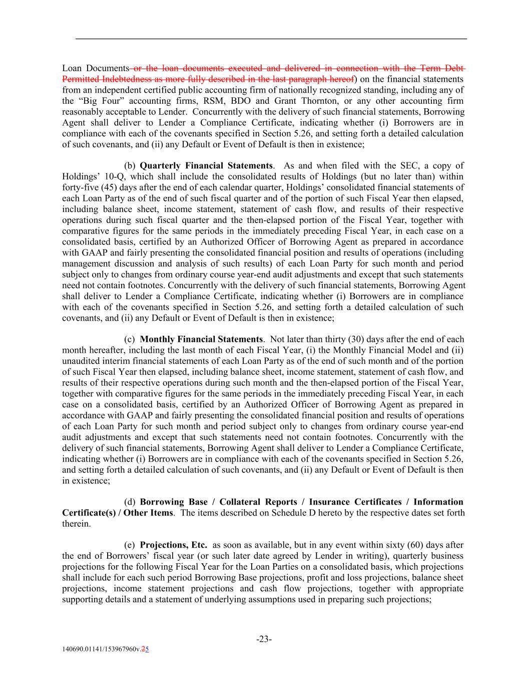Loan Documents or the loan documents executed and delivered in connection with the Term Debt Permitted Indebtedness as more fully described in the last paragraph hereof) on the financial statements from an independent certified public accounting firm of nationally recognized standing, including any of the “Big Four” accounting firms, RSM, BDO and Grant Thornton, or any other accounting firm reasonably acceptable to Lender. Concurrently with the delivery of such financial statements, Borrowing Agent shall deliver to Lender a Compliance Certificate, indicating whether (i) Borrowers are in compliance with each of the covenants specified in Section 5.26, and setting forth a detailed calculation of such covenants, and (ii) any Default or Event of Default is then in existence; (b) Quarterly Financial Statements. As and when filed with the SEC, a copy of Holdings’ 10-Q, which shall include the consolidated results of Holdings (but no later than) within forty-five (45) days after the end of each calendar quarter, Holdings’ consolidated financial statements of each Loan Party as of the end of such fiscal quarter and of the portion of such Fiscal Year then elapsed, including balance sheet, income statement, statement of cash flow, and results of their respective operations during such fiscal quarter and the then-elapsed portion of the Fiscal Year, together with comparative figures for the same periods in the immediately preceding Fiscal Year, in each case on a consolidated basis, certified by an Authorized Officer of Borrowing Agent as prepared in accordance with GAAP and fairly presenting the consolidated financial position and results of operations (including management discussion and analysis of such results) of each Loan Party for such month and period subject only to changes from ordinary course year-end audit adjustments and except that such statements need not contain footnotes. Concurrently with the delivery of such financial statements, Borrowing Agent shall deliver to Lender a Compliance Certificate, indicating whether (i) Borrowers are in compliance with each of the covenants specified in Section 5.26, and setting forth a detailed calculation of such covenants, and (ii) any Default or Event of Default is then in existence; (c) Monthly Financial Statements. Not later than thirty (30) days after the end of each month hereafter, including the last month of each Fiscal Year, (i) the Monthly Financial Model and (ii) unaudited interim financial statements of each Loan Party as of the end of such month and of the portion of such Fiscal Year then elapsed, including balance sheet, income statement, statement of cash flow, and results of their respective operations during such month and the then-elapsed portion of the Fiscal Year, together with comparative figures for the same periods in the immediately preceding Fiscal Year, in each case on a consolidated basis, certified by an Authorized Officer of Borrowing Agent as prepared in accordance with GAAP and fairly presenting the consolidated financial position and results of operations of each Loan Party for such month and period subject only to changes from ordinary course year-end audit adjustments and except that such statements need not contain footnotes. Concurrently with the delivery of such financial statements, Borrowing Agent shall deliver to Lender a Compliance Certificate, indicating whether (i) Borrowers are in compliance with each of the covenants specified in Section 5.26, and setting forth a detailed calculation of such covenants, and (ii) any Default or Event of Default is then in existence; (d) Borrowing Base / Collateral Reports / Insurance Certificates / Information Certificate(s) / Other Items. The items described on Schedule D hereto by the respective dates set forth therein. (e) Projections, Etc. as soon as available, but in any event within sixty (60) days after the end of Borrowers’ fiscal year (or such later date agreed by Lender in writing), quarterly business projections for the following Fiscal Year for the Loan Parties on a consolidated basis, which projections shall include for each such period Borrowing Base projections, profit and loss projections, balance sheet projections, income statement projections and cash flow projections, together with appropriate supporting details and a statement of underlying assumptions used in preparing such projections; -23- 140690.01141/153967960v.25