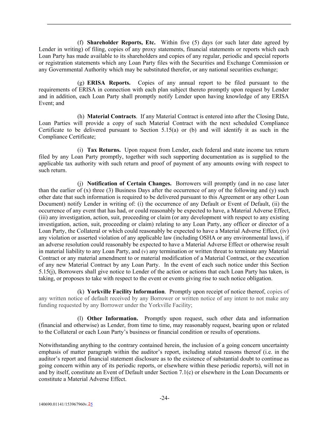 (f) Shareholder Reports, Etc. Within five (5) days (or such later date agreed by Lender in writing) of filing, copies of any proxy statements, financial statements or reports which each Loan Party has made available to its shareholders and copies of any regular, periodic and special reports or registration statements which any Loan Party files with the Securities and Exchange Commission or any Governmental Authority which may be substituted therefor, or any national securities exchange; (g) ERISA Reports. Copies of any annual report to be filed pursuant to the requirements of ERISA in connection with each plan subject thereto promptly upon request by Lender and in addition, each Loan Party shall promptly notify Lender upon having knowledge of any ERISA Event; and (h) Material Contracts. If any Material Contract is entered into after the Closing Date, Loan Parties will provide a copy of such Material Contract with the next scheduled Compliance Certificate to be delivered pursuant to Section 5.15(a) or (b) and will identify it as such in the Compliance Certificate; (i) Tax Returns. Upon request from Lender, each federal and state income tax return filed by any Loan Party promptly, together with such supporting documentation as is supplied to the applicable tax authority with such return and proof of payment of any amounts owing with respect to such return. (j) Notification of Certain Changes. Borrowers will promptly (and in no case later than the earlier of (x) three (3) Business Days after the occurrence of any of the following and (y) such other date that such information is required to be delivered pursuant to this Agreement or any other Loan Document) notify Lender in writing of: (i) the occurrence of any Default or Event of Default, (ii) the occurrence of any event that has had, or could reasonably be expected to have, a Material Adverse Effect, (iii) any investigation, action, suit, proceeding or claim (or any development with respect to any existing investigation, action, suit, proceeding or claim) relating to any Loan Party, any officer or director of a Loan Party, the Collateral or which could reasonably be expected to have a Material Adverse Effect, (iv) any violation or asserted violation of any applicable law (including OSHA or any environmental laws), if an adverse resolution could reasonably be expected to have a Material Adverse Effect or otherwise result in material liability to any Loan Party, and (v) any termination or written threat to terminate any Material Contract or any material amendment to or material modification of a Material Contract, or the execution of any new Material Contract by any Loan Party. In the event of each such notice under this Section 5.15(j), Borrowers shall give notice to Lender of the action or actions that each Loan Party has taken, is taking, or proposes to take with respect to the event or events giving rise to such notice obligation. (k) Yorkville Facility Information. Promptly upon receipt of notice thereof, copies of any written notice of default received by any Borrower or written notice of any intent to not make any funding requested by any Borrower under the Yorkville Facility; (l) Other Information. Promptly upon request, such other data and information (financial and otherwise) as Lender, from time to time, may reasonably request, bearing upon or related to the Collateral or each Loan Party’s business or financial condition or results of operations. Notwithstanding anything to the contrary contained herein, the inclusion of a going concern uncertainty emphasis of matter paragraph within the auditor’s report, including stated reasons thereof (i.e. in the auditor’s report and financial statement disclosure as to the existence of substantial doubt to continue as going concern within any of its periodic reports, or elsewhere within these periodic reports), will not in and by itself, constitute an Event of Default under Section 7.1(c) or elsewhere in the Loan Documents or constitute a Material Adverse Effect. -24- 140690.01141/153967960v.25