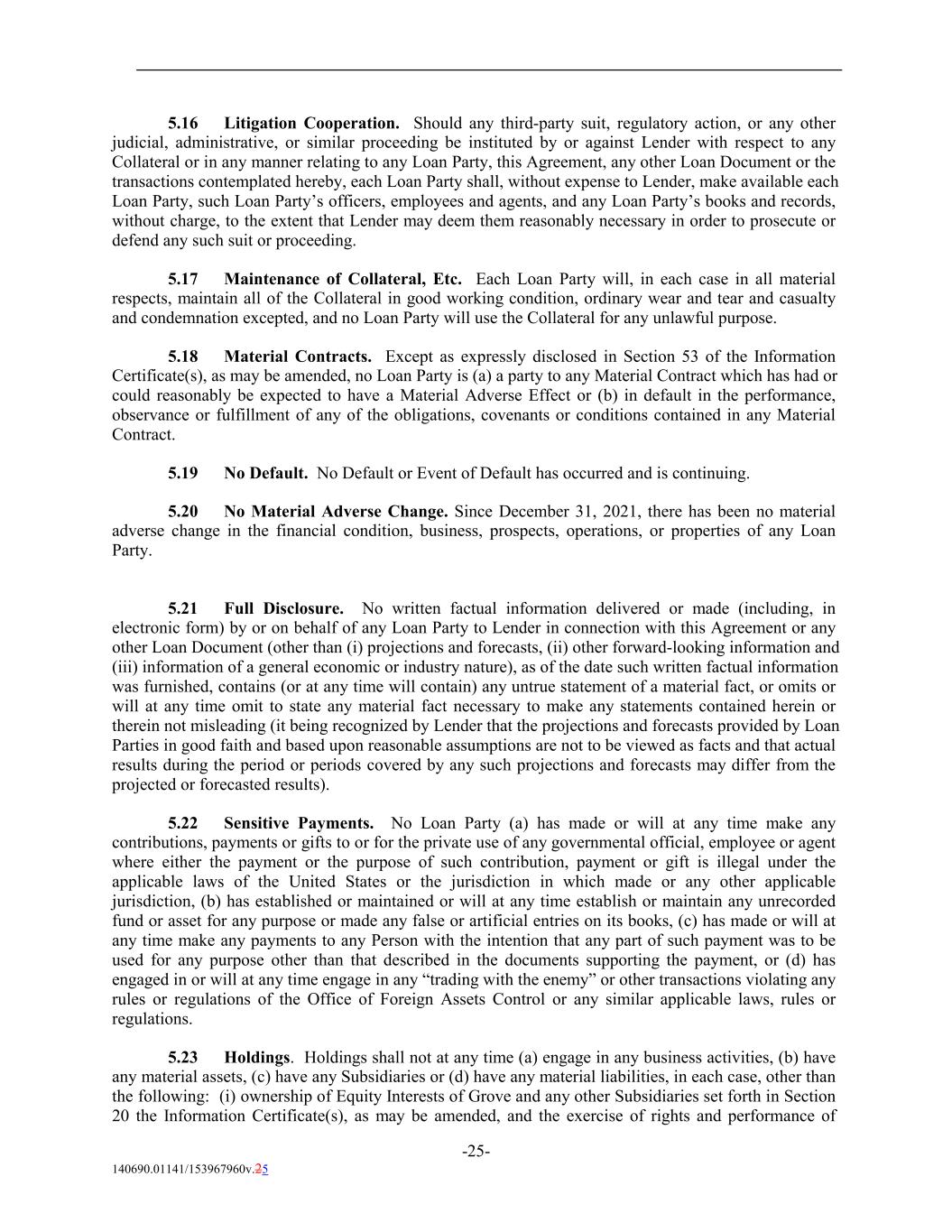 5.16 Litigation Cooperation. Should any third-party suit, regulatory action, or any other judicial, administrative, or similar proceeding be instituted by or against Lender with respect to any Collateral or in any manner relating to any Loan Party, this Agreement, any other Loan Document or the transactions contemplated hereby, each Loan Party shall, without expense to Lender, make available each Loan Party, such Loan Party’s officers, employees and agents, and any Loan Party’s books and records, without charge, to the extent that Lender may deem them reasonably necessary in order to prosecute or defend any such suit or proceeding. 5.17 Maintenance of Collateral, Etc. Each Loan Party will, in each case in all material respects, maintain all of the Collateral in good working condition, ordinary wear and tear and casualty and condemnation excepted, and no Loan Party will use the Collateral for any unlawful purpose. 5.18 Material Contracts. Except as expressly disclosed in Section 53 of the Information Certificate(s), as may be amended, no Loan Party is (a) a party to any Material Contract which has had or could reasonably be expected to have a Material Adverse Effect or (b) in default in the performance, observance or fulfillment of any of the obligations, covenants or conditions contained in any Material Contract. 5.19 No Default. No Default or Event of Default has occurred and is continuing. 5.20 No Material Adverse Change. Since December 31, 2021, there has been no material adverse change in the financial condition, business, prospects, operations, or properties of any Loan Party. 5.21 Full Disclosure. No written factual information delivered or made (including, in electronic form) by or on behalf of any Loan Party to Lender in connection with this Agreement or any other Loan Document (other than (i) projections and forecasts, (ii) other forward-looking information and (iii) information of a general economic or industry nature), as of the date such written factual information was furnished, contains (or at any time will contain) any untrue statement of a material fact, or omits or will at any time omit to state any material fact necessary to make any statements contained herein or therein not misleading (it being recognized by Lender that the projections and forecasts provided by Loan Parties in good faith and based upon reasonable assumptions are not to be viewed as facts and that actual results during the period or periods covered by any such projections and forecasts may differ from the projected or forecasted results). 5.22 Sensitive Payments. No Loan Party (a) has made or will at any time make any contributions, payments or gifts to or for the private use of any governmental official, employee or agent where either the payment or the purpose of such contribution, payment or gift is illegal under the applicable laws of the United States or the jurisdiction in which made or any other applicable jurisdiction, (b) has established or maintained or will at any time establish or maintain any unrecorded fund or asset for any purpose or made any false or artificial entries on its books, (c) has made or will at any time make any payments to any Person with the intention that any part of such payment was to be used for any purpose other than that described in the documents supporting the payment, or (d) has engaged in or will at any time engage in any “trading with the enemy” or other transactions violating any rules or regulations of the Office of Foreign Assets Control or any similar applicable laws, rules or regulations. 5.23 Holdings. Holdings shall not at any time (a) engage in any business activities, (b) have any material assets, (c) have any Subsidiaries or (d) have any material liabilities, in each case, other than the following: (i) ownership of Equity Interests of Grove and any other Subsidiaries set forth in Section 20 the Information Certificate(s), as may be amended, and the exercise of rights and performance of -25- 140690.01141/153967960v.25