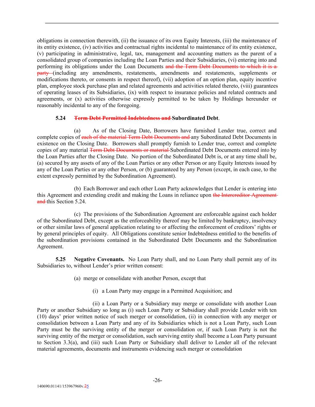 obligations in connection therewith, (ii) the issuance of its own Equity Interests, (iii) the maintenance of its entity existence, (iv) activities and contractual rights incidental to maintenance of its entity existence, (v) participating in administrative, legal, tax, management and accounting matters as the parent of a consolidated group of companies including the Loan Parties and their Subsidiaries, (vi) entering into and performing its obligations under the Loan Documents and the Term Debt Documents to which it is a party (including any amendments, restatements, amendments and restatements, supplements or modifications thereto, or consents in respect thereof), (vii) adoption of an option plan, equity incentive plan, employee stock purchase plan and related agreements and activities related thereto, (viii) guarantees of operating leases of its Subsidiaries, (ix) with respect to insurance policies and related contracts and agreements, or (x) activities otherwise expressly permitted to be taken by Holdings hereunder or reasonably incidental to any of the foregoing. 5.24 Term Debt Permitted Indebtedness and Subordinated Debt. (a) As of the Closing Date, Borrowers have furnished Lender true, correct and complete copies of each of the material Term Debt Documents and any Subordinated Debt Documents in existence on the Closing Date. Borrowers shall promptly furnish to Lender true, correct and complete copies of any material Term Debt Documents or material Subordinated Debt Documents entered into by the Loan Parties after the Closing Date. No portion of the Subordinated Debt is, or at any time shall be, (a) secured by any assets of any of the Loan Parties or any other Person or any Equity Interests issued by any of the Loan Parties or any other Person, or (b) guaranteed by any Person (except, in each case, to the extent expressly permitted by the Subordination Agreement). (b) Each Borrower and each other Loan Party acknowledges that Lender is entering into this Agreement and extending credit and making the Loans in reliance upon the Intercreditor Agreement and this Section 5.24. (c) The provisions of the Subordination Agreement are enforceable against each holder of the Subordinated Debt, except as the enforceability thereof may be limited by bankruptcy, insolvency or other similar laws of general application relating to or affecting the enforcement of creditors’ rights or by general principles of equity. All Obligations constitute senior Indebtedness entitled to the benefits of the subordination provisions contained in the Subordinated Debt Documents and the Subordination Agreement. 5.25 Negative Covenants. No Loan Party shall, and no Loan Party shall permit any of its Subsidiaries to, without Lender’s prior written consent: (a) merge or consolidate with another Person, except that (i) a Loan Party may engage in a Permitted Acquisition; and (ii) a Loan Party or a Subsidiary may merge or consolidate with another Loan Party or another Subsidiary so long as (i) such Loan Party or Subsidiary shall provide Lender with ten (10) days’ prior written notice of such merger or consolidation, (ii) in connection with any merger or consolidation between a Loan Party and any of its Subsidiaries which is not a Loan Party, such Loan Party must be the surviving entity of the merger or consolidation or, if such Loan Party is not the surviving entity of the merger or consolidation, such surviving entity shall become a Loan Party pursuant to Section 3.3(a), and (iii) such Loan Party or Subsidiary shall deliver to Lender all of the relevant material agreements, documents and instruments evidencing such merger or consolidation -26- 140690.01141/153967960v.25