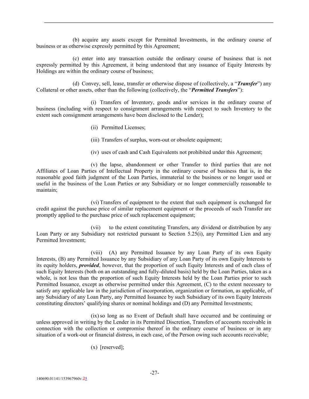 (b) acquire any assets except for Permitted Investments, in the ordinary course of business or as otherwise expressly permitted by this Agreement; (c) enter into any transaction outside the ordinary course of business that is not expressly permitted by this Agreement, it being understood that any issuance of Equity Interests by Holdings are within the ordinary course of business; (d) Convey, sell, lease, transfer or otherwise dispose of (collectively, a “Transfer”) any Collateral or other assets, other than the following (collectively, the “Permitted Transfers”): (i) Transfers of Inventory, goods and/or services in the ordinary course of business (including with respect to consignment arrangements with respect to such Inventory to the extent such consignment arrangements have been disclosed to the Lender); (ii) Permitted Licenses; (iii) Transfers of surplus, worn-out or obsolete equipment; (iv) uses of cash and Cash Equivalents not prohibited under this Agreement; (v) the lapse, abandonment or other Transfer to third parties that are not Affiliates of Loan Parties of Intellectual Property in the ordinary course of business that is, in the reasonable good faith judgment of the Loan Parties, immaterial to the business or no longer used or useful in the business of the Loan Parties or any Subsidiary or no longer commercially reasonable to maintain; (vi) Transfers of equipment to the extent that such equipment is exchanged for credit against the purchase price of similar replacement equipment or the proceeds of such Transfer are promptly applied to the purchase price of such replacement equipment; (vii) to the extent constituting Transfers, any dividend or distribution by any Loan Party or any Subsidiary not restricted pursuant to Section 5.25(i), any Permitted Lien and any Permitted Investment; (viii) (A) any Permitted Issuance by any Loan Party of its own Equity Interests, (B) any Permitted Issuance by any Subsidiary of any Loan Party of its own Equity Interests to its equity holders, provided, however, that the proportion of such Equity Interests and of each class of such Equity Interests (both on an outstanding and fully-diluted basis) held by the Loan Parties, taken as a whole, is not less than the proportion of such Equity Interests held by the Loan Parties prior to such Permitted Issuance, except as otherwise permitted under this Agreement, (C) to the extent necessary to satisfy any applicable law in the jurisdiction of incorporation, organization or formation, as applicable, of any Subsidiary of any Loan Party, any Permitted Issuance by such Subsidiary of its own Equity Interests constituting directors’ qualifying shares or nominal holdings and (D) any Permitted Investments; (ix) so long as no Event of Default shall have occurred and be continuing or unless approved in writing by the Lender in its Permitted Discretion, Transfers of accounts receivable in connection with the collection or compromise thereof in the ordinary course of business or in any situation of a work-out or financial distress, in each case, of the Person owing such accounts receivable; (x) [reserved]; -27- 140690.01141/153967960v.25