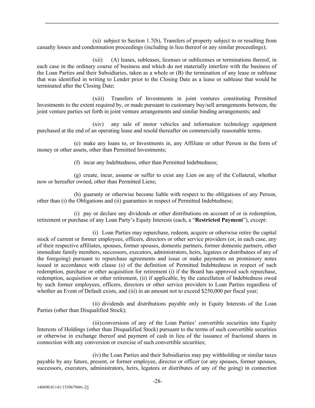 (xi) subject to Section 1.7(b), Transfers of property subject to or resulting from casualty losses and condemnation proceedings (including in lieu thereof or any similar proceedings); (xii) (A) leases, subleases, licenses or sublicenses or terminations thereof, in each case in the ordinary course of business and which do not materially interfere with the business of the Loan Parties and their Subsidiaries, taken as a whole or (B) the termination of any lease or sublease that was identified in writing to Lender prior to the Closing Date as a lease or sublease that would be terminated after the Closing Date; (xiii) Transfers of Investments in joint ventures constituting Permitted Investments to the extent required by, or made pursuant to customary buy/sell arrangements between, the joint venture parties set forth in joint venture arrangements and similar binding arrangements; and (xiv) any sale of motor vehicles and information technology equipment purchased at the end of an operating lease and resold thereafter on commercially reasonable terms. (e) make any loans to, or Investments in, any Affiliate or other Person in the form of money or other assets, other than Permitted Investments; (f) incur any Indebtedness, other than Permitted Indebtedness; (g) create, incur, assume or suffer to exist any Lien on any of the Collateral, whether now or hereafter owned, other than Permitted Liens; (h) guaranty or otherwise become liable with respect to the obligations of any Person, other than (i) the Obligations and (ii) guarantees in respect of Permitted Indebtedness; (i) pay or declare any dividends or other distributions on account of or in redemption, retirement or purchase of any Loan Party’s Equity Interests (each, a “Restricted Payment”), except: (i) Loan Parties may repurchase, redeem, acquire or otherwise retire the capital stock of current or former employees, officers, directors or other service providers (or, in each case, any of their respective affiliates, spouses, former spouses, domestic partners, former domestic partners, other immediate family members, successors, executors, administrators, heirs, legatees or distributees of any of the foregoing) pursuant to repurchase agreements and issue or make payments on promissory notes issued in accordance with clause (s) of the definition of Permitted Indebtedness in respect of such redemption, purchase or other acquisition for retirement (i) if the Board has approved such repurchase, redemption, acquisition or other retirement, (ii) if applicable, by the cancellation of Indebtedness owed by such former employees, officers, directors or other service providers to Loan Parties regardless of whether an Event of Default exists, and (iii) in an amount not to exceed $250,000 per fiscal year; (ii) dividends and distributions payable only in Equity Interests of the Loan Parties (other than Disqualified Stock); (iii)conversions of any of the Loan Parties’ convertible securities into Equity Interests of Holdings (other than Disqualified Stock) pursuant to the terms of such convertible securities or otherwise in exchange thereof and payment of cash in lieu of the issuance of fractional shares in connection with any conversion or exercise of such convertible securities; (iv) the Loan Parties and their Subsidiaries may pay withholding or similar taxes payable by any future, present, or former employee, director or officer (or any spouses, former spouses, successors, executors, administrators, heirs, legatees or distributes of any of the going) in connection -28- 140690.01141/153967960v.25