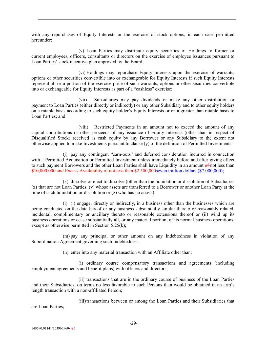 with any repurchases of Equity Interests or the exercise of stock options, in each case permitted hereunder; (v) Loan Parties may distribute equity securities of Holdings to former or current employees, officers, consultants or directors on the exercise of employee issuances pursuant to Loan Parties’ stock incentive plan approved by the Board; (vi) Holdings may repurchase Equity Interests upon the exercise of warrants, options or other securities convertible into or exchangeable for Equity Interests if such Equity Interests represent all or a portion of the exercise price of such warrants, options or other securities convertible into or exchangeable for Equity Interests as part of a “cashless” exercise; (vii) Subsidiaries may pay dividends or make any other distribution or payment to Loan Parties (either directly or indirectly) or any other Subsidiary and to other equity holders on a ratable basis according to such equity holder’s Equity Interests or on a greater than ratable basis to Loan Parties; and (viii) Restricted Payments in an amount not to exceed the amount of any capital contributions or other proceeds of any issuance of Equity Interests (other than in respect of Disqualified Stock) received as cash equity by any Borrower or any Subsidiary to the extent not otherwise applied to make Investments pursuant to clause (y) of the definition of Permitted Investments. (j) pay any contingent “earn-outs” and deferred consideration incurred in connection with a Permitted Acquisition or Permitted Investment unless immediately before and after giving effect to such payment Borrowers and the other Loan Parties shall have Liquidity in an amount of not less than $10,000,000 and Excess Availability of not less than $2,500,000seven million dollars ($7,000,000); (k) dissolve or elect to dissolve (other than the liquidation or dissolution of Subsidiaries (x) that are not Loan Parties, (y) whose assets are transferred to a Borrower or another Loan Party at the time of such liquidation or dissolution or (z) who has no assets); (l) (i) engage, directly or indirectly, in a business other than the businesses which are being conducted on the date hereof or any business substantially similar thereto or reasonably related, incidental, complimentary or ancillary thereto or reasonable extensions thereof or (ii) wind up its business operations or cease substantially all, or any material portion, of its normal business operations, except as otherwise permitted in Section 5.25(k); (m) pay any principal or other amount on any Indebtedness in violation of any Subordination Agreement governing such Indebtedness; (n) enter into any material transaction with an Affiliate other than: (i) ordinary course compensatory transactions and agreements (including employment agreements and benefit plans) with officers and directors; (ii) transactions that are in the ordinary course of business of the Loan Parties and their Subsidiaries, on terms no less favorable to such Persons than would be obtained in an arm’s length transaction with a non-affiliated Person; (iii) transactions between or among the Loan Parties and their Subsidiaries that are Loan Parties; -29- 140690.01141/153967960v.25