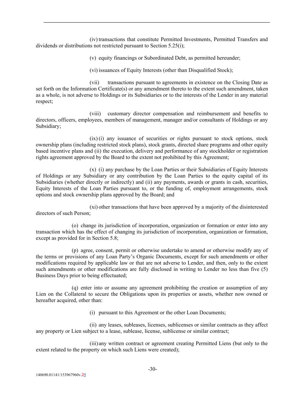 (iv) transactions that constitute Permitted Investments, Permitted Transfers and dividends or distributions not restricted pursuant to Section 5.25(i); (v) equity financings or Subordinated Debt, as permitted hereunder; (vi) issuances of Equity Interests (other than Disqualified Stock); (vii) transactions pursuant to agreements in existence on the Closing Date as set forth on the Information Certificate(s) or any amendment thereto to the extent such amendment, taken as a whole, is not adverse to Holdings or its Subsidiaries or to the interests of the Lender in any material respect; (viii) customary director compensation and reimbursement and benefits to directors, officers, employees, members of management, manager and/or consultants of Holdings or any Subsidiary; (ix) (i) any issuance of securities or rights pursuant to stock options, stock ownership plans (including restricted stock plans), stock grants, directed share programs and other equity based incentive plans and (ii) the execution, delivery and performance of any stockholder or registration rights agreement approved by the Board to the extent not prohibited by this Agreement; (x) (i) any purchase by the Loan Parties or their Subsidiaries of Equity Interests of Holdings or any Subsidiary or any contribution by the Loan Parties to the equity capital of its Subsidiaries (whether directly or indirectly) and (ii) any payments, awards or grants in cash, securities, Equity Interests of the Loan Parties pursuant to, or the funding of, employment arrangements, stock options and stock ownership plans approved by the Board; and (xi) other transactions that have been approved by a majority of the disinterested directors of such Person; (o) change its jurisdiction of incorporation, organization or formation or enter into any transaction which has the effect of changing its jurisdiction of incorporation, organization or formation, except as provided for in Section 5.8; (p) agree, consent, permit or otherwise undertake to amend or otherwise modify any of the terms or provisions of any Loan Party’s Organic Documents, except for such amendments or other modifications required by applicable law or that are not adverse to Lender, and then, only to the extent such amendments or other modifications are fully disclosed in writing to Lender no less than five (5) Business Days prior to being effectuated; (q) enter into or assume any agreement prohibiting the creation or assumption of any Lien on the Collateral to secure the Obligations upon its properties or assets, whether now owned or hereafter acquired, other than: (i) pursuant to this Agreement or the other Loan Documents; (ii) any leases, subleases, licenses, sublicenses or similar contracts as they affect any property or Lien subject to a lease, sublease, license, sublicense or similar contract; (iii)any written contract or agreement creating Permitted Liens (but only to the extent related to the property on which such Liens were created); -30- 140690.01141/153967960v.25