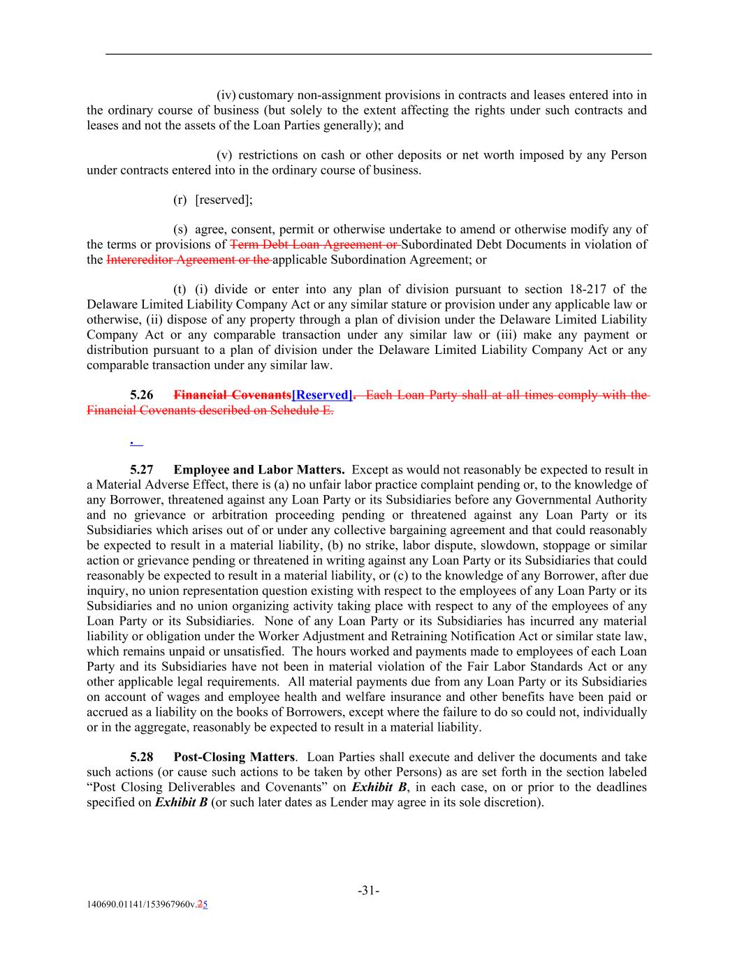 (iv) customary non-assignment provisions in contracts and leases entered into in the ordinary course of business (but solely to the extent affecting the rights under such contracts and leases and not the assets of the Loan Parties generally); and (v) restrictions on cash or other deposits or net worth imposed by any Person under contracts entered into in the ordinary course of business. (r) [reserved]; (s) agree, consent, permit or otherwise undertake to amend or otherwise modify any of the terms or provisions of Term Debt Loan Agreement or Subordinated Debt Documents in violation of the Intercreditor Agreement or the applicable Subordination Agreement; or (t) (i) divide or enter into any plan of division pursuant to section 18-217 of the Delaware Limited Liability Company Act or any similar stature or provision under any applicable law or otherwise, (ii) dispose of any property through a plan of division under the Delaware Limited Liability Company Act or any comparable transaction under any similar law or (iii) make any payment or distribution pursuant to a plan of division under the Delaware Limited Liability Company Act or any comparable transaction under any similar law. 5.26 Financial Covenants[Reserved]. Each Loan Party shall at all times comply with the Financial Covenants described on Schedule E. . 5.27 Employee and Labor Matters. Except as would not reasonably be expected to result in a Material Adverse Effect, there is (a) no unfair labor practice complaint pending or, to the knowledge of any Borrower, threatened against any Loan Party or its Subsidiaries before any Governmental Authority and no grievance or arbitration proceeding pending or threatened against any Loan Party or its Subsidiaries which arises out of or under any collective bargaining agreement and that could reasonably be expected to result in a material liability, (b) no strike, labor dispute, slowdown, stoppage or similar action or grievance pending or threatened in writing against any Loan Party or its Subsidiaries that could reasonably be expected to result in a material liability, or (c) to the knowledge of any Borrower, after due inquiry, no union representation question existing with respect to the employees of any Loan Party or its Subsidiaries and no union organizing activity taking place with respect to any of the employees of any Loan Party or its Subsidiaries. None of any Loan Party or its Subsidiaries has incurred any material liability or obligation under the Worker Adjustment and Retraining Notification Act or similar state law, which remains unpaid or unsatisfied. The hours worked and payments made to employees of each Loan Party and its Subsidiaries have not been in material violation of the Fair Labor Standards Act or any other applicable legal requirements. All material payments due from any Loan Party or its Subsidiaries on account of wages and employee health and welfare insurance and other benefits have been paid or accrued as a liability on the books of Borrowers, except where the failure to do so could not, individually or in the aggregate, reasonably be expected to result in a material liability. 5.28 Post-Closing Matters. Loan Parties shall execute and deliver the documents and take such actions (or cause such actions to be taken by other Persons) as are set forth in the section labeled “Post Closing Deliverables and Covenants” on Exhibit B, in each case, on or prior to the deadlines specified on Exhibit B (or such later dates as Lender may agree in its sole discretion). -31- 140690.01141/153967960v.25