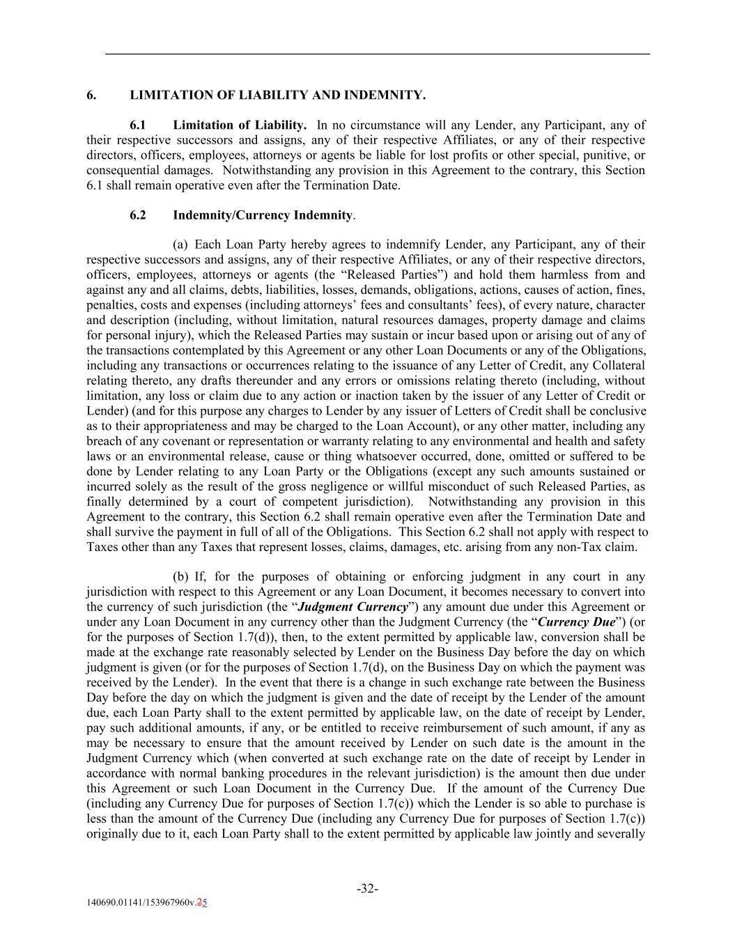 6. LIMITATION OF LIABILITY AND INDEMNITY. 6.1 Limitation of Liability. In no circumstance will any Lender, any Participant, any of their respective successors and assigns, any of their respective Affiliates, or any of their respective directors, officers, employees, attorneys or agents be liable for lost profits or other special, punitive, or consequential damages. Notwithstanding any provision in this Agreement to the contrary, this Section 6.1 shall remain operative even after the Termination Date. 6.2 Indemnity/Currency Indemnity. (a) Each Loan Party hereby agrees to indemnify Lender, any Participant, any of their respective successors and assigns, any of their respective Affiliates, or any of their respective directors, officers, employees, attorneys or agents (the “Released Parties”) and hold them harmless from and against any and all claims, debts, liabilities, losses, demands, obligations, actions, causes of action, fines, penalties, costs and expenses (including attorneys’ fees and consultants’ fees), of every nature, character and description (including, without limitation, natural resources damages, property damage and claims for personal injury), which the Released Parties may sustain or incur based upon or arising out of any of the transactions contemplated by this Agreement or any other Loan Documents or any of the Obligations, including any transactions or occurrences relating to the issuance of any Letter of Credit, any Collateral relating thereto, any drafts thereunder and any errors or omissions relating thereto (including, without limitation, any loss or claim due to any action or inaction taken by the issuer of any Letter of Credit or Lender) (and for this purpose any charges to Lender by any issuer of Letters of Credit shall be conclusive as to their appropriateness and may be charged to the Loan Account), or any other matter, including any breach of any covenant or representation or warranty relating to any environmental and health and safety laws or an environmental release, cause or thing whatsoever occurred, done, omitted or suffered to be done by Lender relating to any Loan Party or the Obligations (except any such amounts sustained or incurred solely as the result of the gross negligence or willful misconduct of such Released Parties, as finally determined by a court of competent jurisdiction). Notwithstanding any provision in this Agreement to the contrary, this Section 6.2 shall remain operative even after the Termination Date and shall survive the payment in full of all of the Obligations. This Section 6.2 shall not apply with respect to Taxes other than any Taxes that represent losses, claims, damages, etc. arising from any non-Tax claim. (b) If, for the purposes of obtaining or enforcing judgment in any court in any jurisdiction with respect to this Agreement or any Loan Document, it becomes necessary to convert into the currency of such jurisdiction (the “Judgment Currency”) any amount due under this Agreement or under any Loan Document in any currency other than the Judgment Currency (the “Currency Due”) (or for the purposes of Section 1.7(d)), then, to the extent permitted by applicable law, conversion shall be made at the exchange rate reasonably selected by Lender on the Business Day before the day on which judgment is given (or for the purposes of Section 1.7(d), on the Business Day on which the payment was received by the Lender). In the event that there is a change in such exchange rate between the Business Day before the day on which the judgment is given and the date of receipt by the Lender of the amount due, each Loan Party shall to the extent permitted by applicable law, on the date of receipt by Lender, pay such additional amounts, if any, or be entitled to receive reimbursement of such amount, if any as may be necessary to ensure that the amount received by Lender on such date is the amount in the Judgment Currency which (when converted at such exchange rate on the date of receipt by Lender in accordance with normal banking procedures in the relevant jurisdiction) is the amount then due under this Agreement or such Loan Document in the Currency Due. If the amount of the Currency Due (including any Currency Due for purposes of Section 1.7(c)) which the Lender is so able to purchase is less than the amount of the Currency Due (including any Currency Due for purposes of Section 1.7(c)) originally due to it, each Loan Party shall to the extent permitted by applicable law jointly and severally -32- 140690.01141/153967960v.25